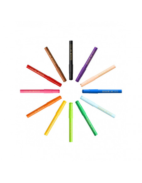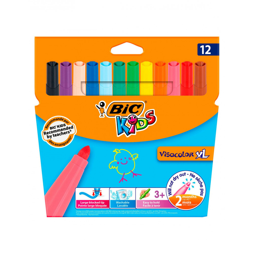 Etui met 12 dikke BIC viltstiften. De stift heeft een brede grip en daardoor ideaal voor kleine kinderen. De brede geblokkeerde punt kan niet ingedrukt worden en droogt niet uit. De stift kan tot twee maanden zonder dop. De inkt op waterbasis is gemakkelijk af- en uitwasbaar.