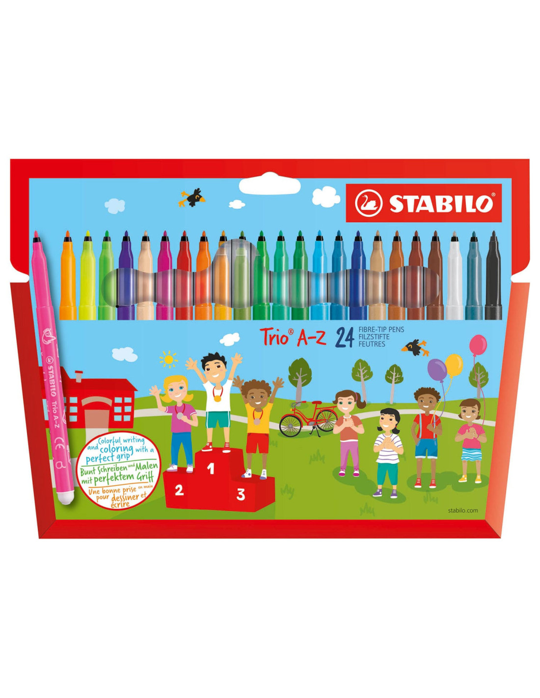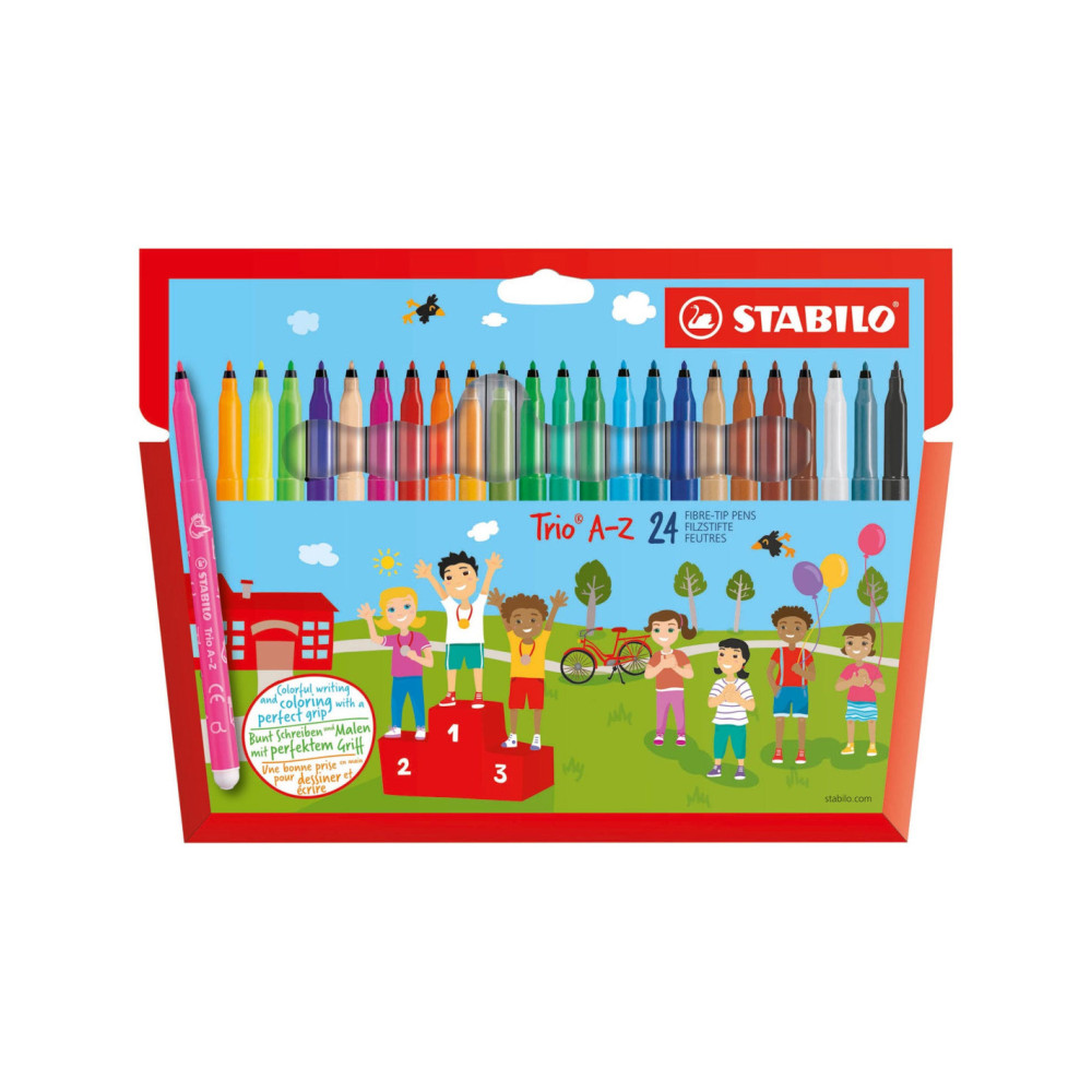 Set van 24 STABILO viltstiften. Speciaal ontworpen voor kinderen die leren kleuren en schrijven: de stift heeft een driehoekige anti-slip greep. Inhoud: 20 basiskleuren, 4 fluoriserende kleuren.