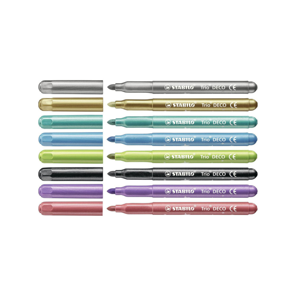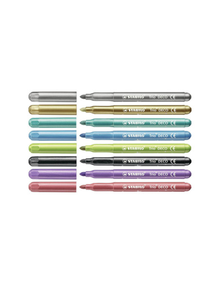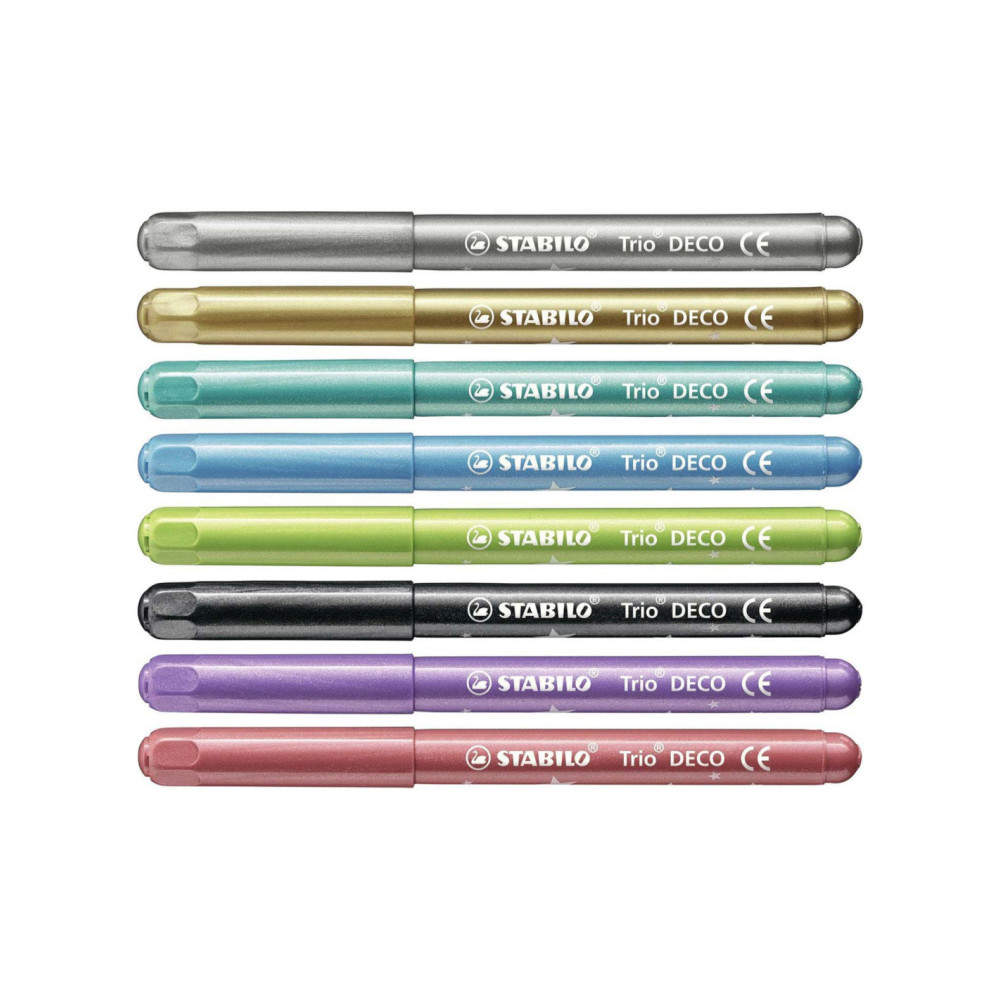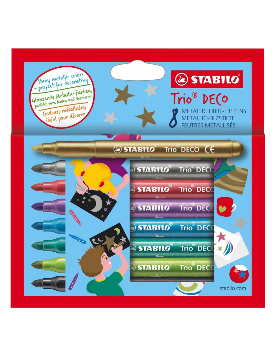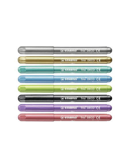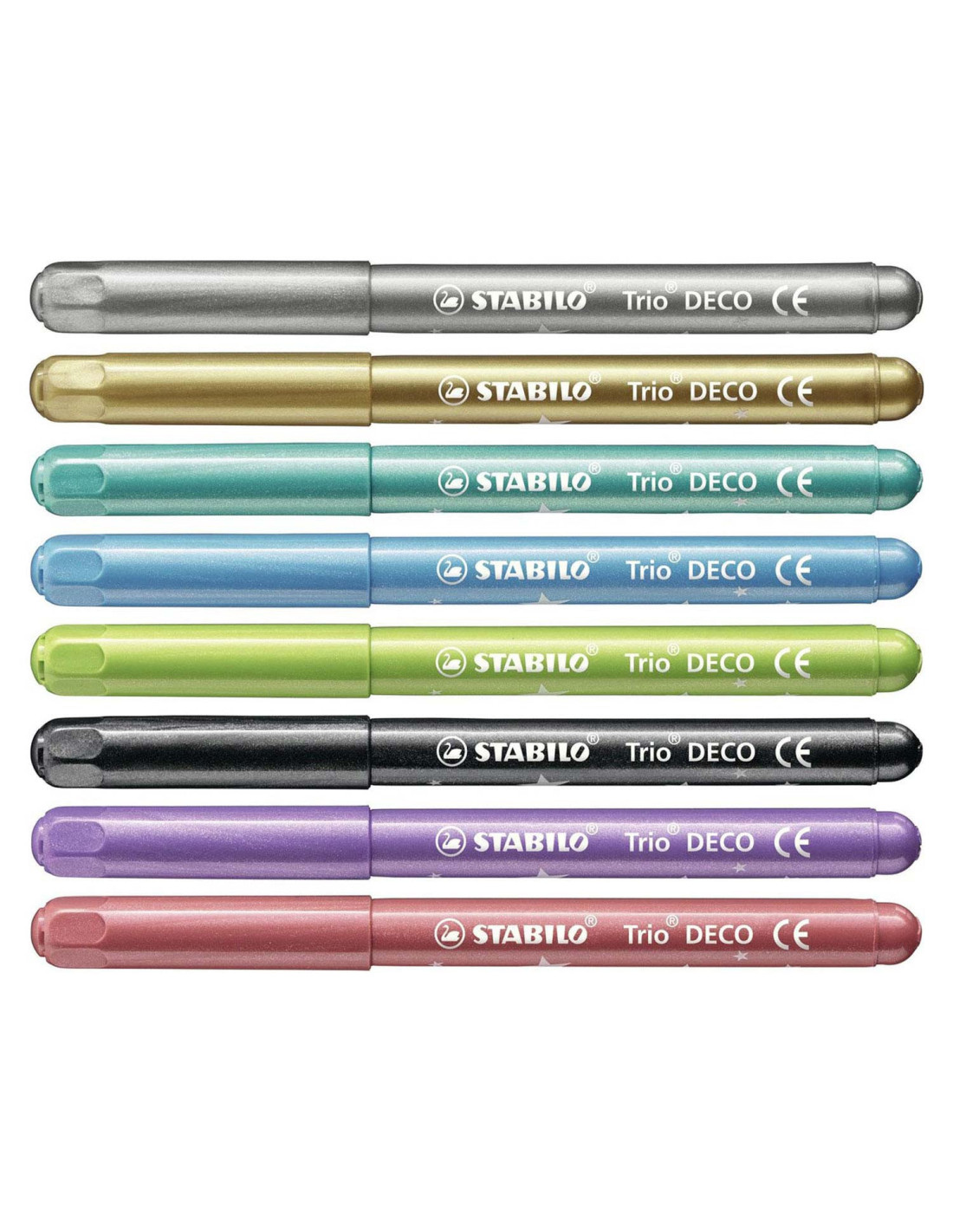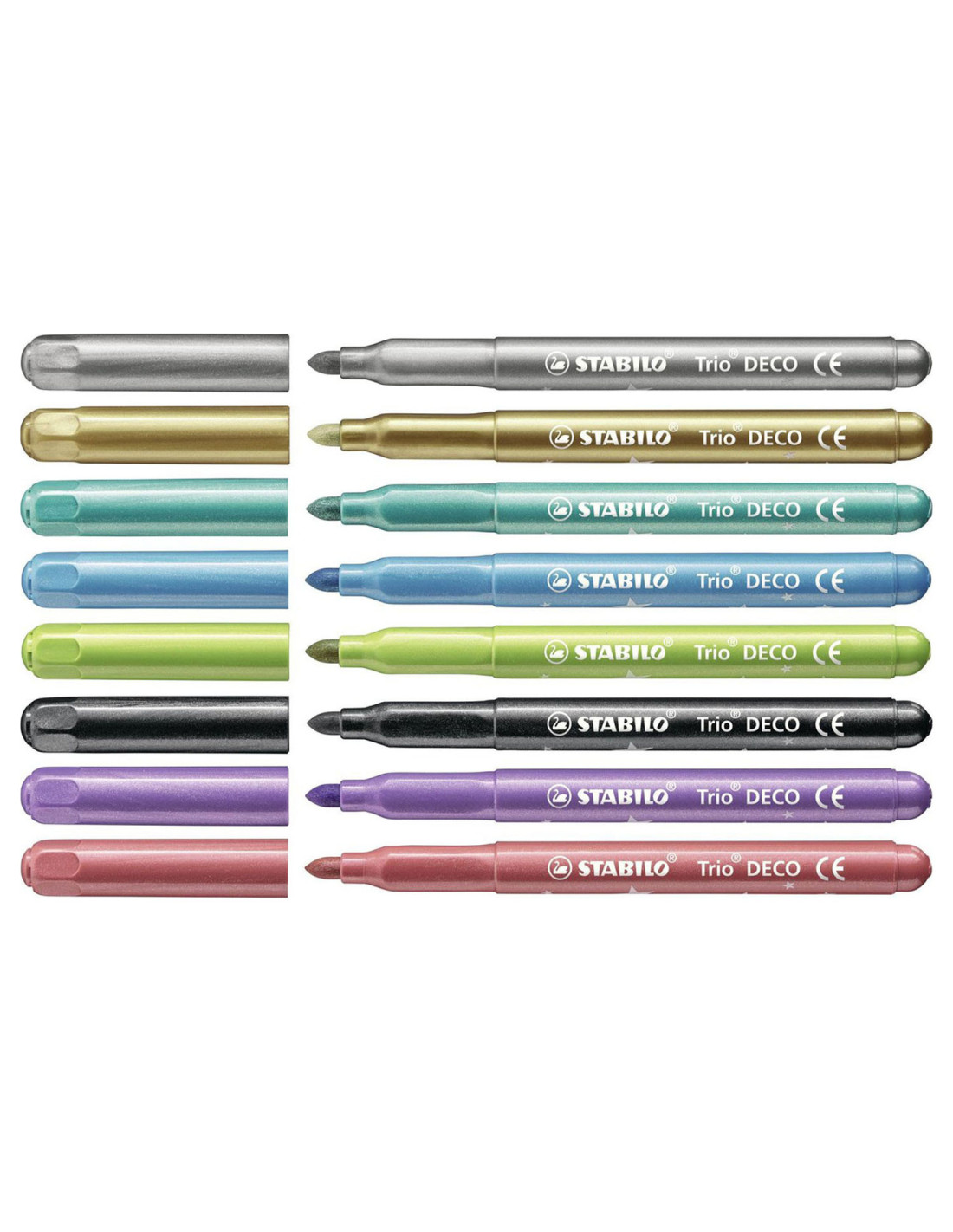 STABILO Trio Deco Metallic Viltstiften Etui, 8st. Dankzij de dikke vorm en ergonomische driehoekige grip kunnen kinderen de viltstiften goed vasthouden. De metallic kleuren komen het mooiste uit op wit papier of karton. Let op: metallic producten kunnen het beste liggend bewaard worden.