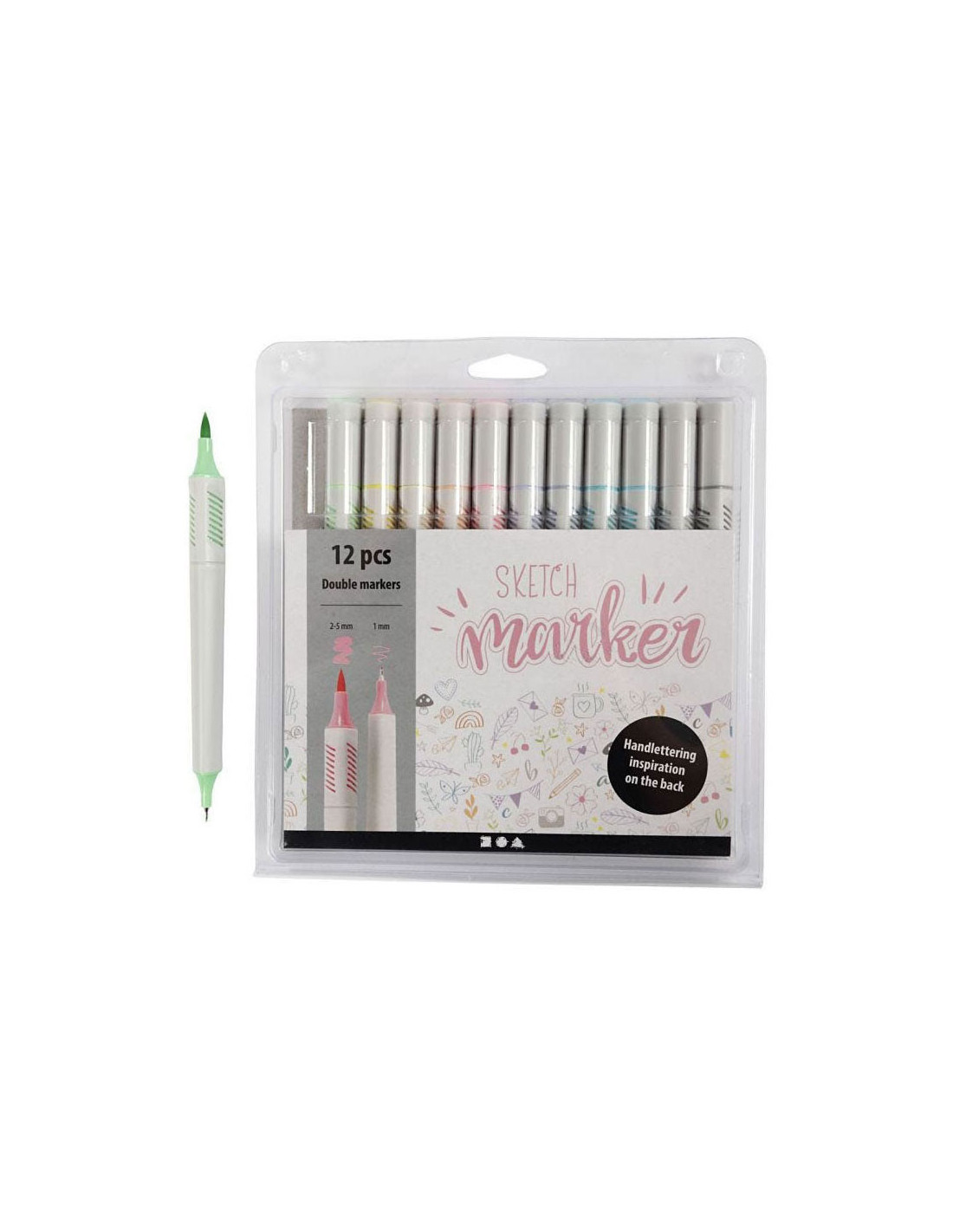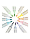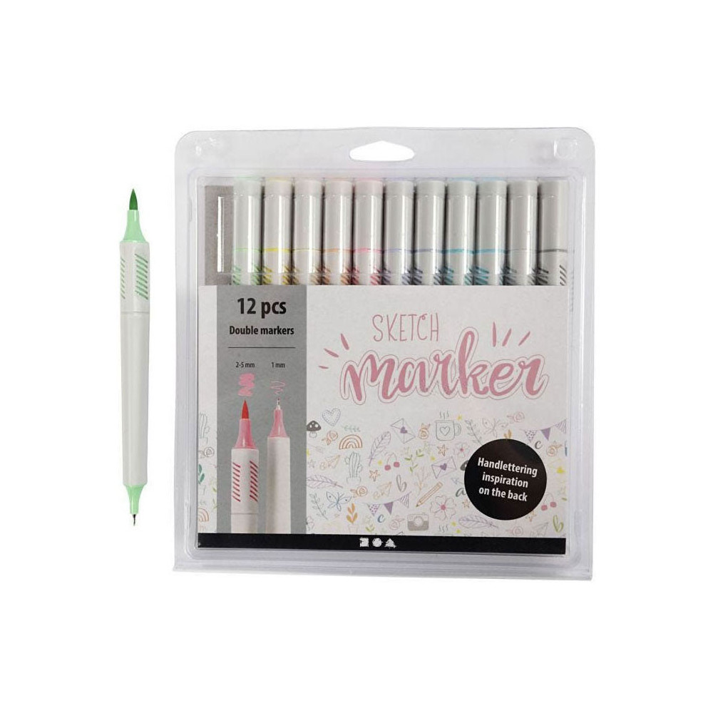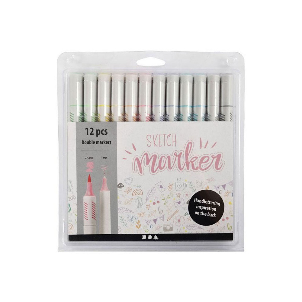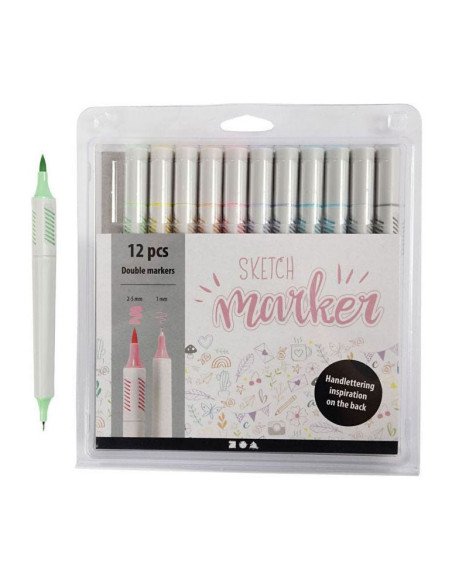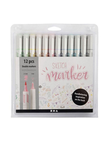 Teken en schrijf mooie illustraties en letters met deze driehoekige dubbelstiften op waterbasis. Ze zijn geschikt om op papier en karton te tekenen en liggen goed in de hand. Elke stift heeft twee punten, een dunne punt voor kleine details en een penseelpunt voor het maken van illustraties. Als je letters wil tekenen, kun je inspiratie en richtlijnen op de achterkant van de verpakking vinden.
