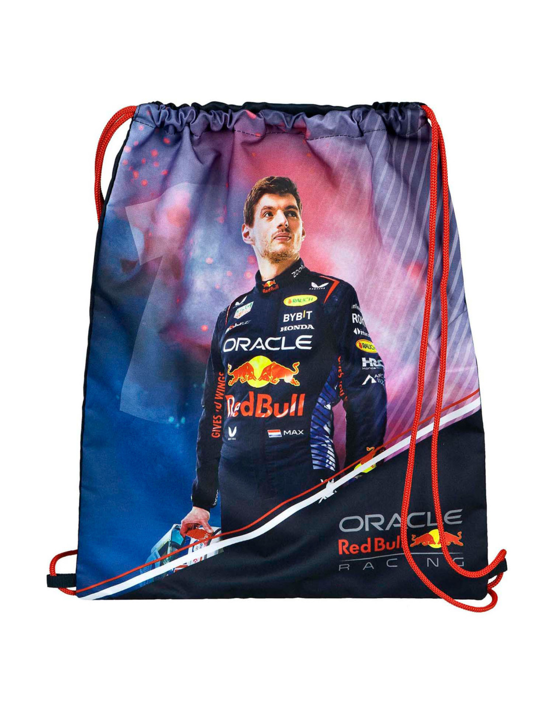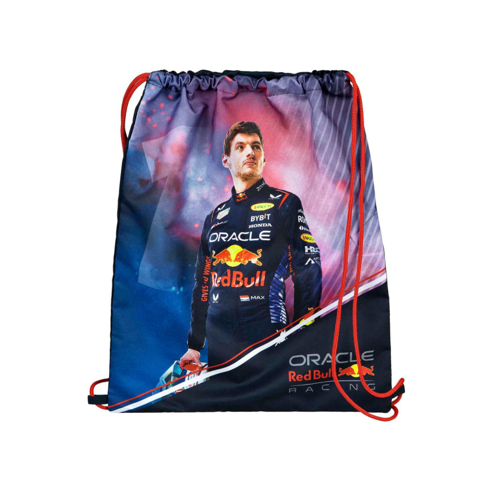 Gymtas met twee trektouwtjes om de tas te sluiten en er een rugzak van te maken. Met afbeelding van Max Verstappen en het Red Bull Racing logo.