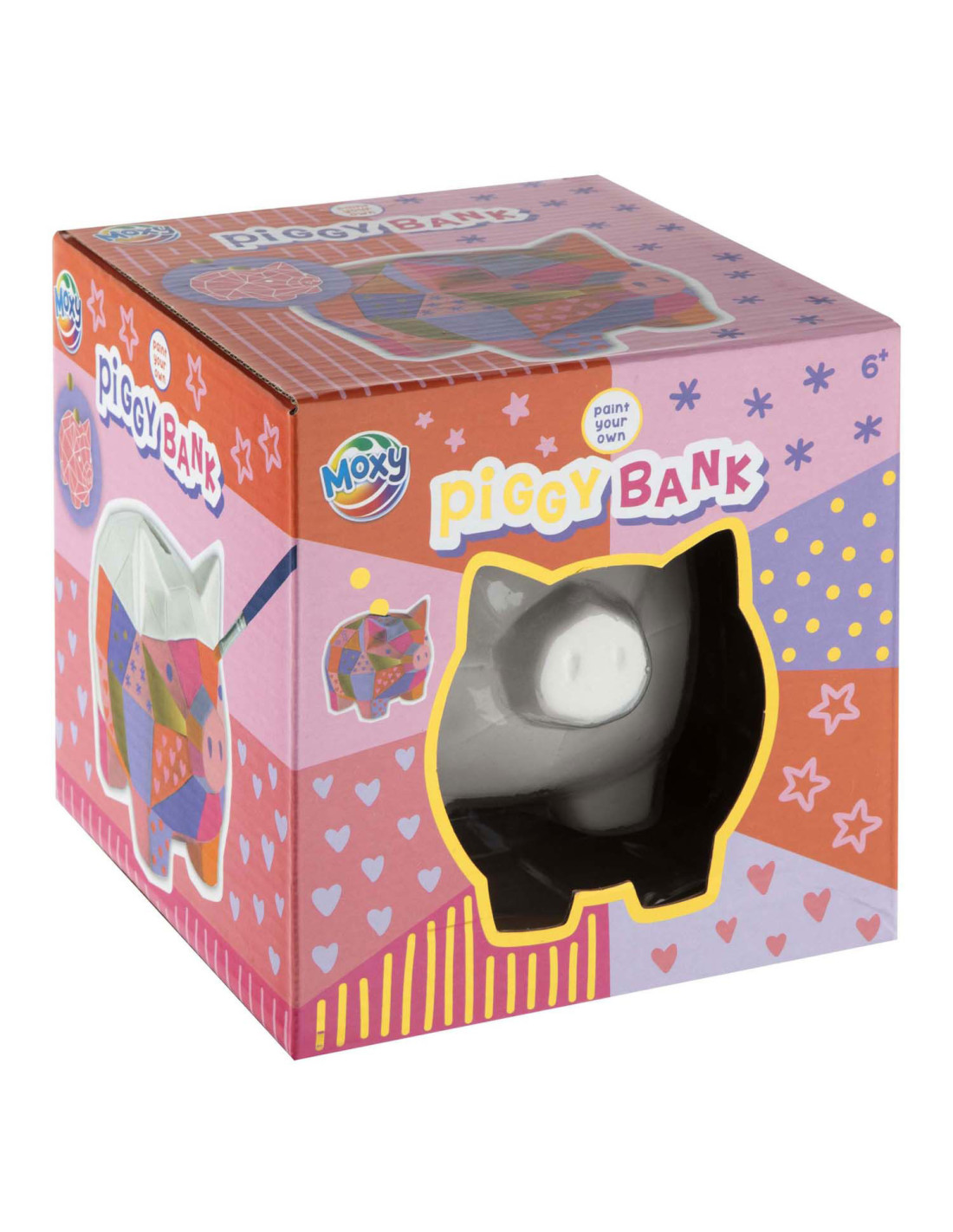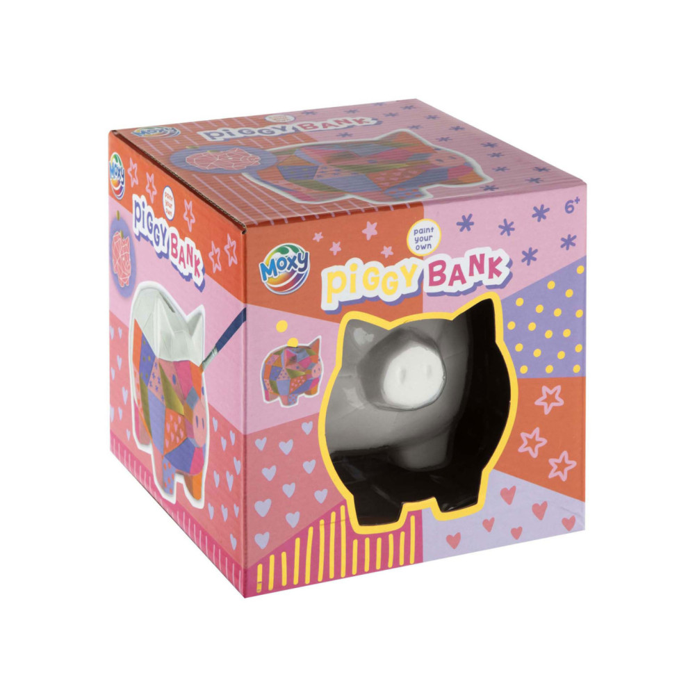 Schilder je eigen spaarvarken met 7 verschillende verfkleuren en een kwast.