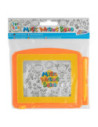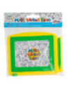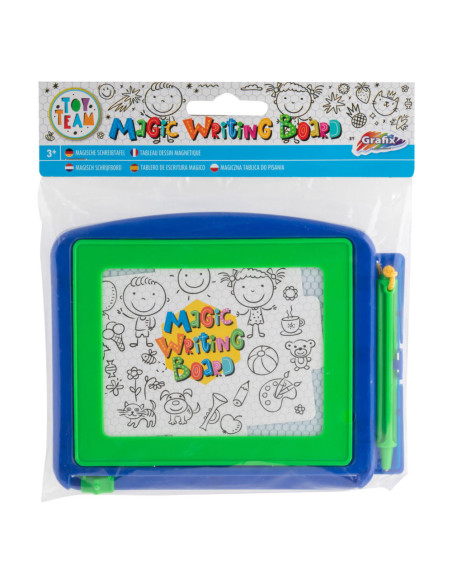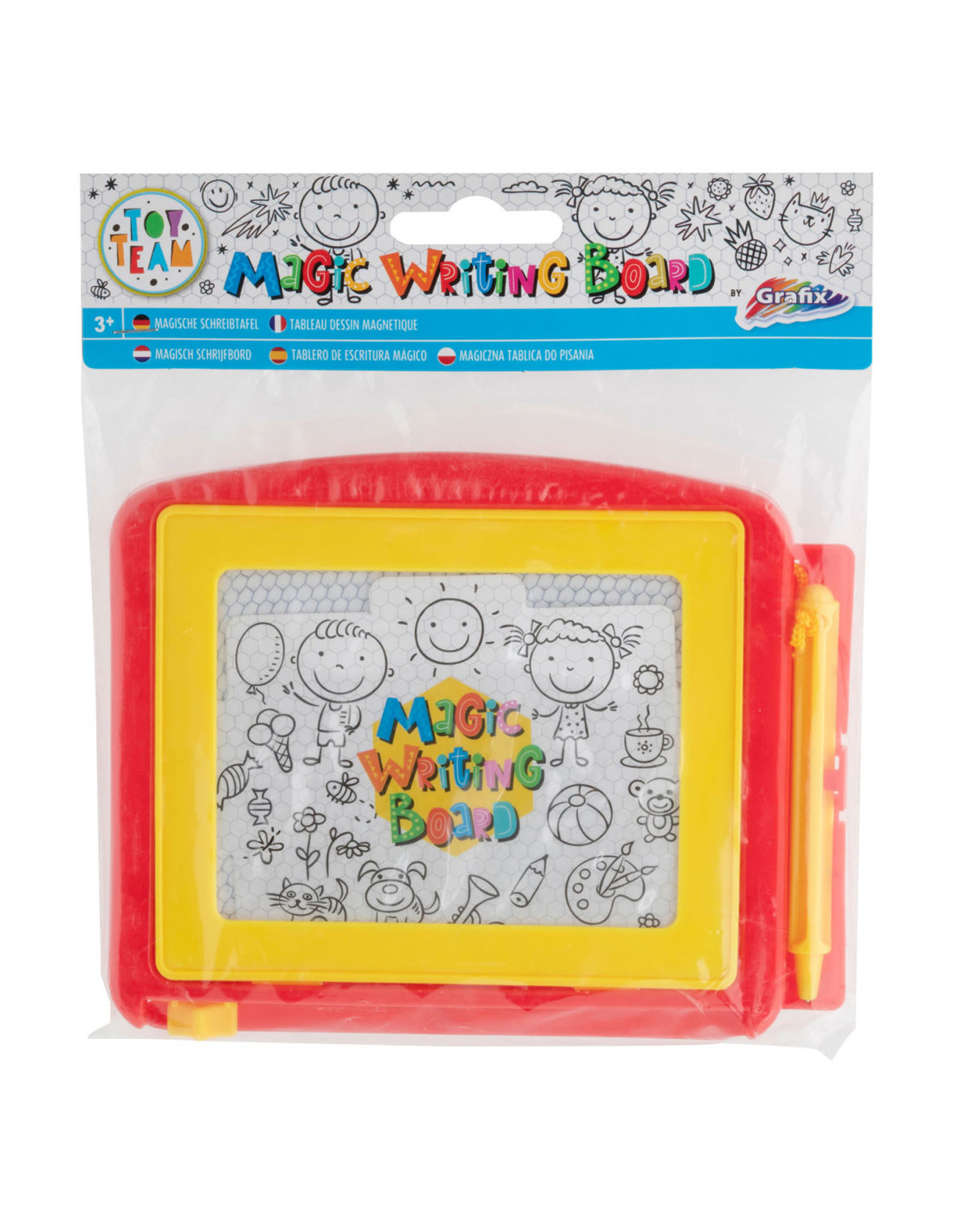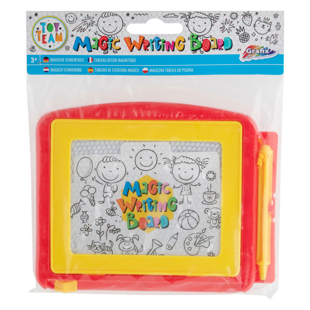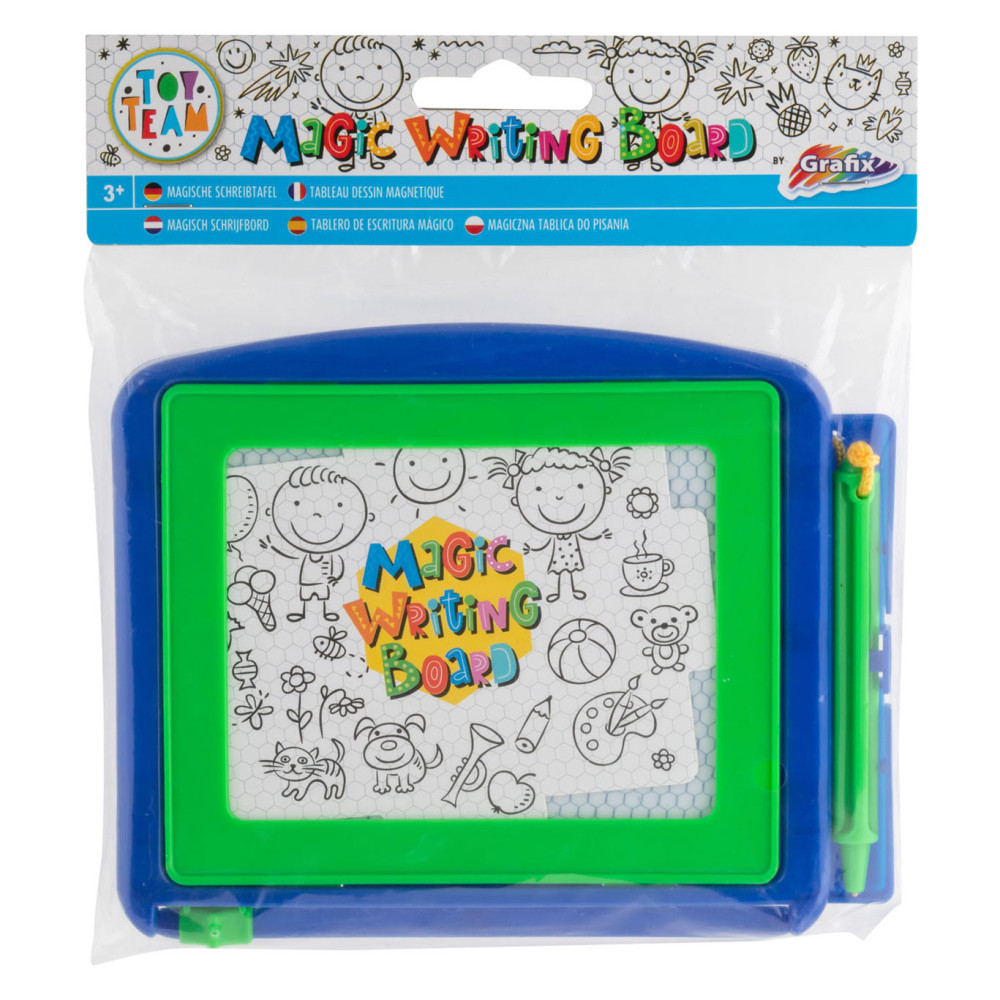 Klein magnetisch magisch tekenbord van 11,8 x 14,5 centimeter groot, met een magnetisch pennetje vastgemaakt aan een koordje. Verkrijgbaar in 4 verschillende kleuren en geschikt vanaf 3 jaar.