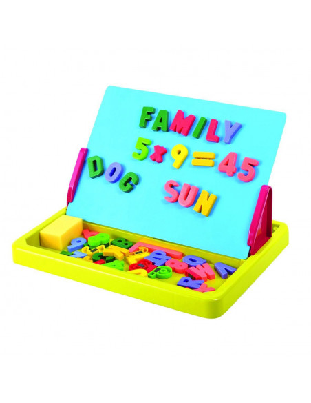 Oefen met letters en cijfers op dit magnetische tekenbord van Playgo. Draai het bord met behulp van de steuntjes in de juiste hoek. Met de vrolijk gekleurde magnetische letters, cijfers en rekentekens maak je de eerste woorden en sommen. De set bevat 26 letters, 20 cijfers, 5 rekentekens en 2 strepen. Na het spelen ruim je het bord gemakkelijk weer op in de handige draagkoffer.