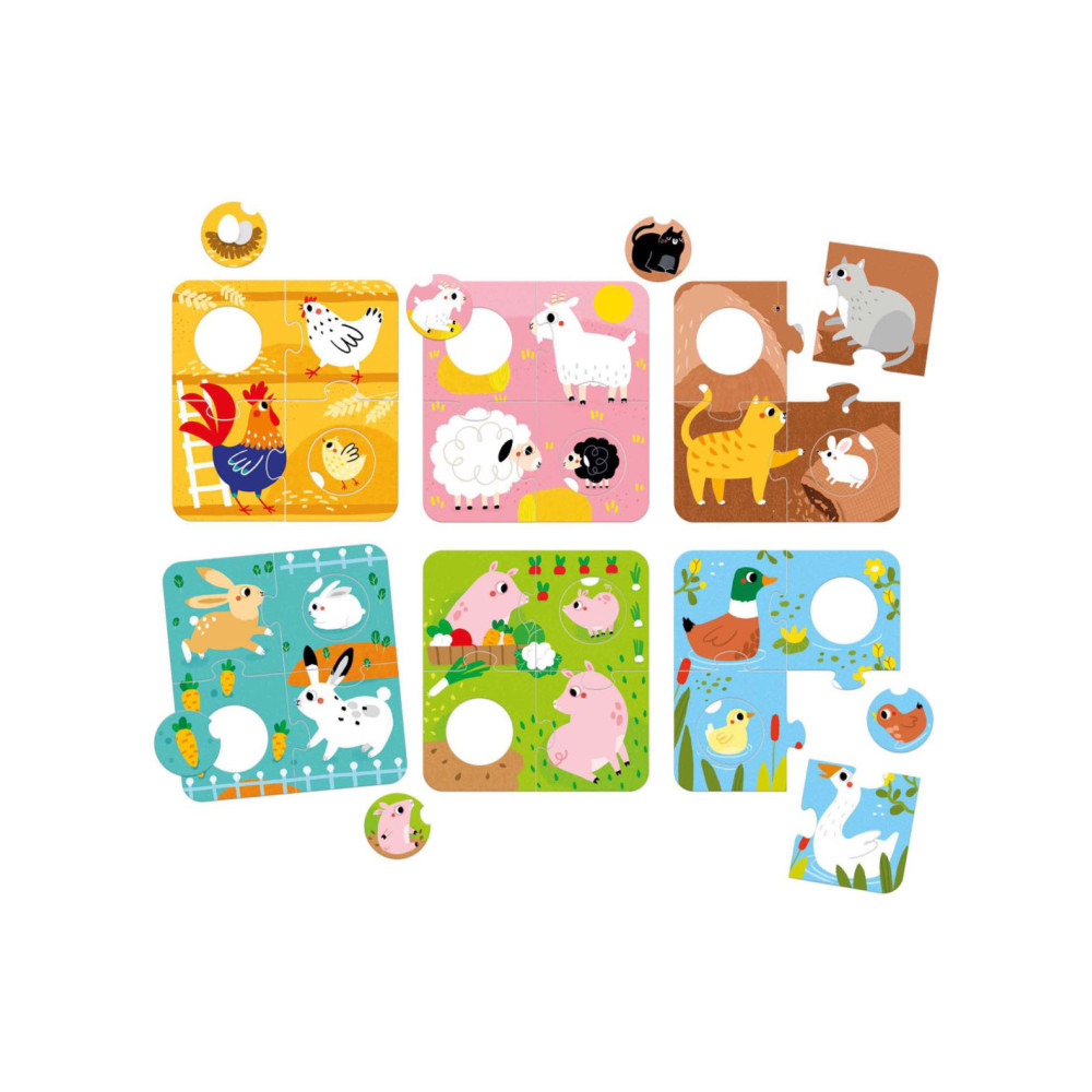 Elke puzzel is voorzien van levendige illustraties van schattige boerderijdieren, waardoor peuters van 1-3 jaar de puzzelstukjes gemakkelijk kunnen vastpakken en verbinden. Het grote formaat van de stukjes is perfect voor kleine handjes, wat zorgt voor urenlang speelplezier en leren zonder frustraties.