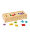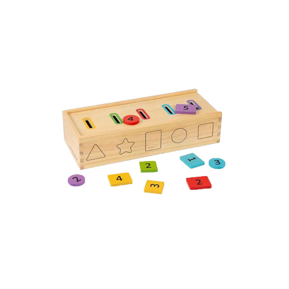 Vroege leerlingen kunnen getallen, kleuren en vormen ontdekken met deze unieke Sorteerbox. De set wordt geleverd met een compacte houten doos, met gekleurde sleuven op het deksel, en een selectie genummerde fiches in verschillende kleuren, vormen en maten.