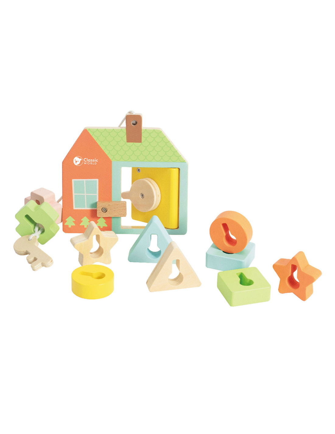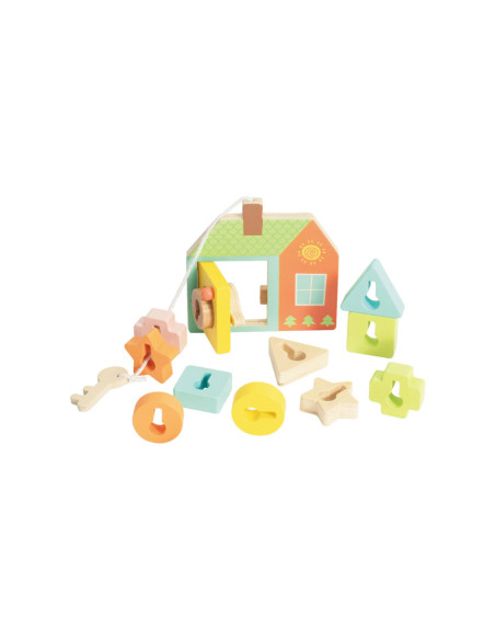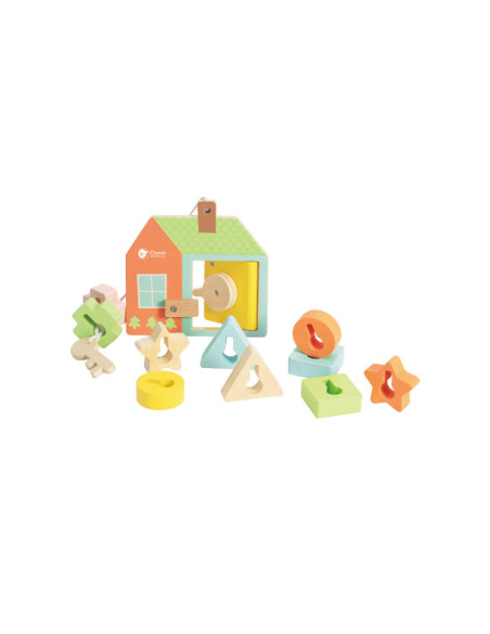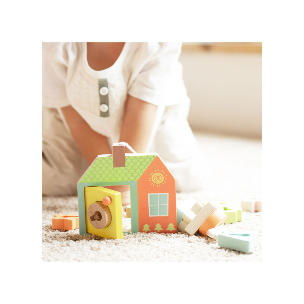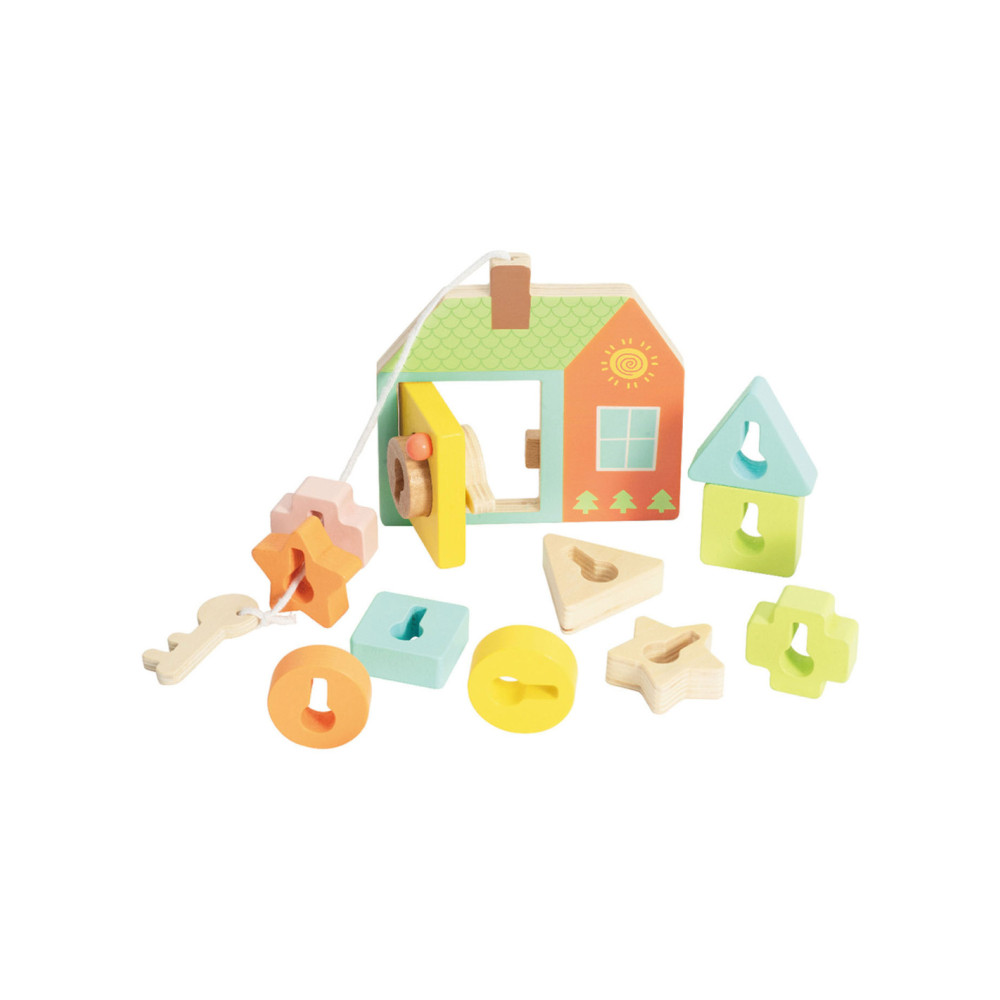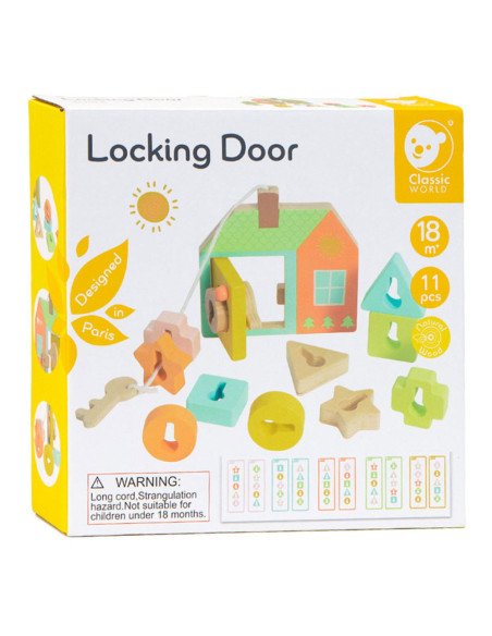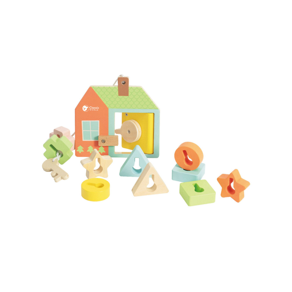 Onze vormenspel van Classic World is de perfecte manier om de ontwikkeling van peuters en dreumesen te stimuleren. Veel kinderen in deze leeftijdsgroep zijn geïnteresseerd in sleutels en sloten, en doen vaak mama of papa na met sleutels bij deuren. Ons spel speelt hier op in, en voegt extra uitdagingen toe. Het bestaat uit een houten huisje met een sleutel en allerlei gekleurde vormpjes. Met de sleutel kun je de deur open- en dichtdraaien en de vormpjes kun je over de sleutel schuiven om een ketting te vormen voor het touw. Dit soort handelingen stimuleren de hand-oogcoördinatie en de fijne motoriek. Dit vormenspel is geschikt voor kinderen vanaf 18 maanden. Bevorder de ontwikkeling van uw kind en koop nu ons vormenspel van Classic World.
