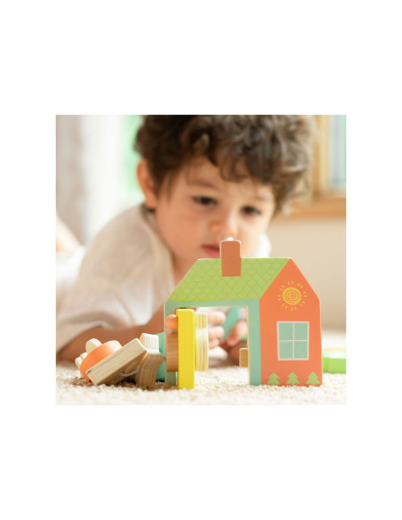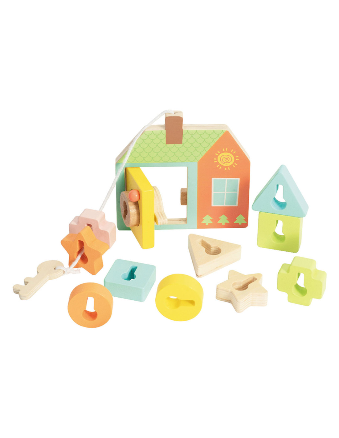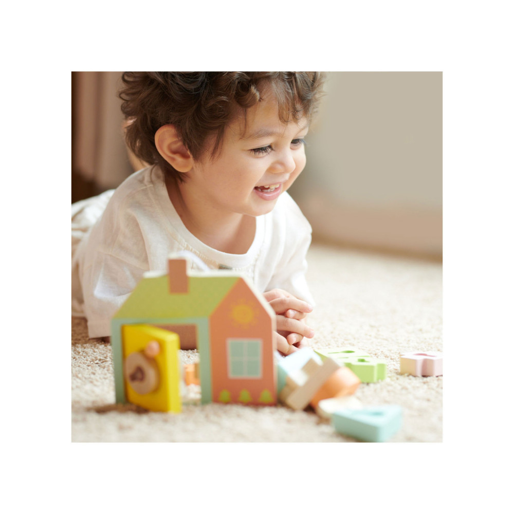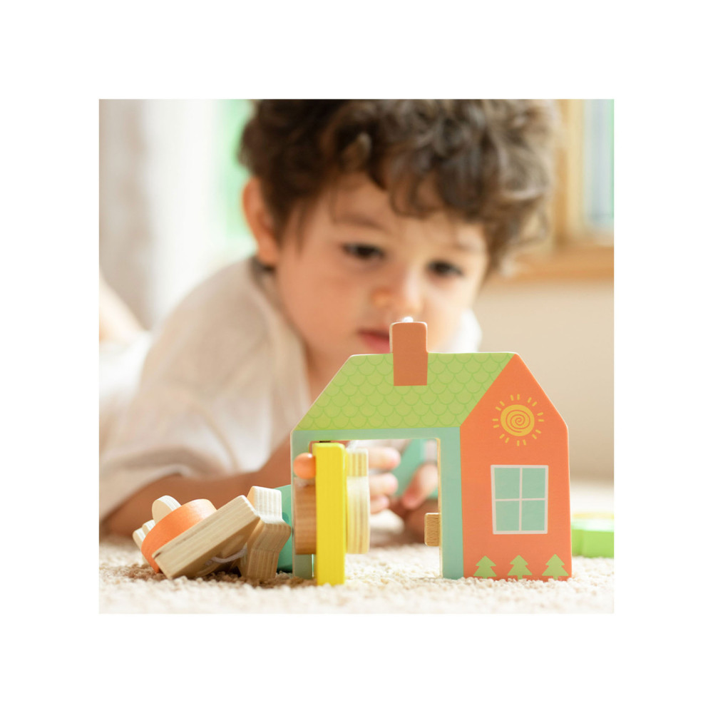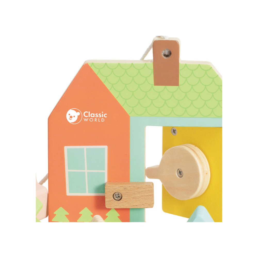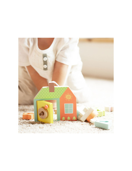Onze vormenspel van Classic World is de perfecte manier om de ontwikkeling van peuters en dreumesen te stimuleren. Veel kinderen in deze leeftijdsgroep zijn geïnteresseerd in sleutels en sloten, en doen vaak mama of papa na met sleutels bij deuren. Ons spel speelt hier op in, en voegt extra uitdagingen toe. Het bestaat uit een houten huisje met een sleutel en allerlei gekleurde vormpjes. Met de sleutel kun je de deur open- en dichtdraaien en de vormpjes kun je over de sleutel schuiven om een ketting te vormen voor het touw. Dit soort handelingen stimuleren de hand-oogcoördinatie en de fijne motoriek. Dit vormenspel is geschikt voor kinderen vanaf 18 maanden. Bevorder de ontwikkeling van uw kind en koop nu ons vormenspel van Classic World.