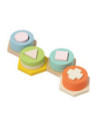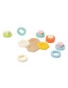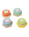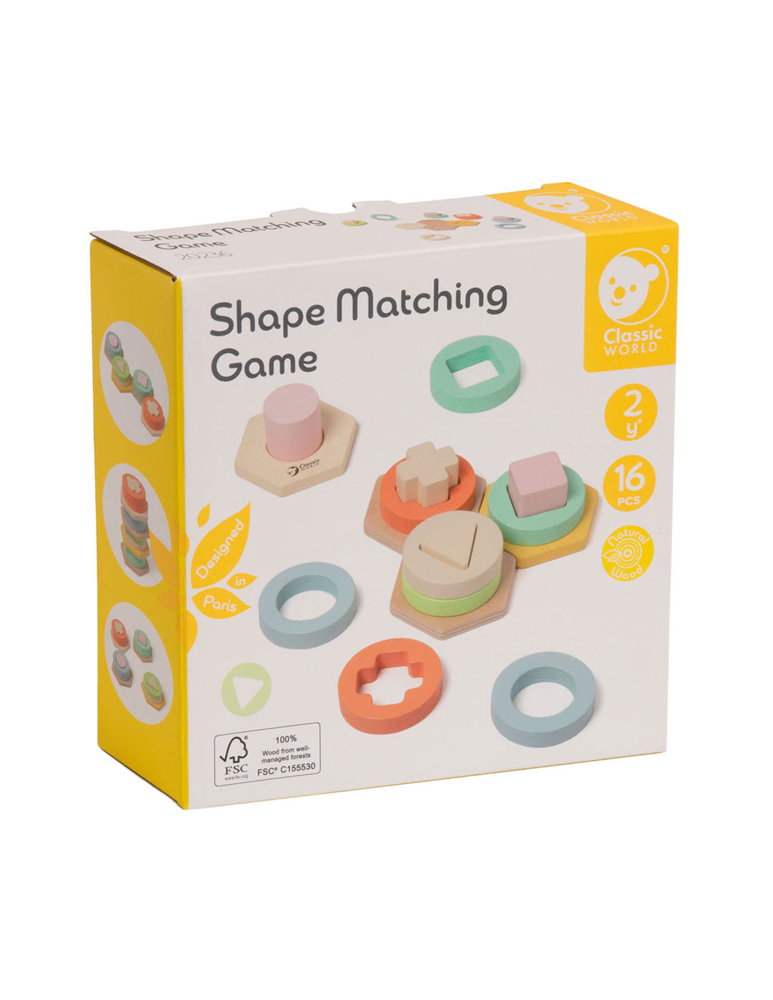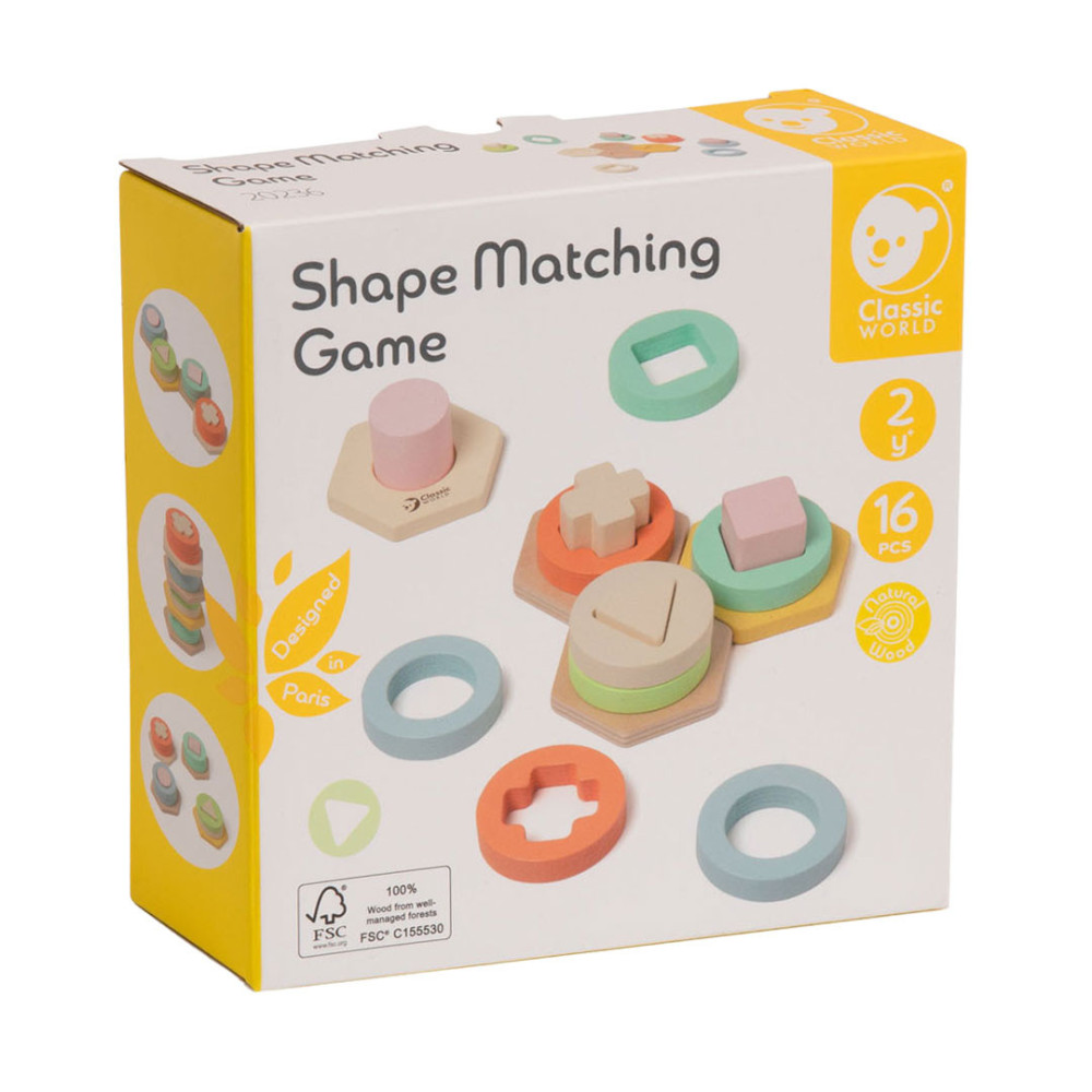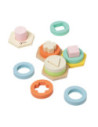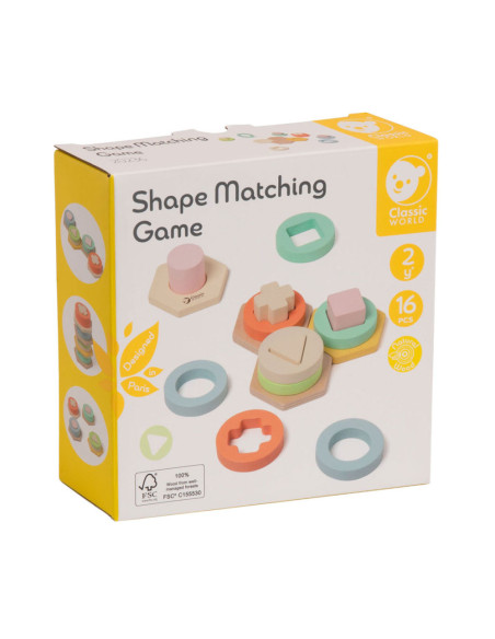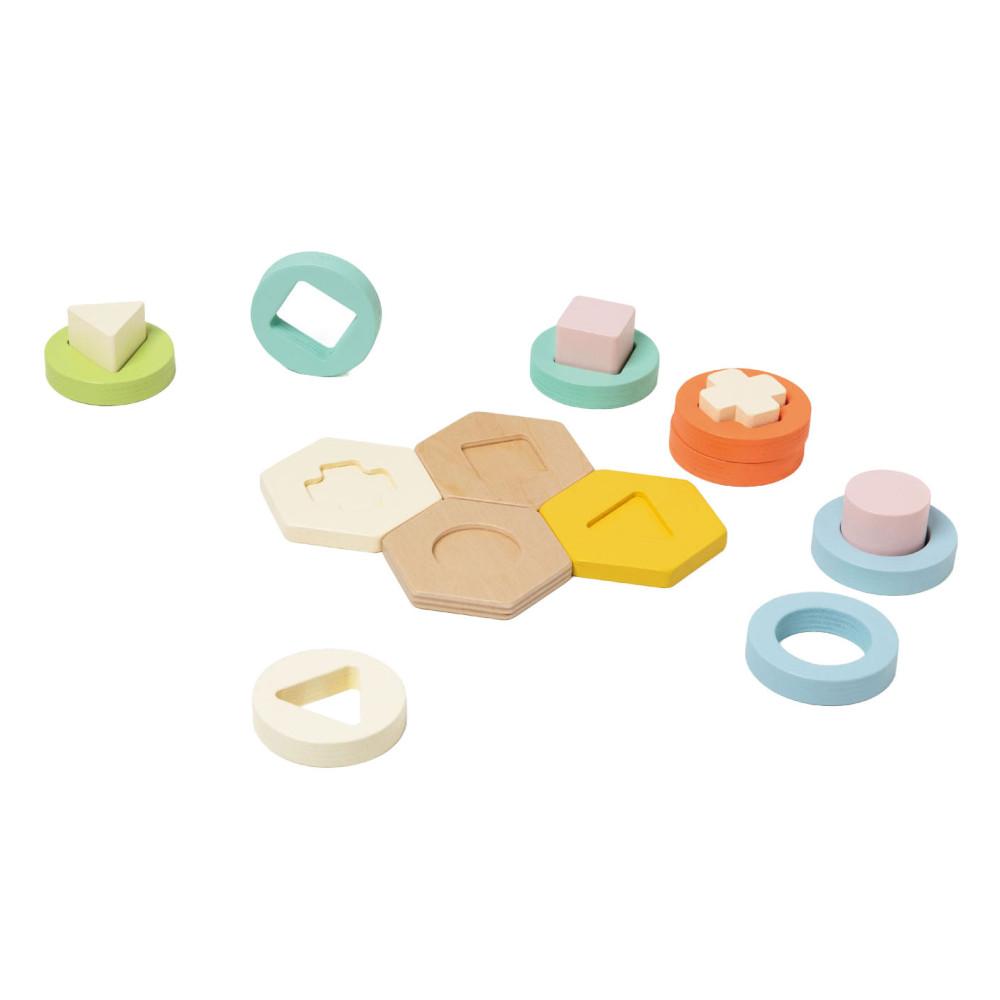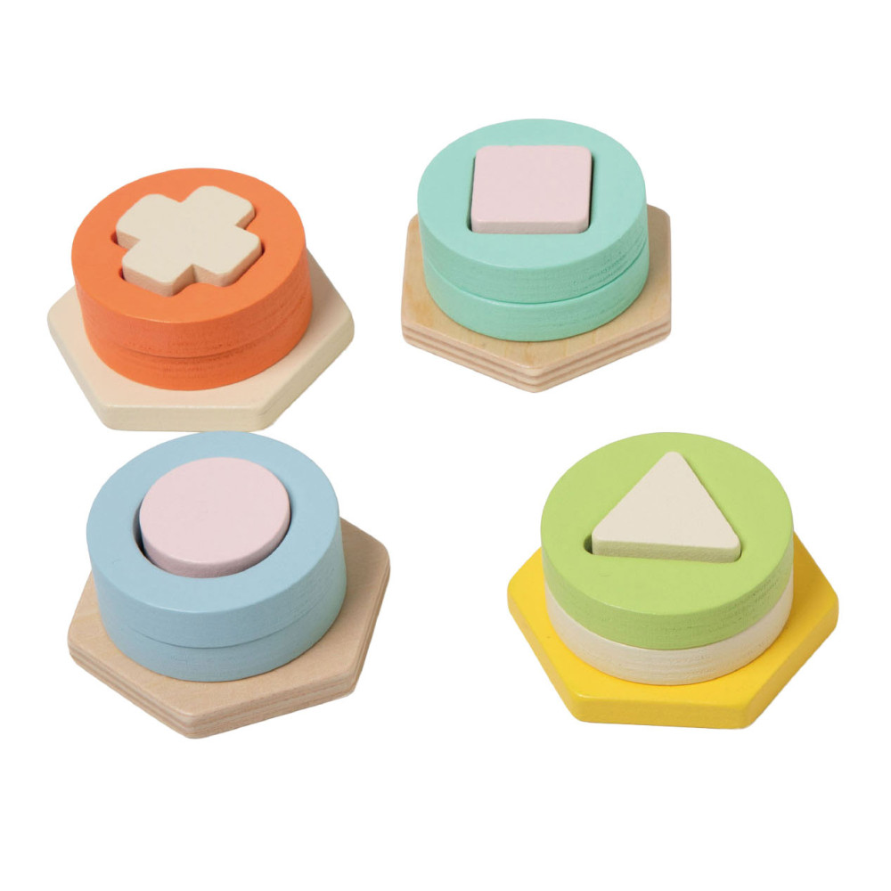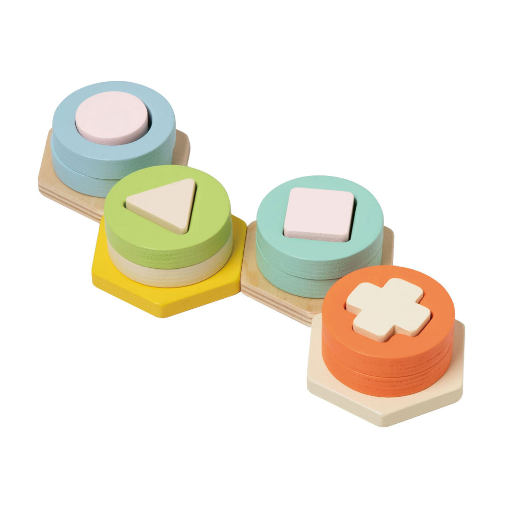 Vormen sorteer spel voor kinderen vanaf 2 jaar. Het spel bevat 4 verschillende pilaren met bijbehorende vormen die erop gestapeld moeten worden. Hierbij leren kinderen vormen, kleuren en stimuleren ze hun fijne motoriek en hand-oog-coördinatie.