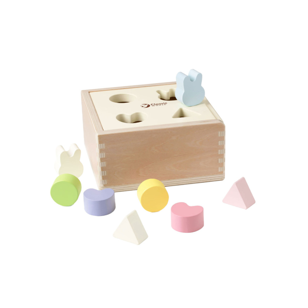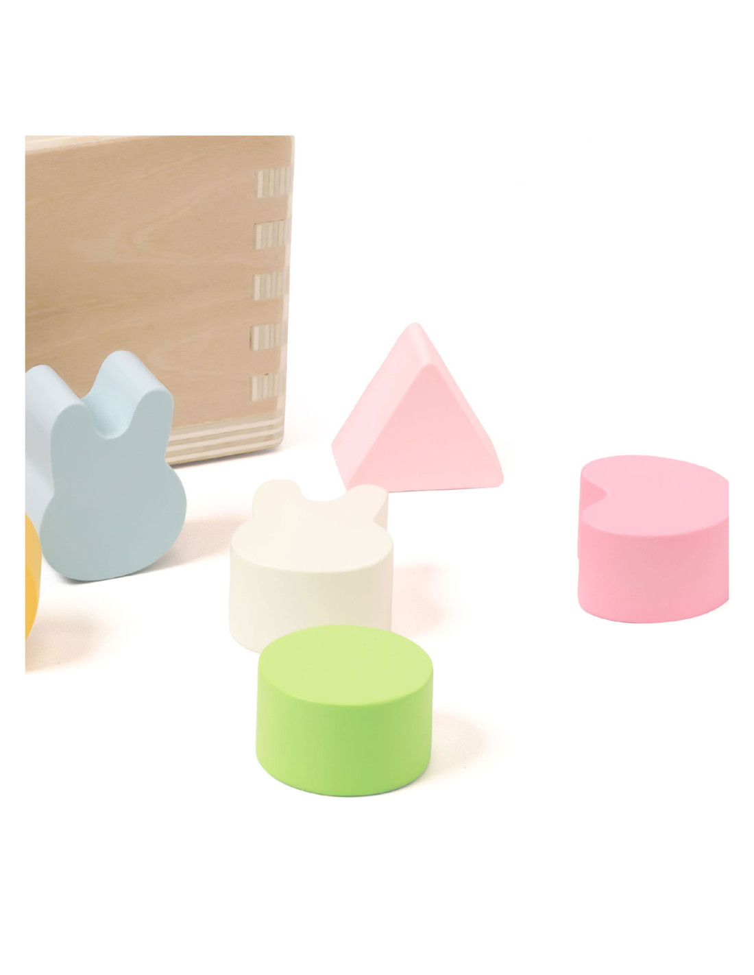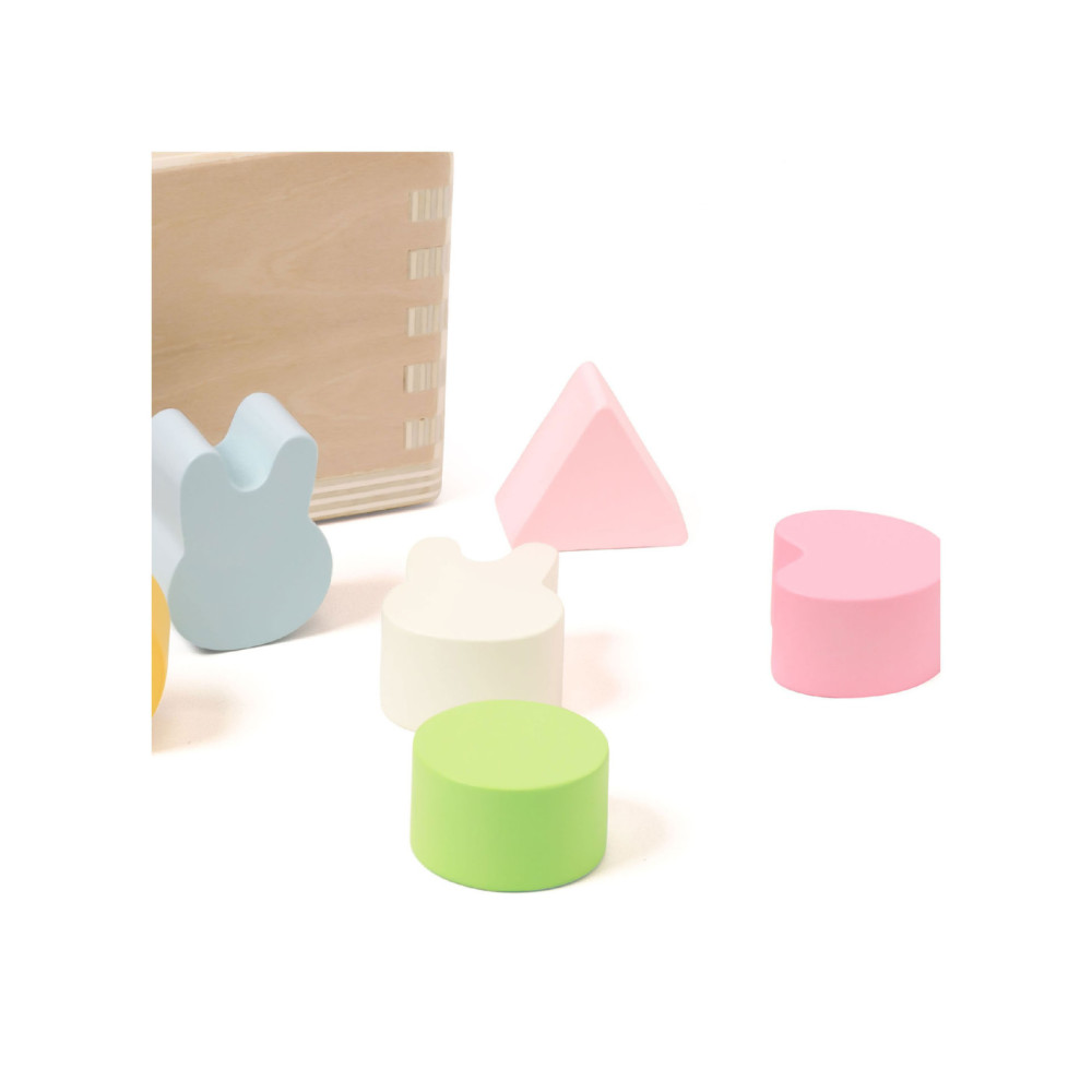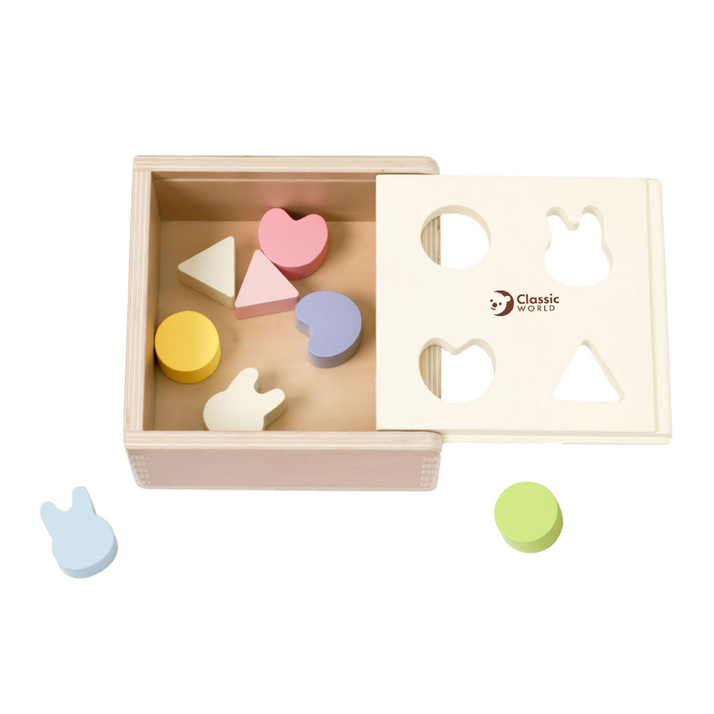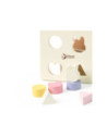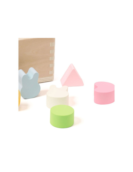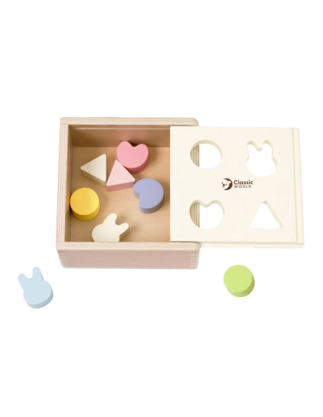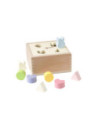Houten box met in de deksel, vier verschillende gaten. Het is de bedoeling dat de bijbehorende vormen in het juiste gat gestopt worden. Het spel is geschikt voor kinderen vanaf 12 maanden en het bevat een houten box met deksel en 10 vormen. Stimuleert het leren van vormen en de grijpvaardigheid.