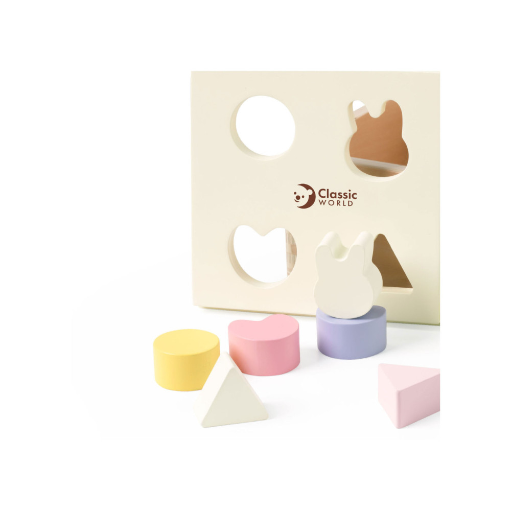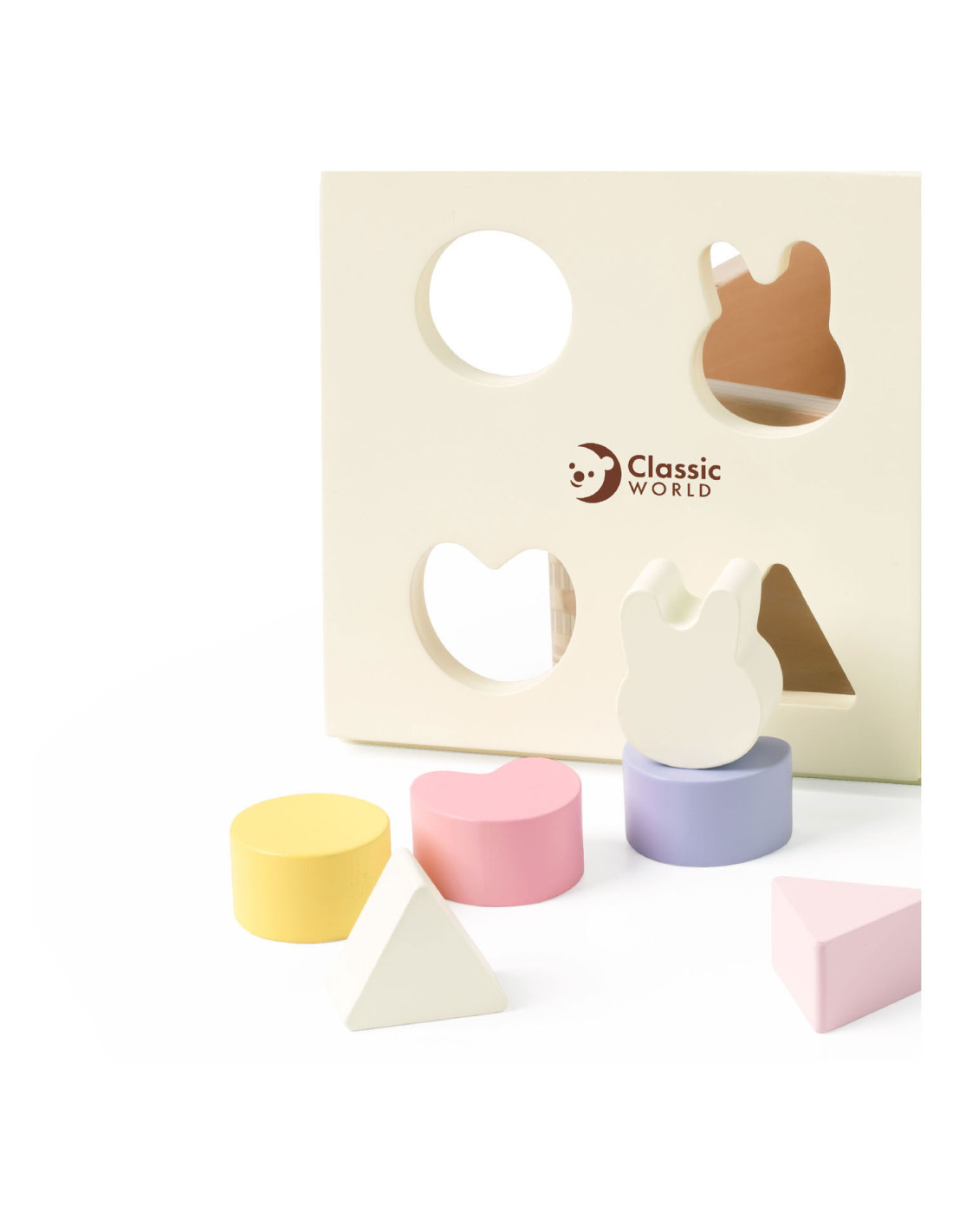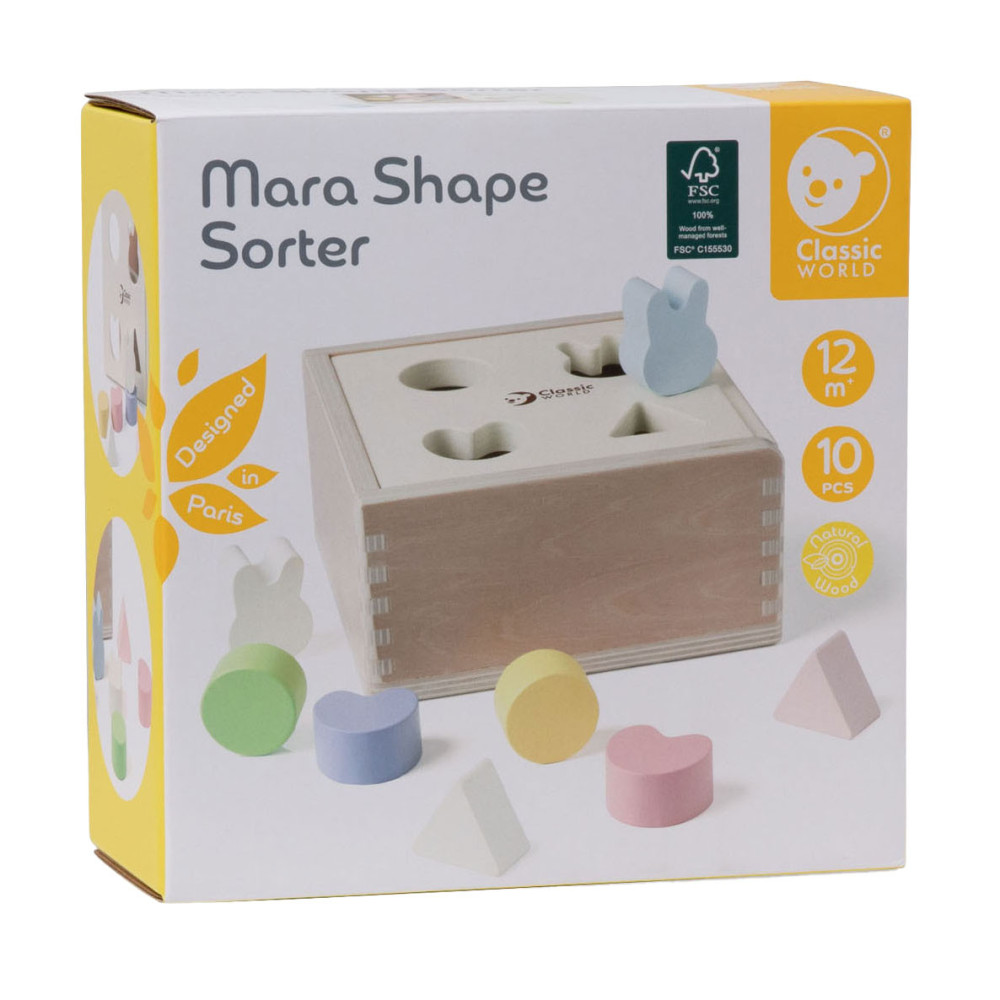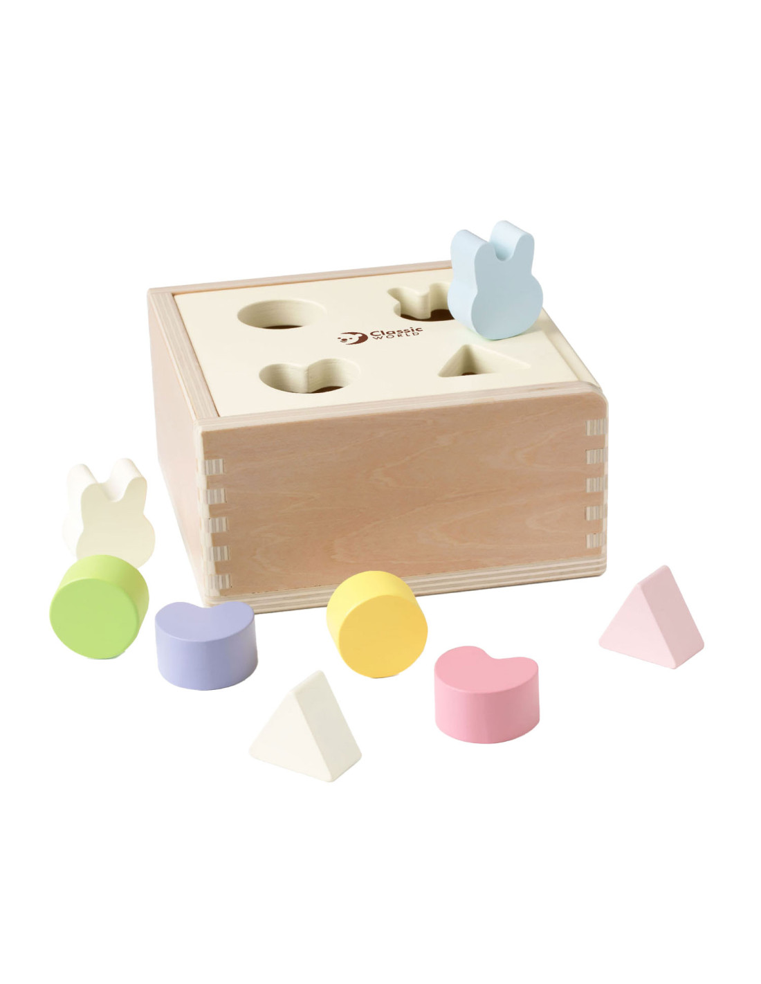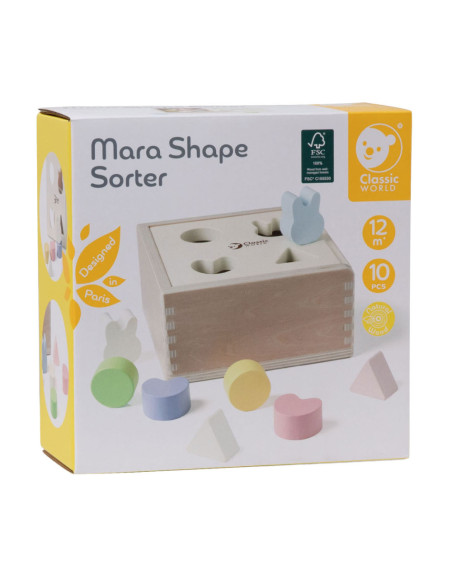 Houten box met in de deksel, vier verschillende gaten. Het is de bedoeling dat de bijbehorende vormen in het juiste gat gestopt worden. Het spel is geschikt voor kinderen vanaf 12 maanden en het bevat een houten box met deksel en 10 vormen. Stimuleert het leren van vormen en de grijpvaardigheid.