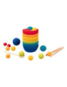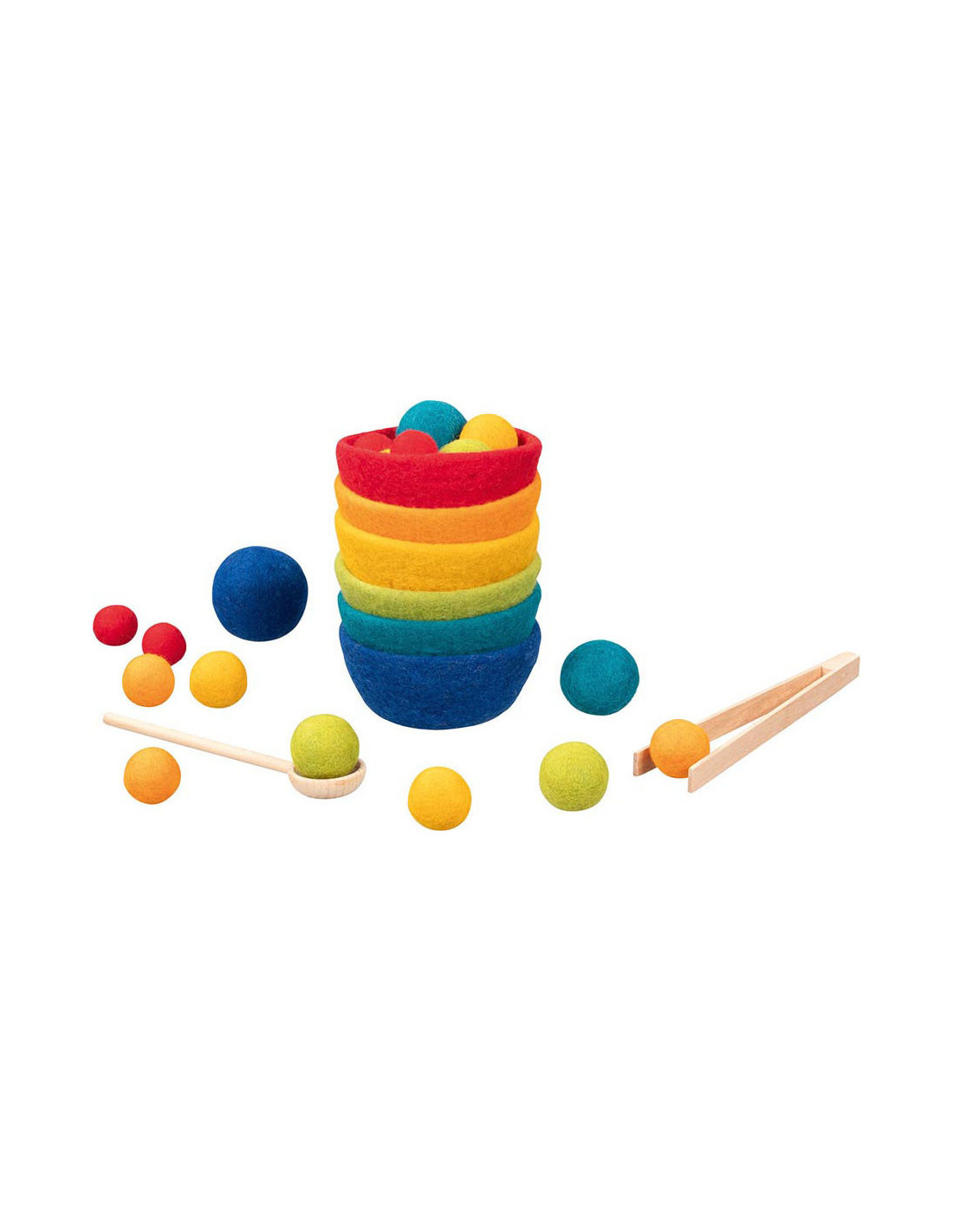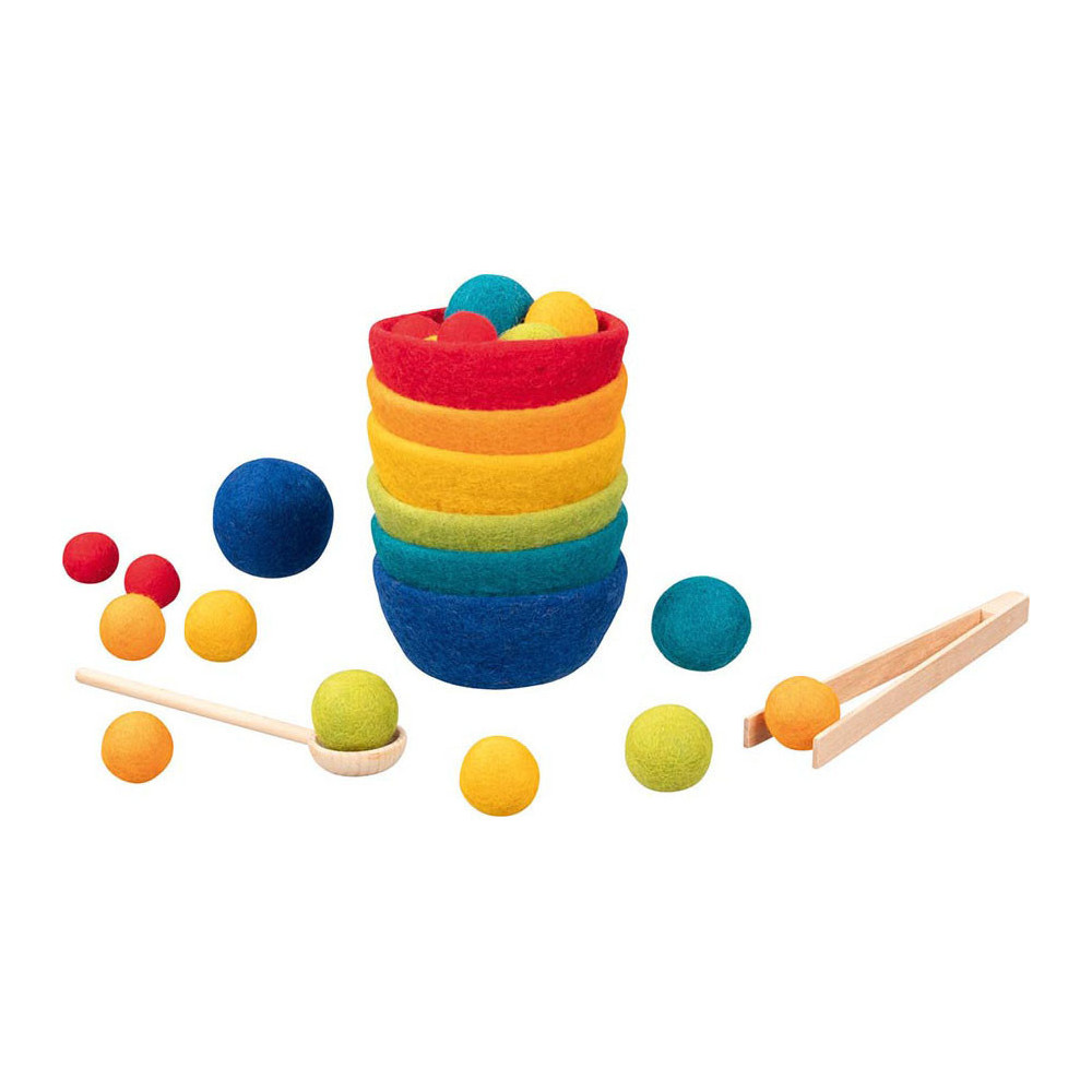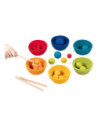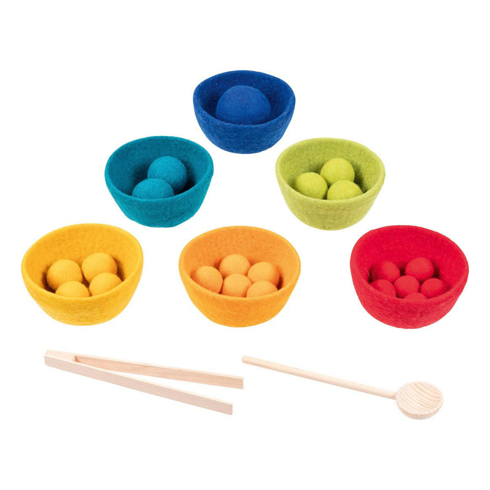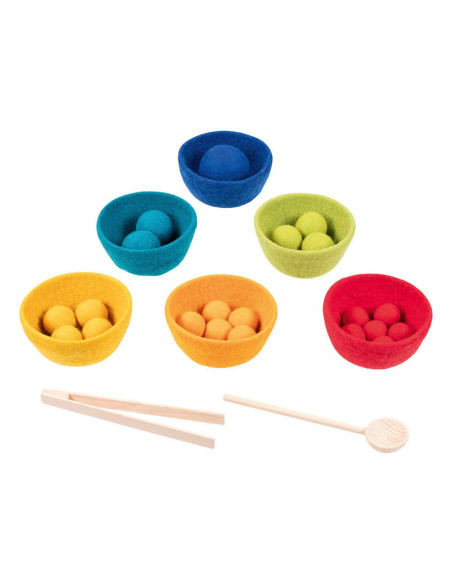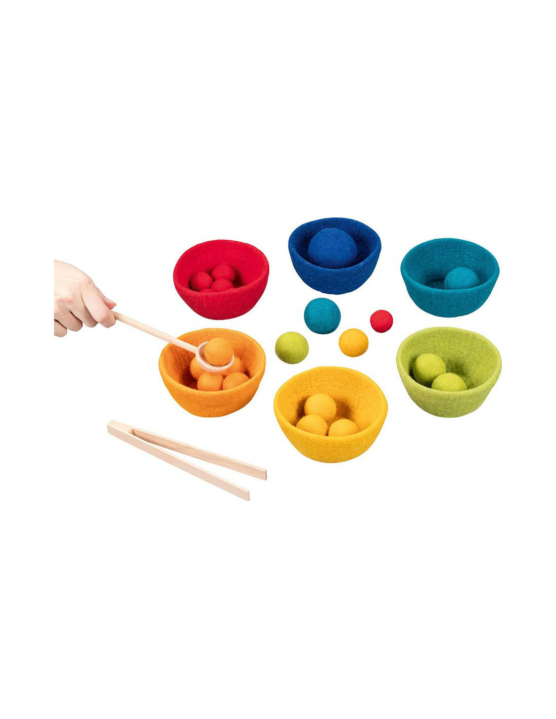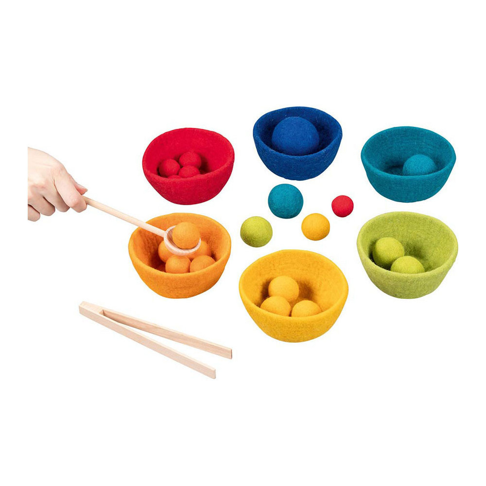 Kleur sorteerspel. Plaats de juiste kleur ballen in het juiste kommetje. Tel daarna het aantal balletjes in de bakjes. Je traint tegelijkertijd je motoriek als je de balletjes met de knijper of de lepel in en uit de bakjes haalt.
