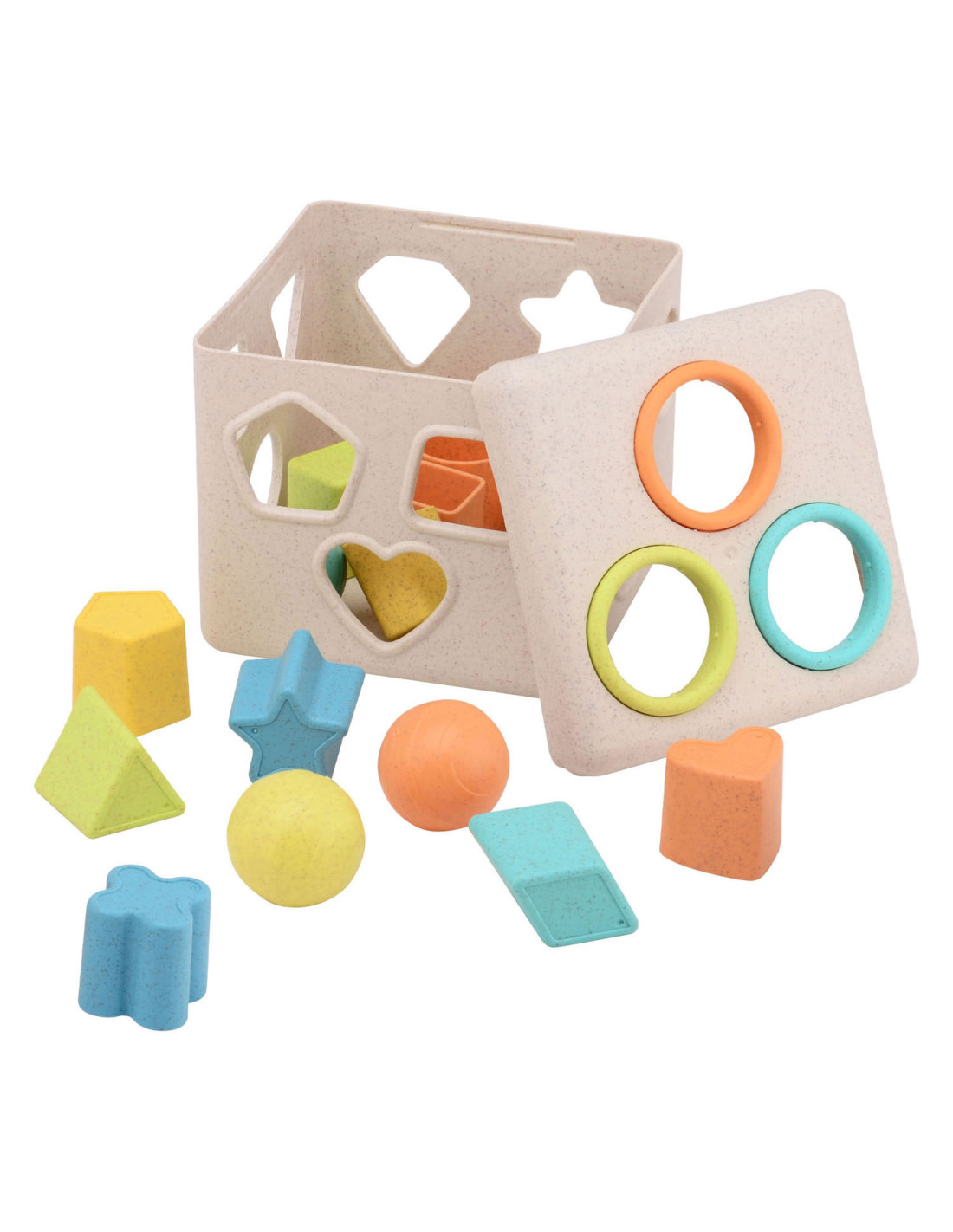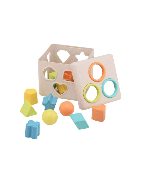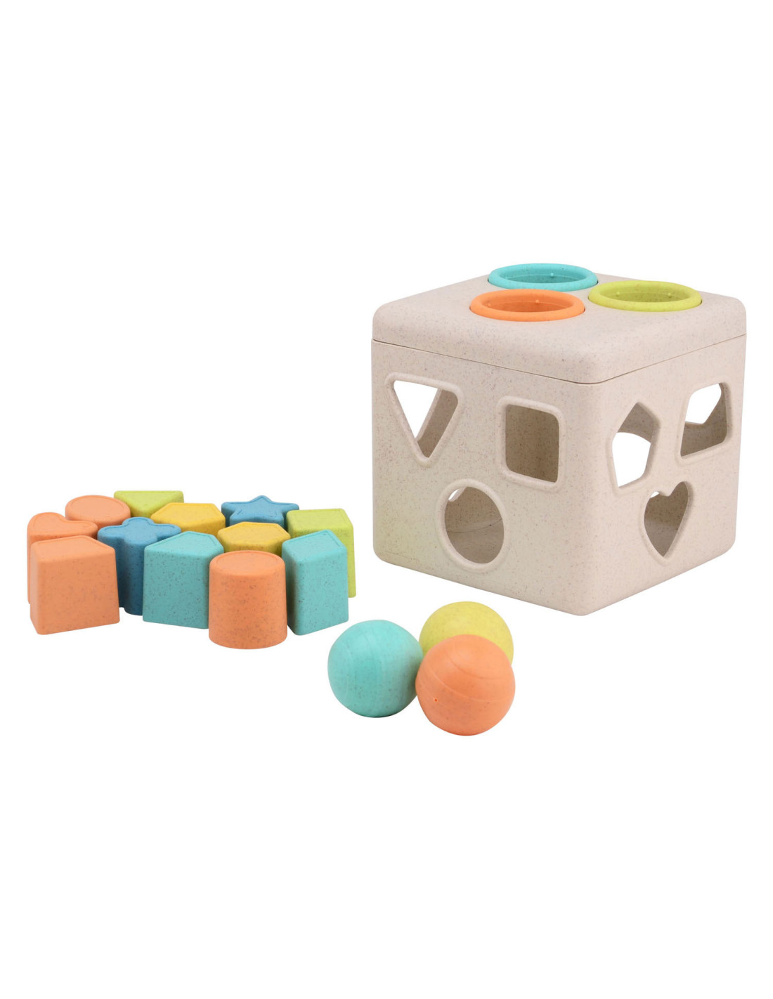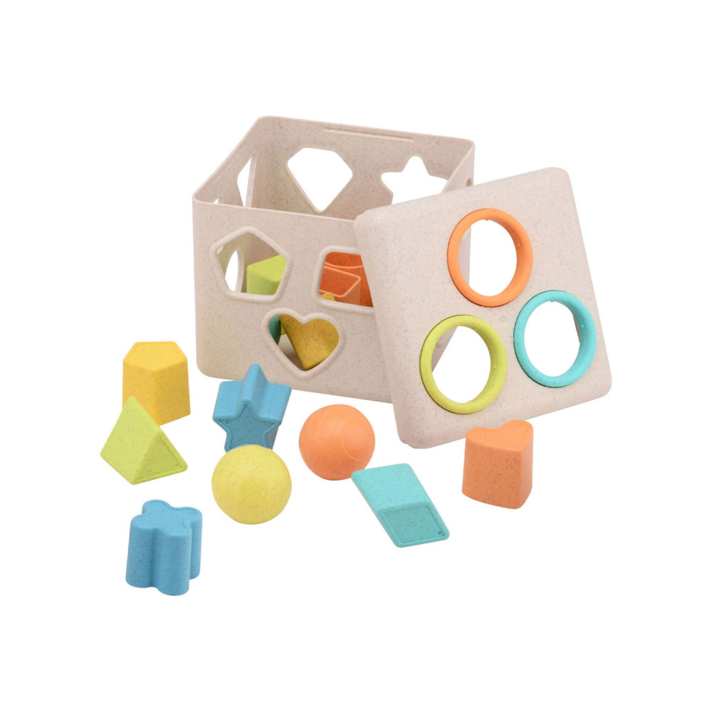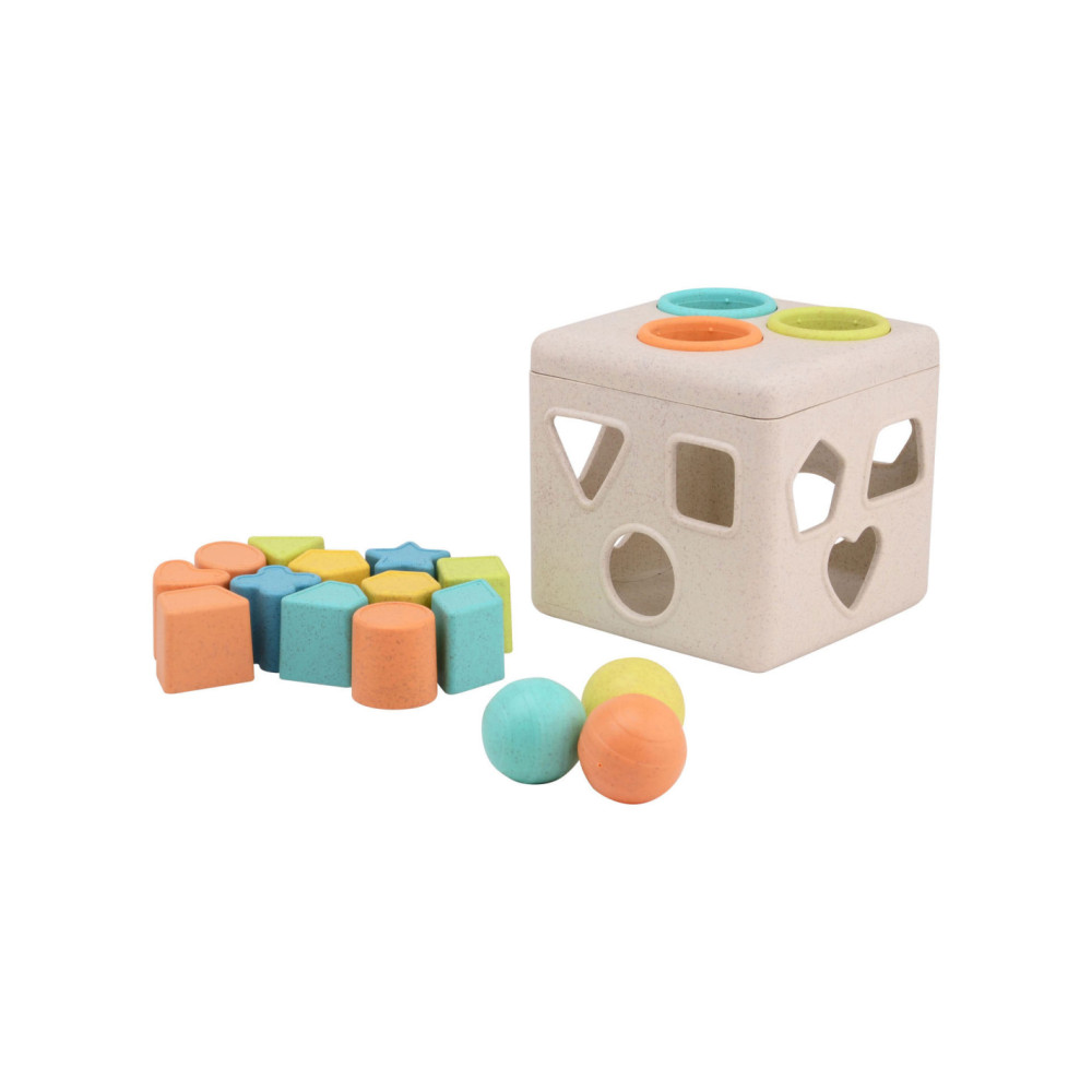 Vormenstoof met meerdere figuren en ballen om door de deksel te doen. Fijne pasteltinten. De vormenstoof is gemaakt van Bio Plastic. De afmeting is 15 bij 15 bij 15 centimeter. Geschikt voor kinderen vanaf 12 maanden.