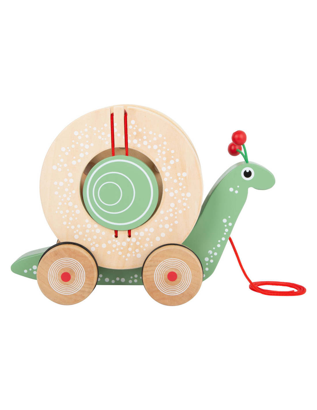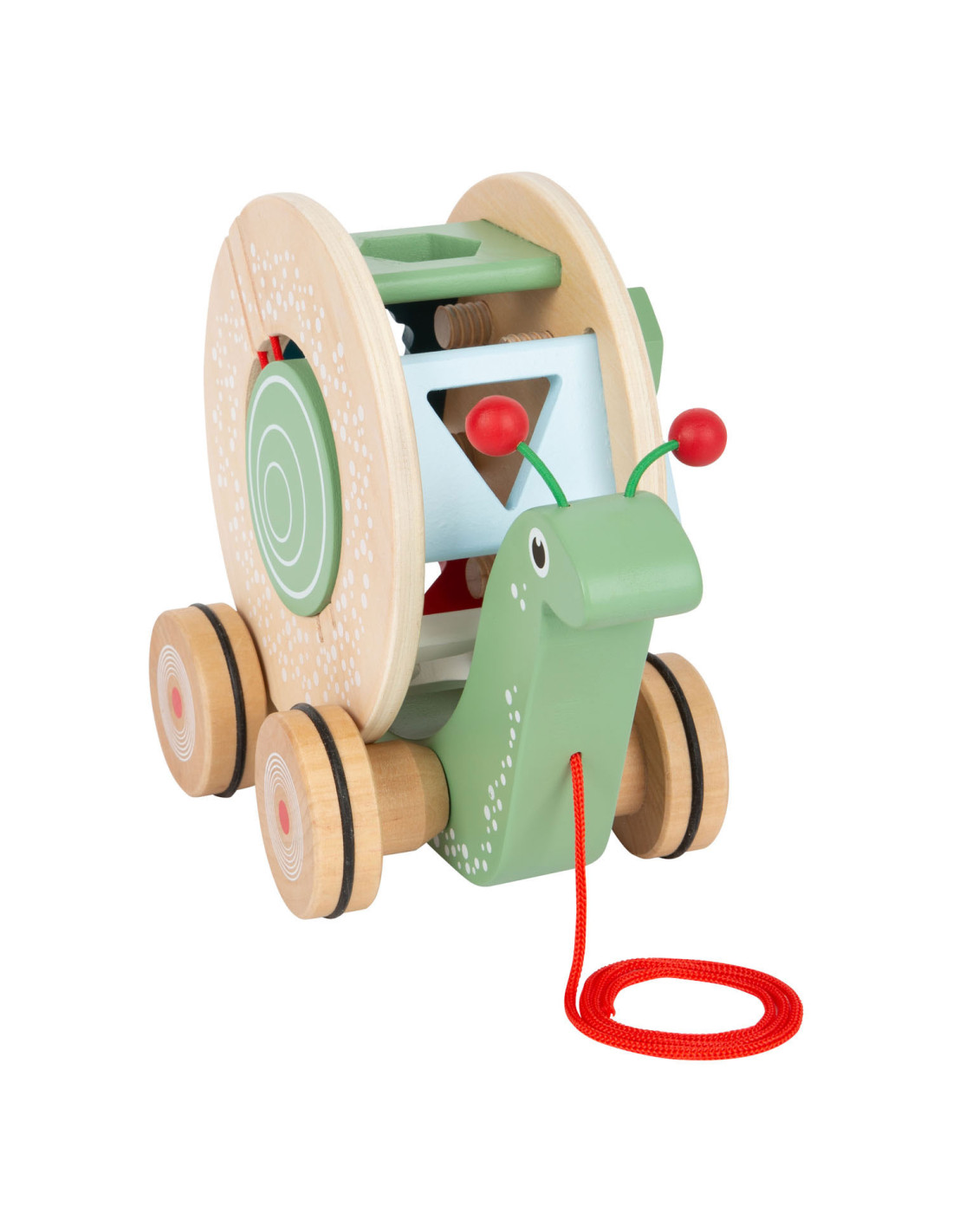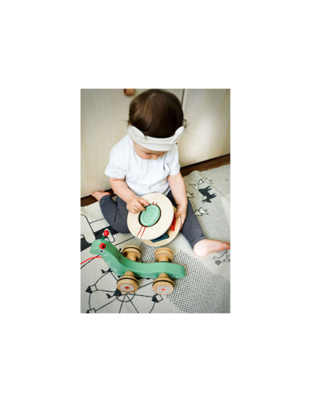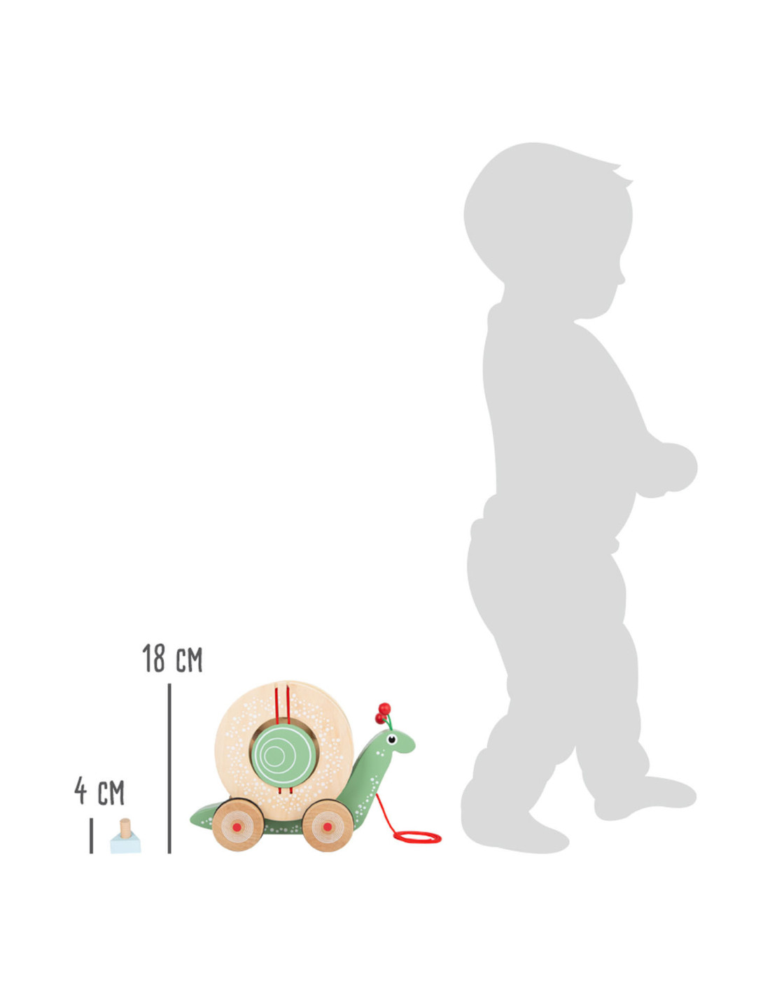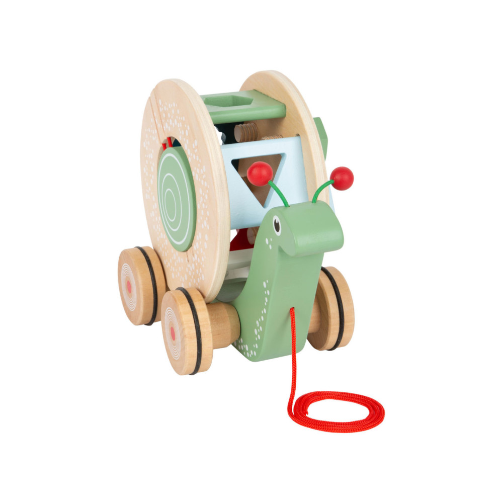 Schiet op, kleine slak! Deze houten trekslak met elastische voelsprieten, vriendelijke ogen en met rubber afgewerkte wielen inspireert kinderen om te leren lopen en is tegelijkertijd een slim motorisch speelgoed voor het inbrengen van vormen en het gebruik van schroeven. Wanneer eraan wordt getrokken, draait het verwijderbare slakkenhuis en zorgen ervoor dat de insteekstukken binnenin geluid maken. Deze stukken kunnen ook met hun schroefdraad op de tweede zijde van het slakkenhuis worden geschroefd, en dankzij de kleurgecodeerde markeringen wordt ook de herkenning van kleuren en vormen getraind. De mix van natuurlijk, onbehandeld hout en moderne kleuren maakt van dit trekdier een echte eyecatcher!