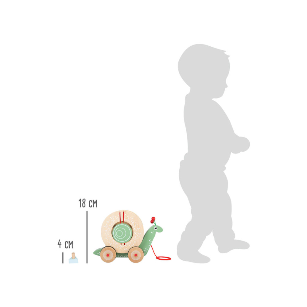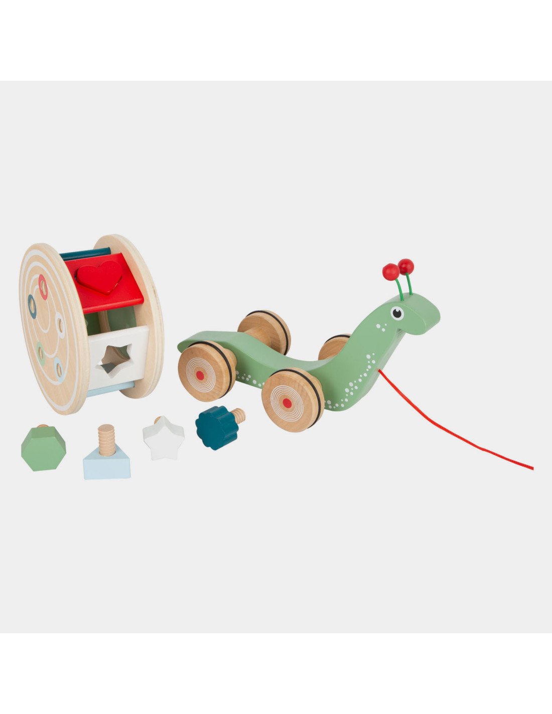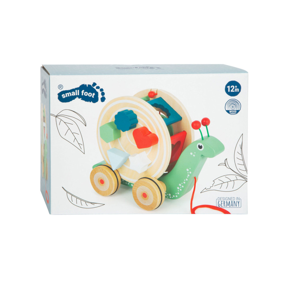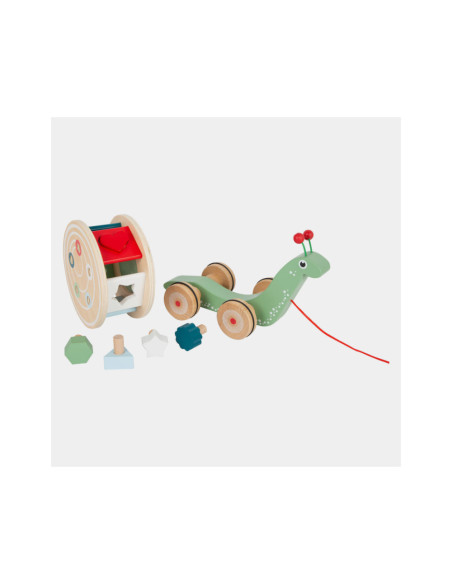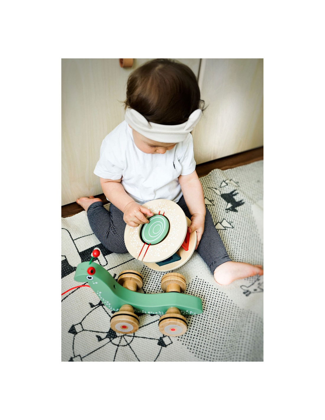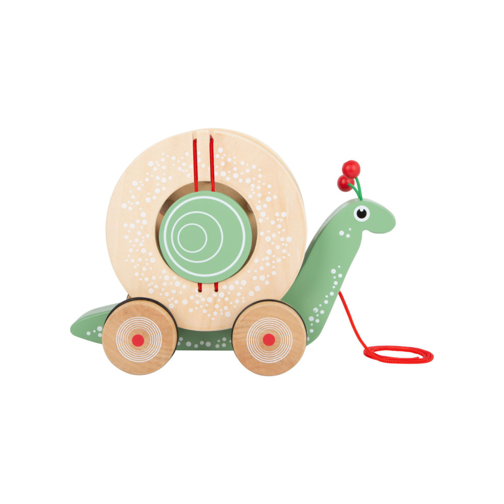 Schiet op, kleine slak! Deze houten trekslak met elastische voelsprieten, vriendelijke ogen en met rubber afgewerkte wielen inspireert kinderen om te leren lopen en is tegelijkertijd een slim motorisch speelgoed voor het inbrengen van vormen en het gebruik van schroeven. Wanneer eraan wordt getrokken, draait het verwijderbare slakkenhuis en zorgen ervoor dat de insteekstukken binnenin geluid maken. Deze stukken kunnen ook met hun schroefdraad op de tweede zijde van het slakkenhuis worden geschroefd, en dankzij de kleurgecodeerde markeringen wordt ook de herkenning van kleuren en vormen getraind. De mix van natuurlijk, onbehandeld hout en moderne kleuren maakt van dit trekdier een echte eyecatcher!