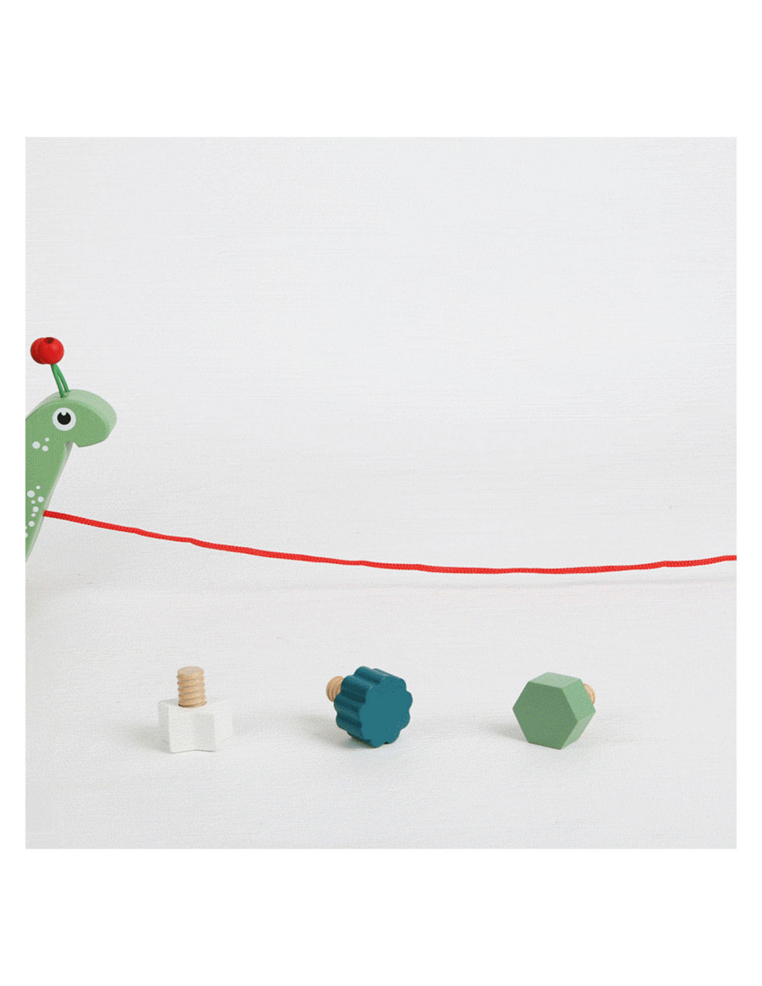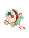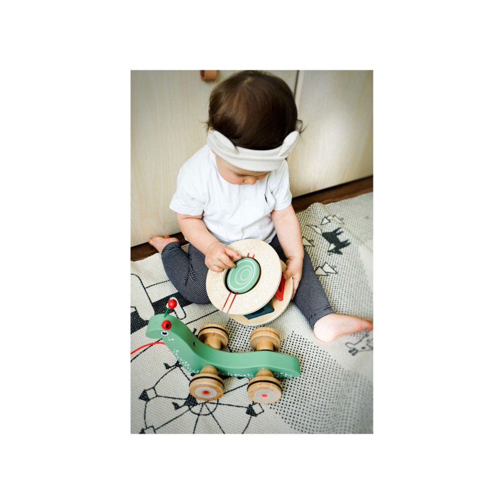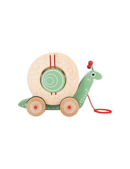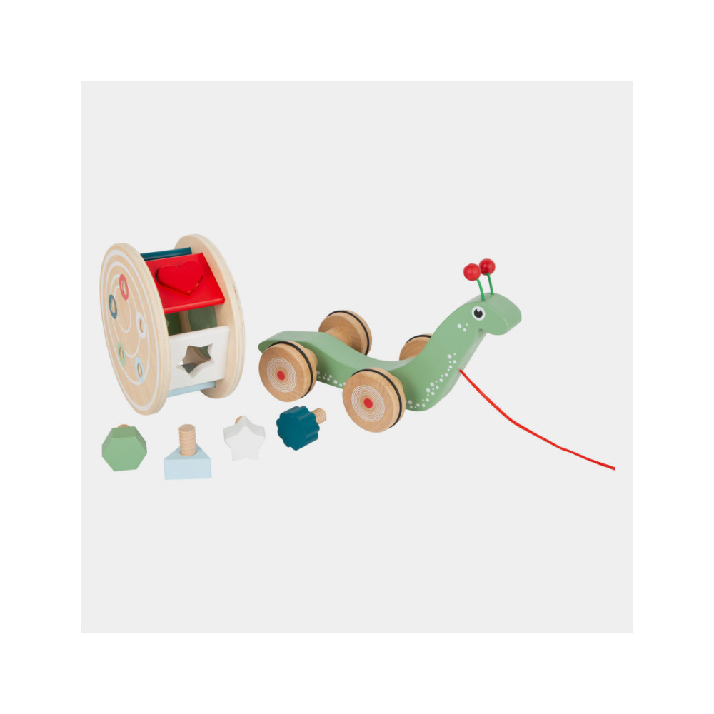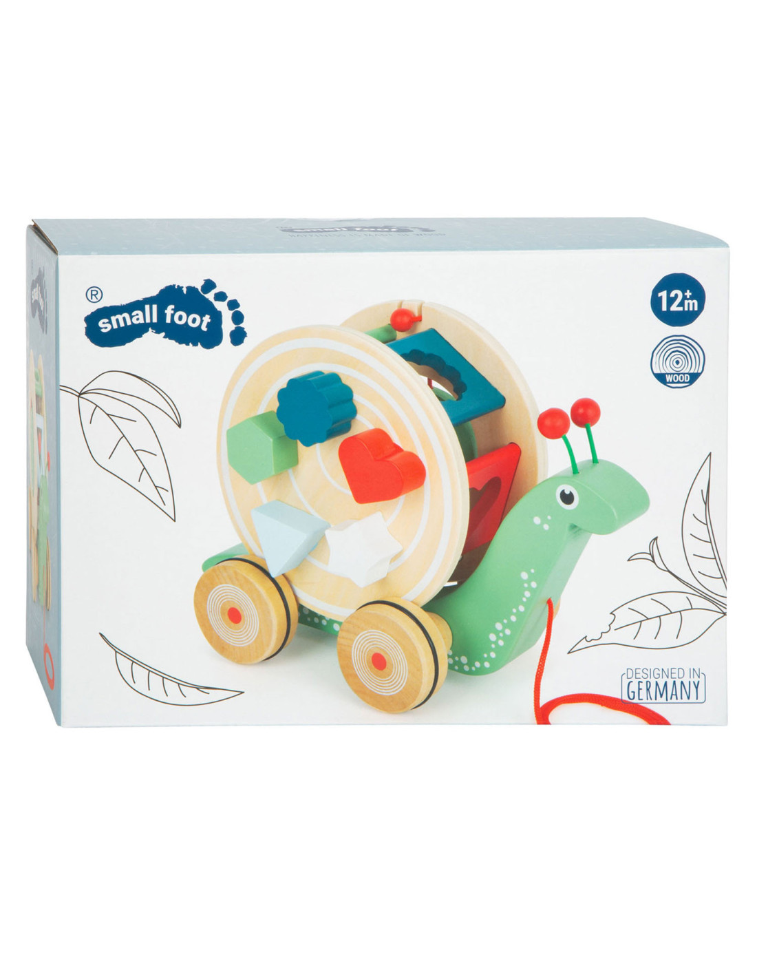 Schiet op, kleine slak! Deze houten trekslak met elastische voelsprieten, vriendelijke ogen en met rubber afgewerkte wielen inspireert kinderen om te leren lopen en is tegelijkertijd een slim motorisch speelgoed voor het inbrengen van vormen en het gebruik van schroeven. Wanneer eraan wordt getrokken, draait het verwijderbare slakkenhuis en zorgen ervoor dat de insteekstukken binnenin geluid maken. Deze stukken kunnen ook met hun schroefdraad op de tweede zijde van het slakkenhuis worden geschroefd, en dankzij de kleurgecodeerde markeringen wordt ook de herkenning van kleuren en vormen getraind. De mix van natuurlijk, onbehandeld hout en moderne kleuren maakt van dit trekdier een echte eyecatcher!