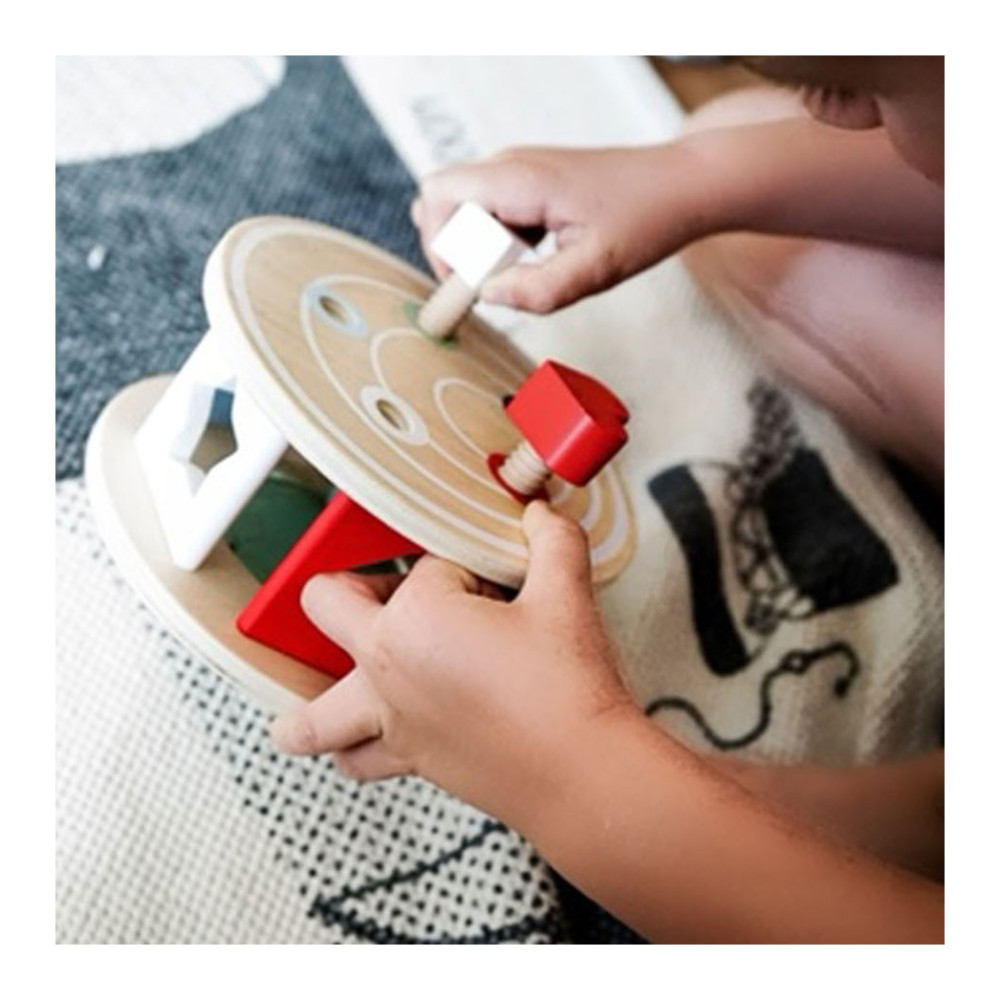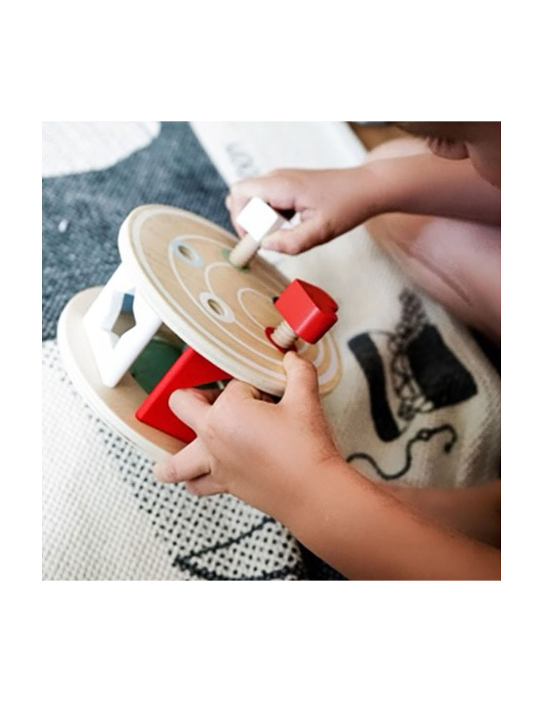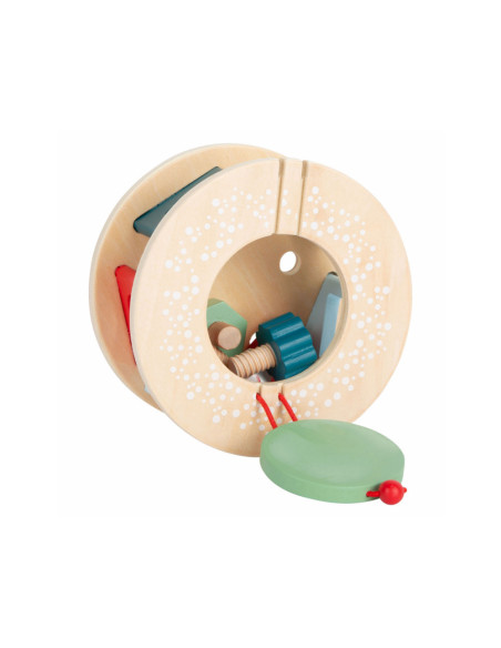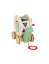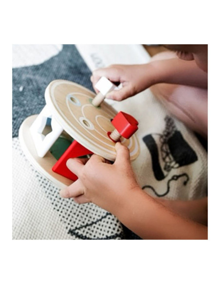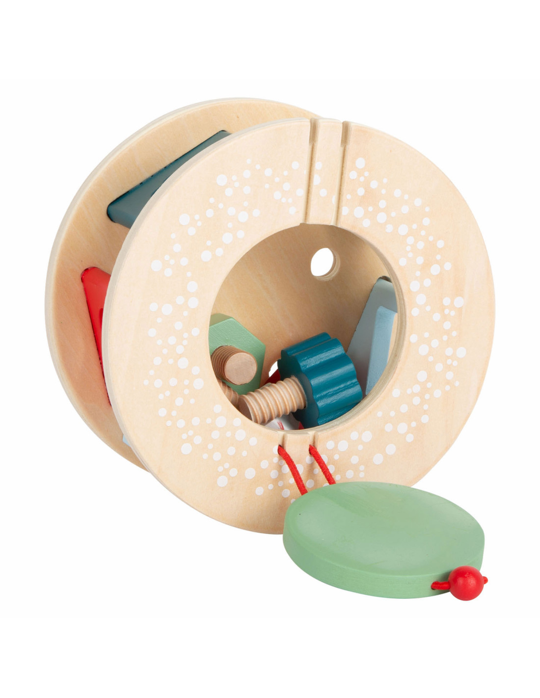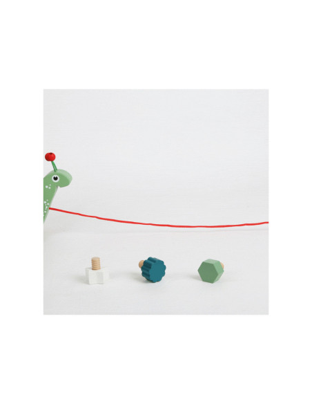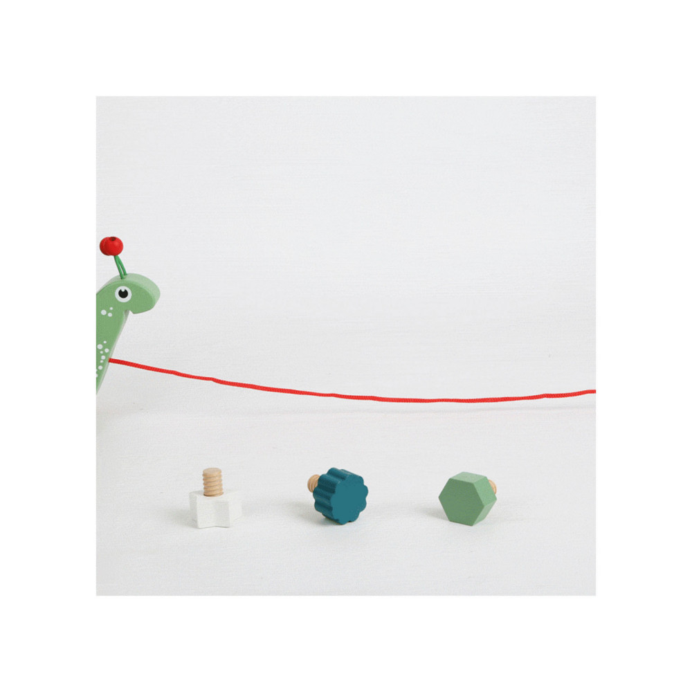 Schiet op, kleine slak! Deze houten trekslak met elastische voelsprieten, vriendelijke ogen en met rubber afgewerkte wielen inspireert kinderen om te leren lopen en is tegelijkertijd een slim motorisch speelgoed voor het inbrengen van vormen en het gebruik van schroeven. Wanneer eraan wordt getrokken, draait het verwijderbare slakkenhuis en zorgen ervoor dat de insteekstukken binnenin geluid maken. Deze stukken kunnen ook met hun schroefdraad op de tweede zijde van het slakkenhuis worden geschroefd, en dankzij de kleurgecodeerde markeringen wordt ook de herkenning van kleuren en vormen getraind. De mix van natuurlijk, onbehandeld hout en moderne kleuren maakt van dit trekdier een echte eyecatcher!