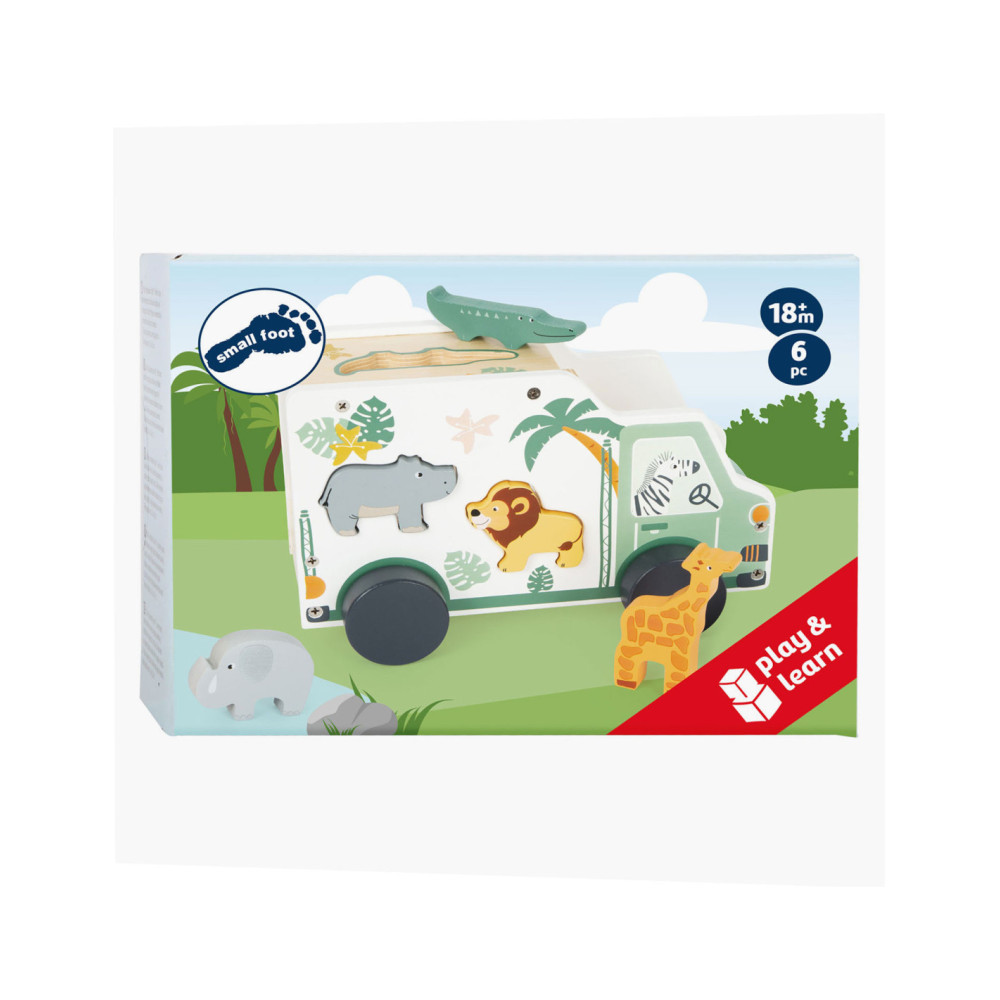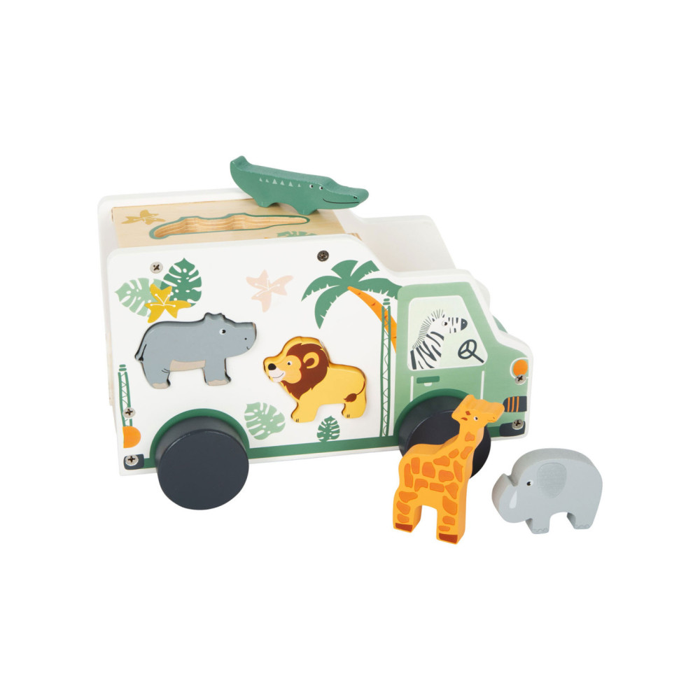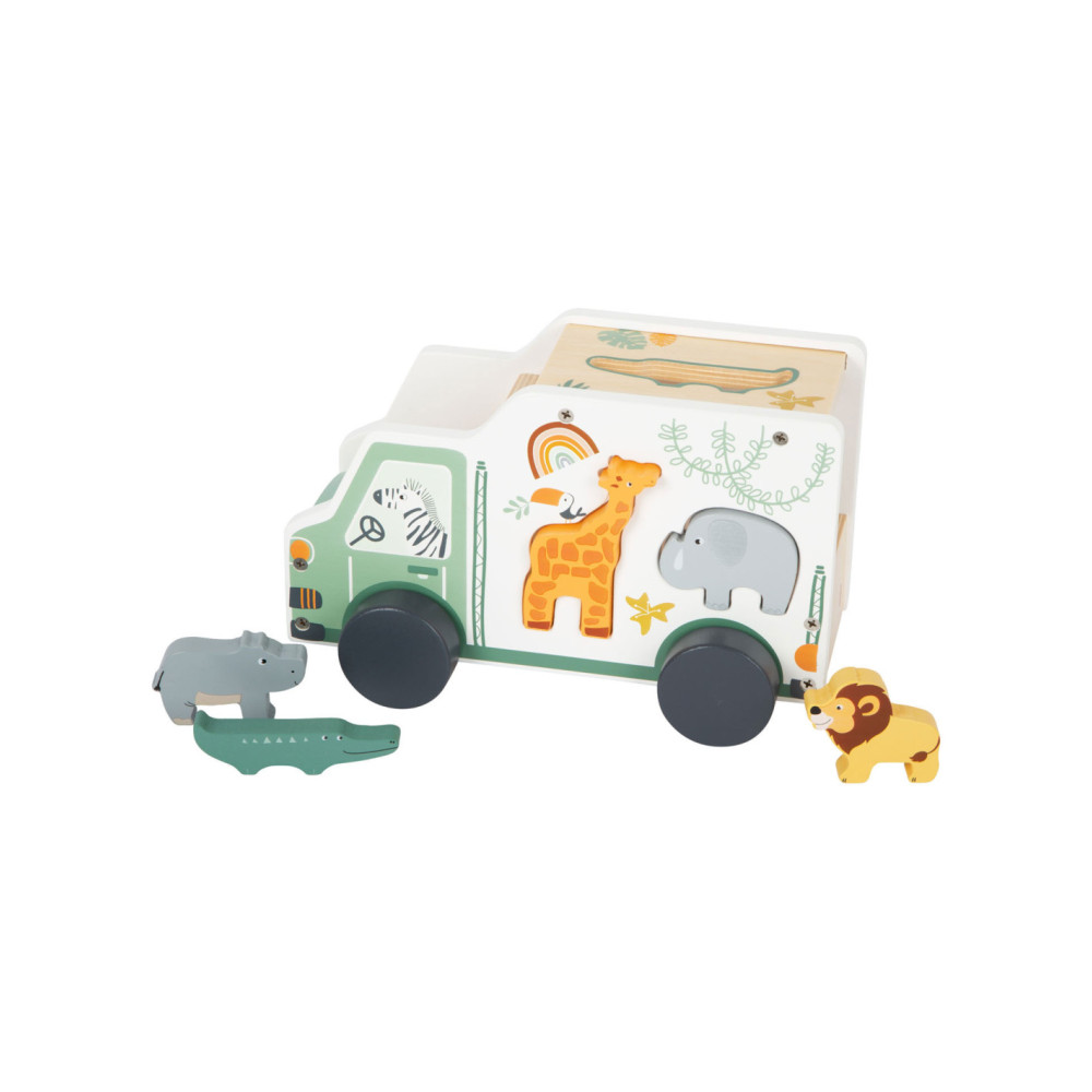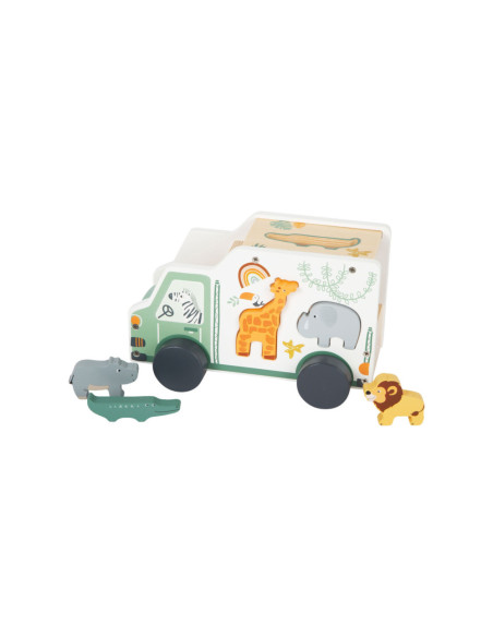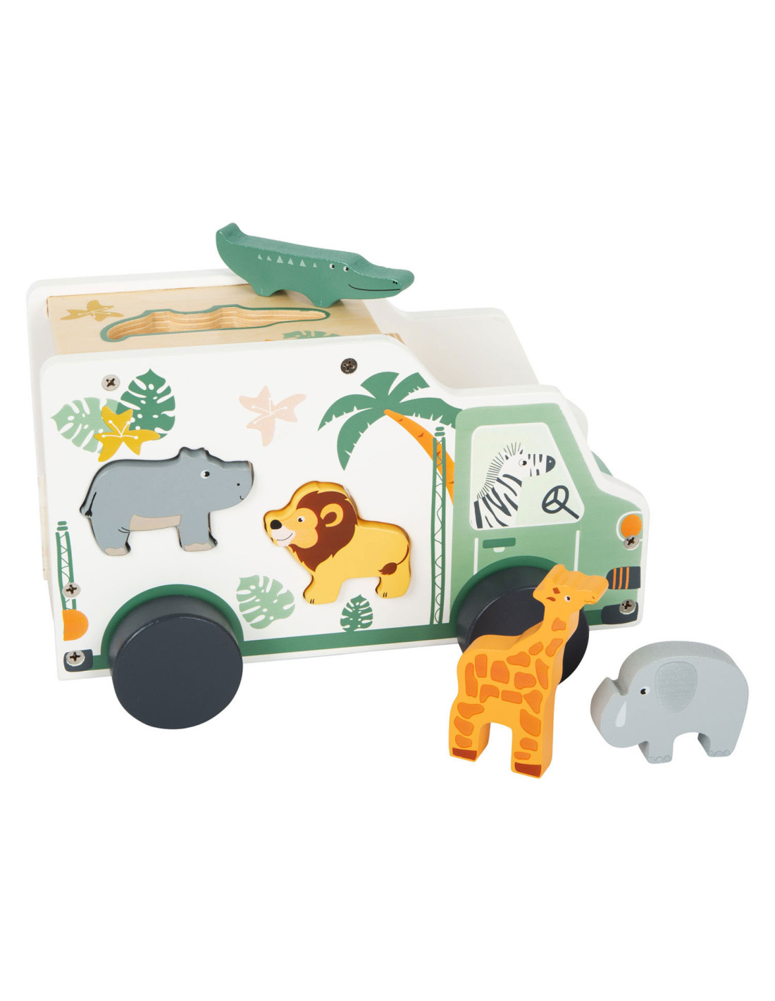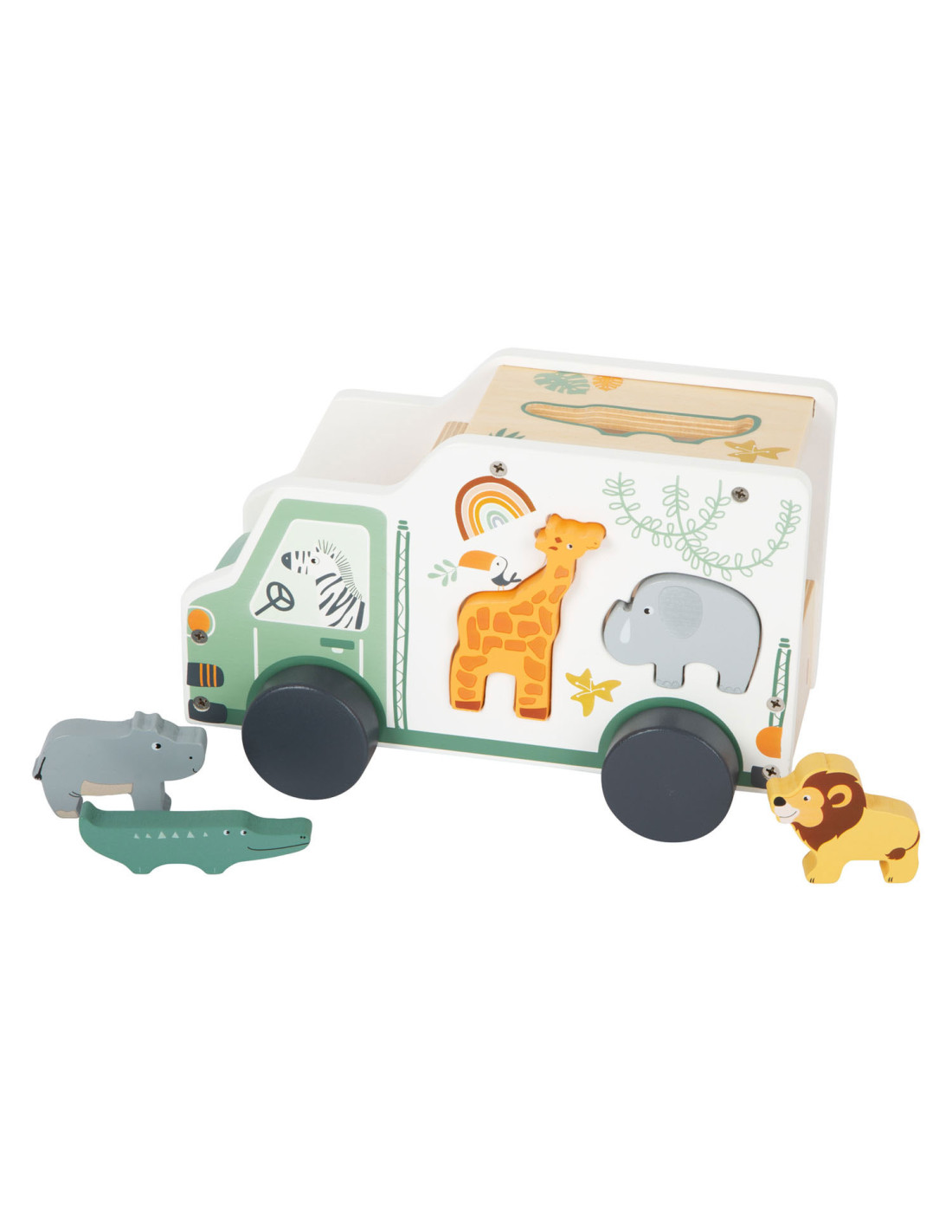 Een vormspel en een houten speelgoedauto vormen samen een geheel! Met dit houten vormspel in populaire safari-look maken de giraf, nijlpaard, leeuw en hun vrienden een tocht door de wildernis terwijl de vriendelijke zebra het houten voertuig bestuurt. De safaribus heeft in totaal vijf insteekgaten in diervormen aan alle kanten waardoor de bijpassende figuren kunnen worden gestoken.