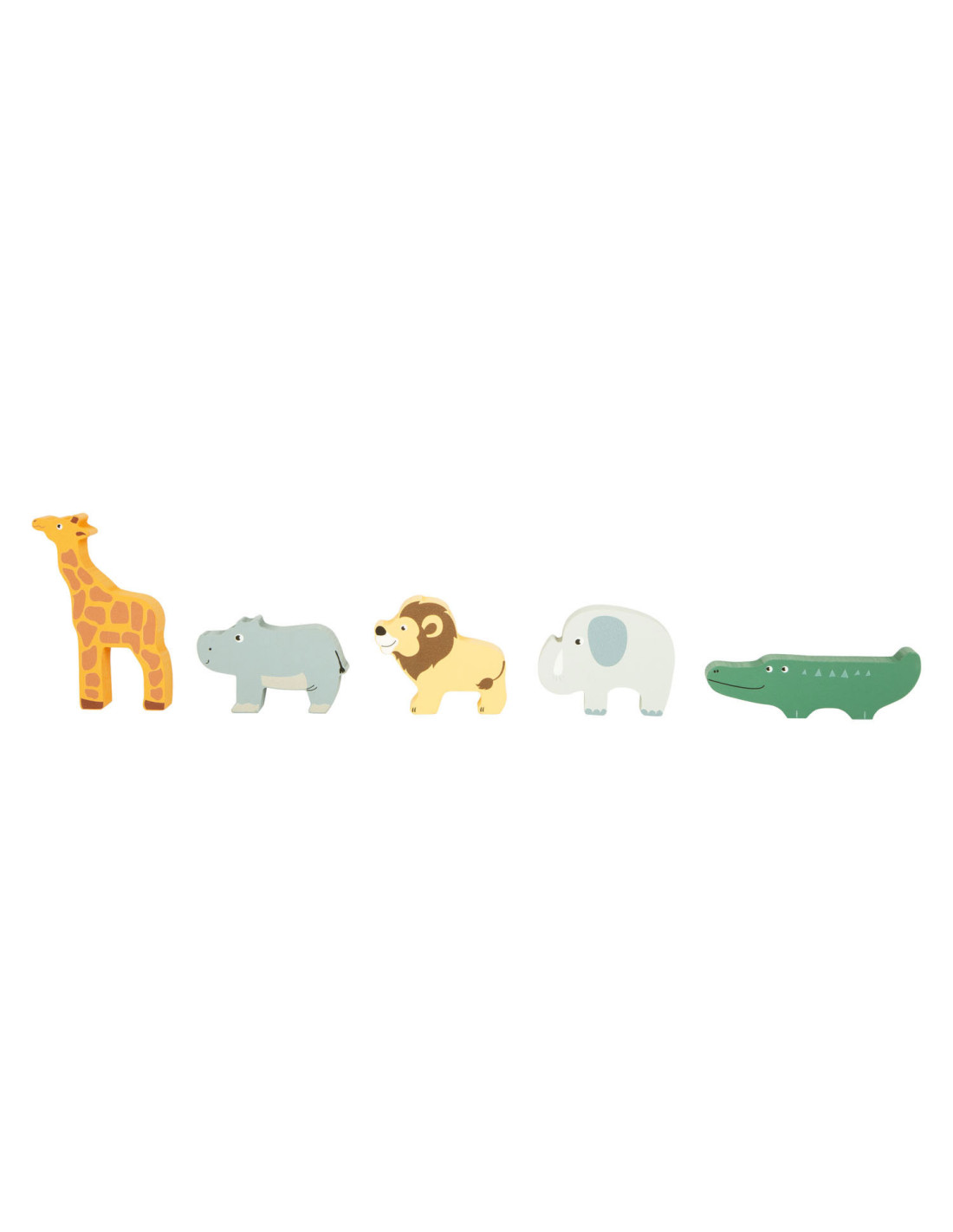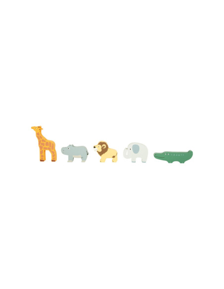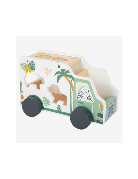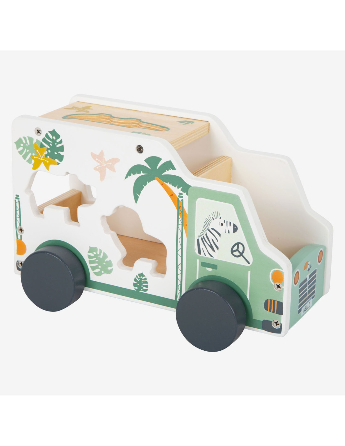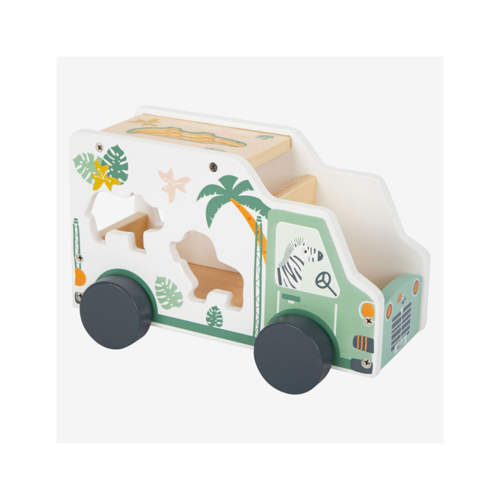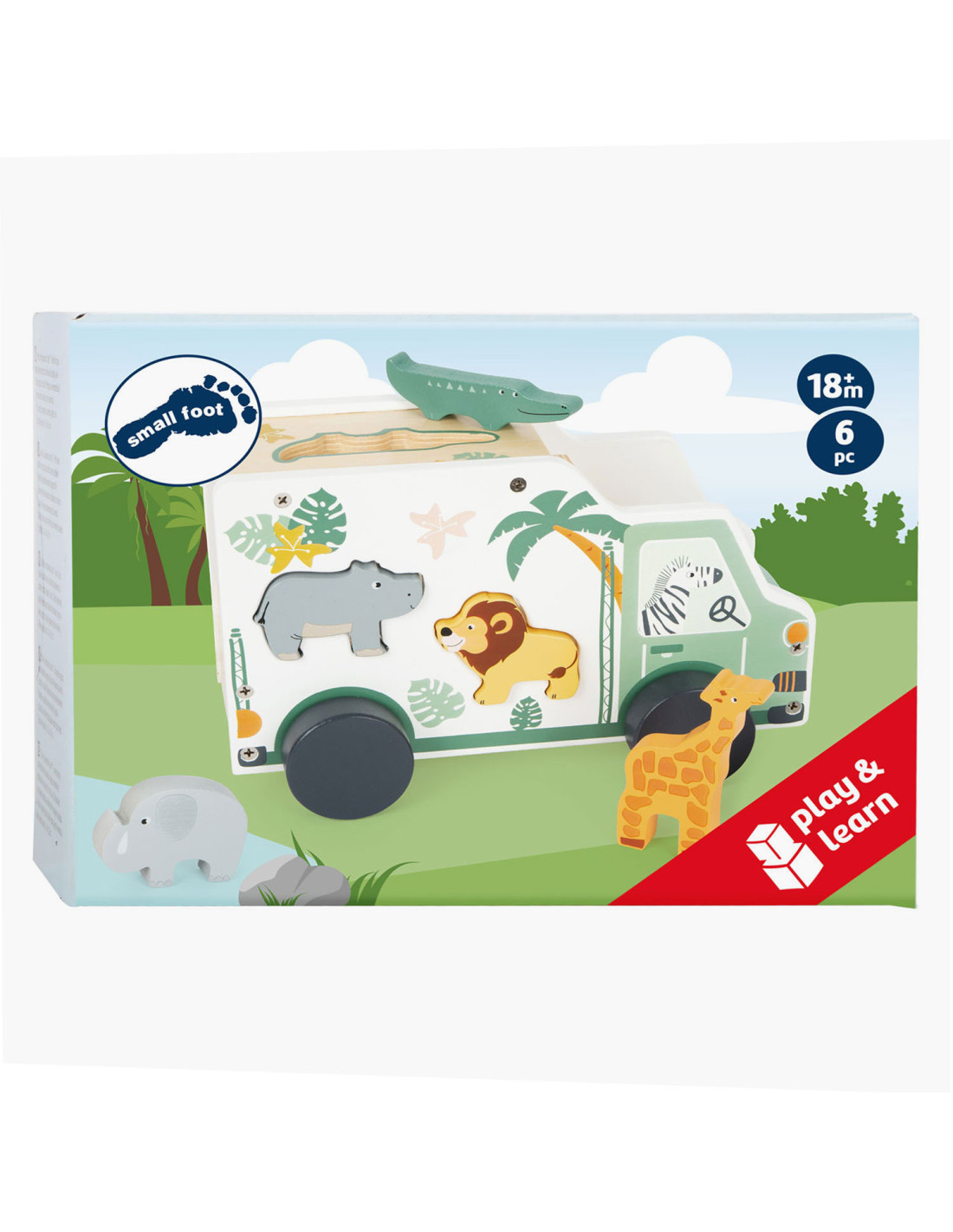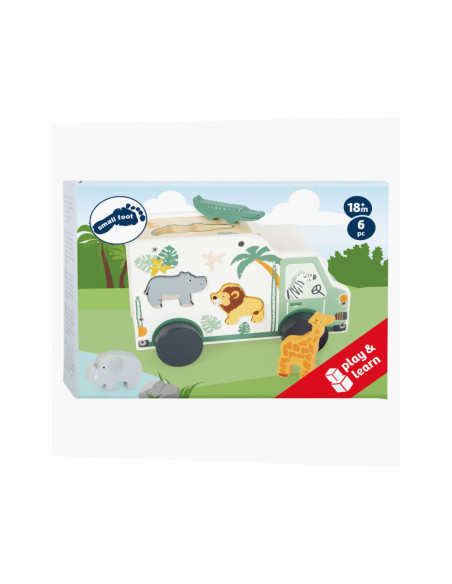 Een vormspel en een houten speelgoedauto vormen samen een geheel! Met dit houten vormspel in populaire safari-look maken de giraf, nijlpaard, leeuw en hun vrienden een tocht door de wildernis terwijl de vriendelijke zebra het houten voertuig bestuurt. De safaribus heeft in totaal vijf insteekgaten in diervormen aan alle kanten waardoor de bijpassende figuren kunnen worden gestoken.