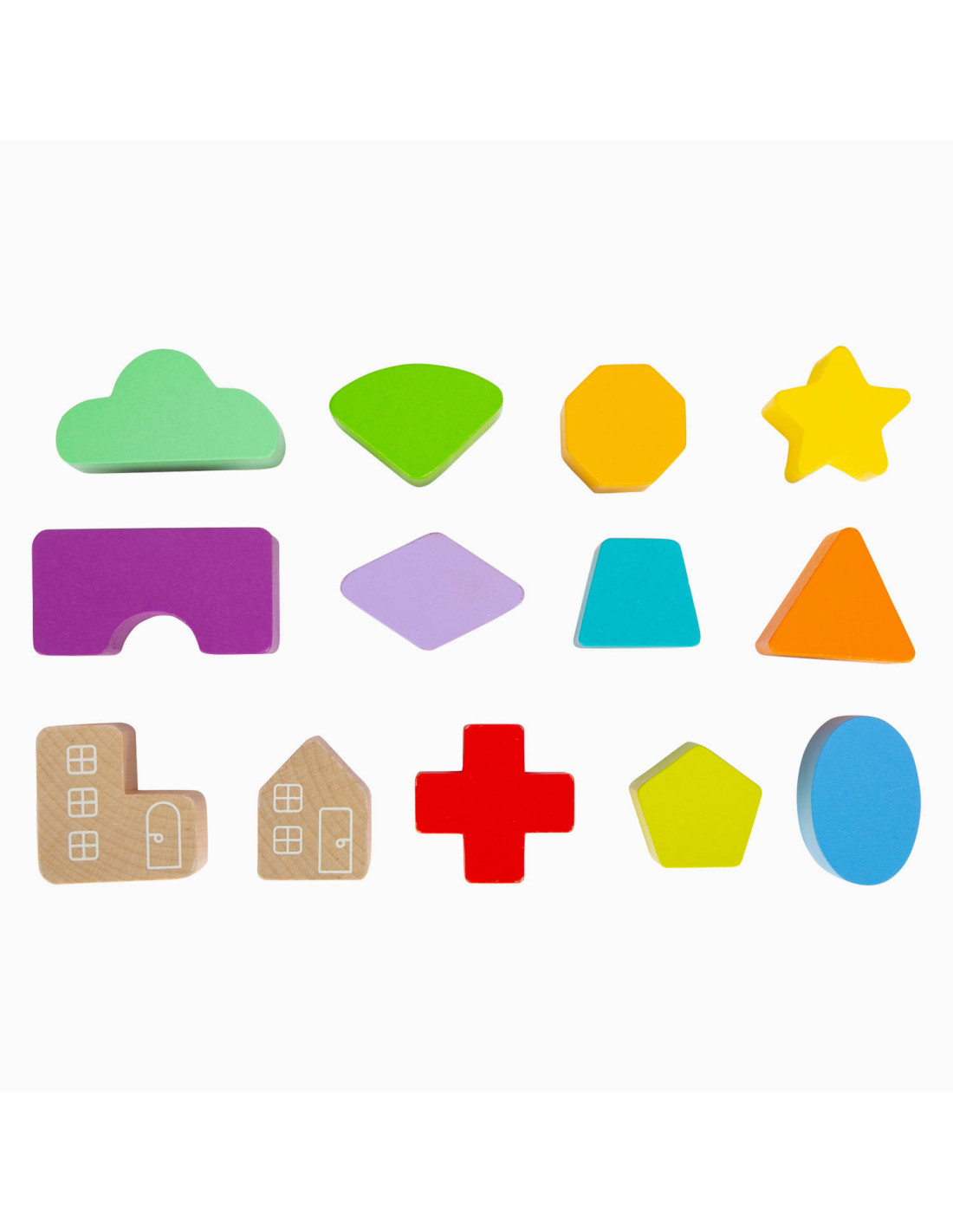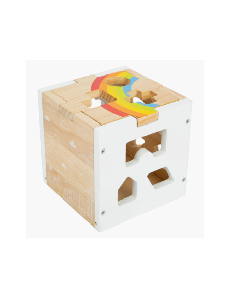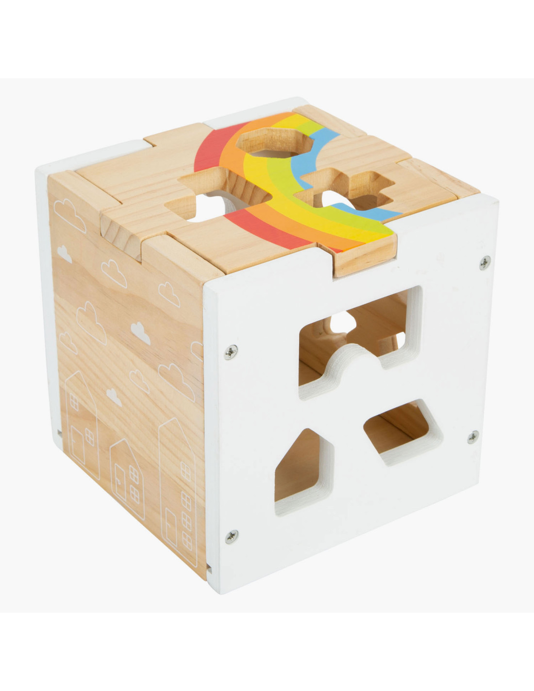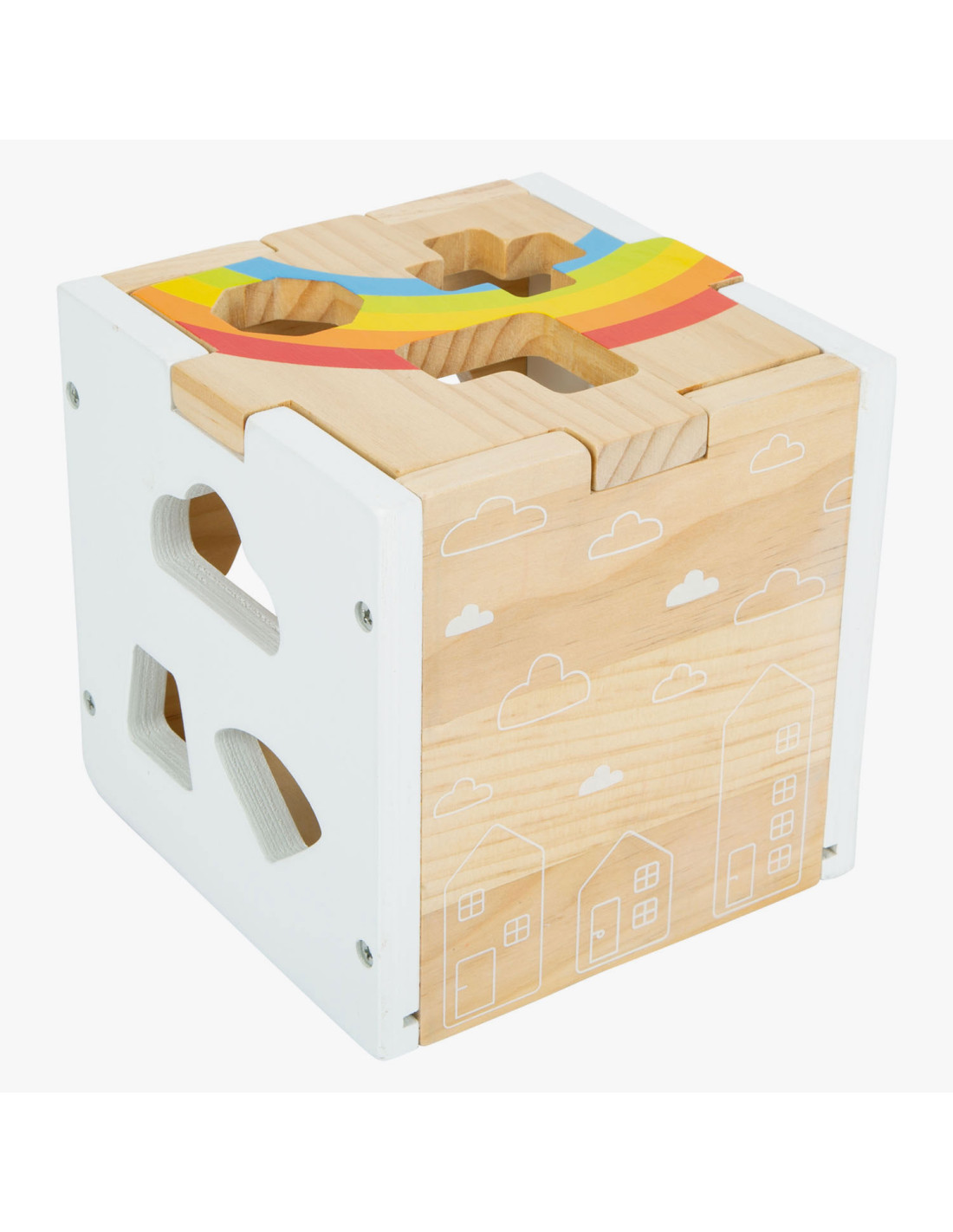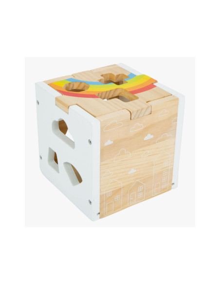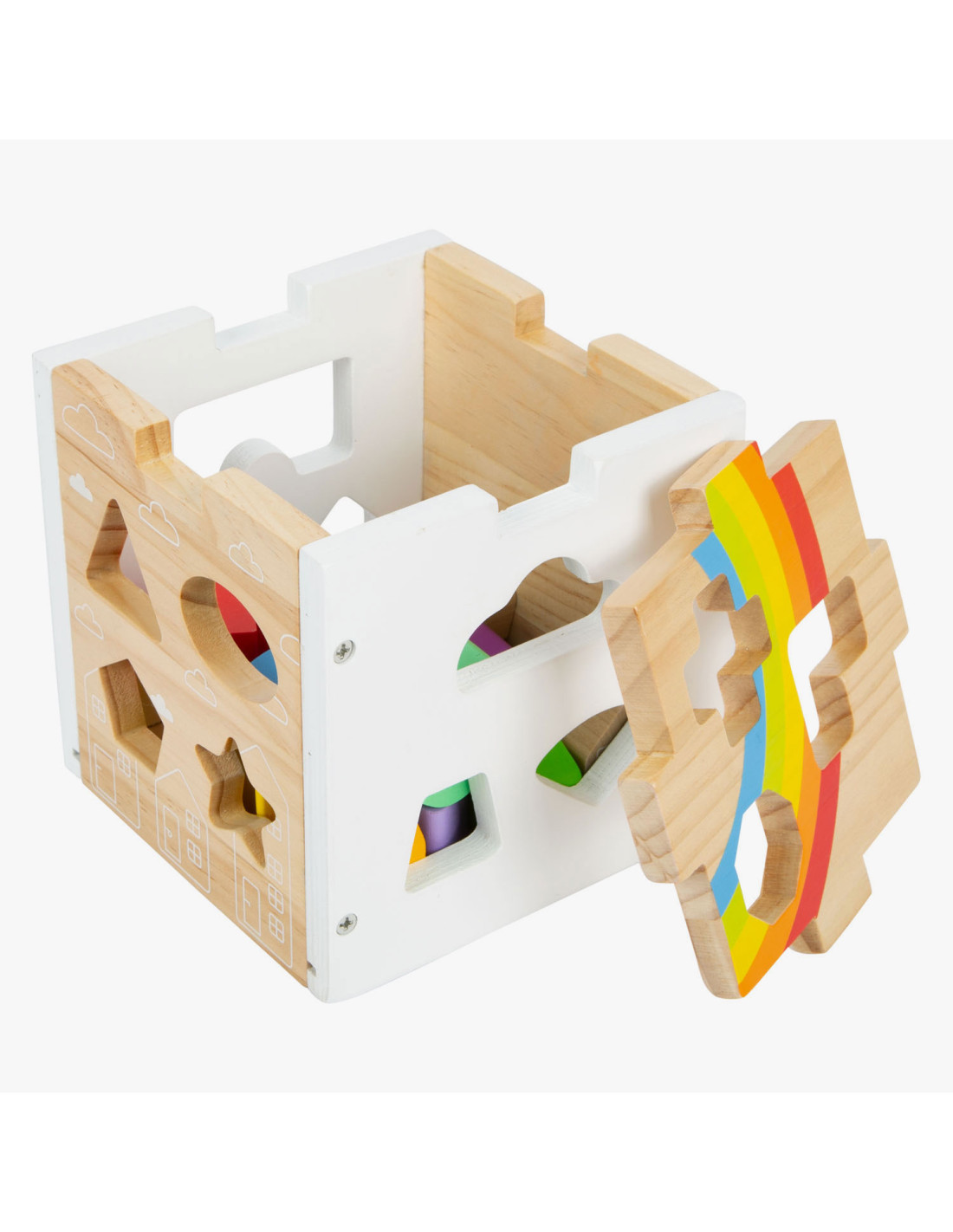 Deze moderne vormvaste vormenstoof van robuust hout combineert eenvoudig wit, heldere regenboogkleuren en goed zichtbare massief houten elementen. De 13 verschillend gevormde en gekleurde elementen trainen kinderen de herkenning van kleuren en vormen en hun motorische vaardigheden. Naast de klassieke geometrische vormen zitten er ook figuren van wolken, sterren en huizen bij!