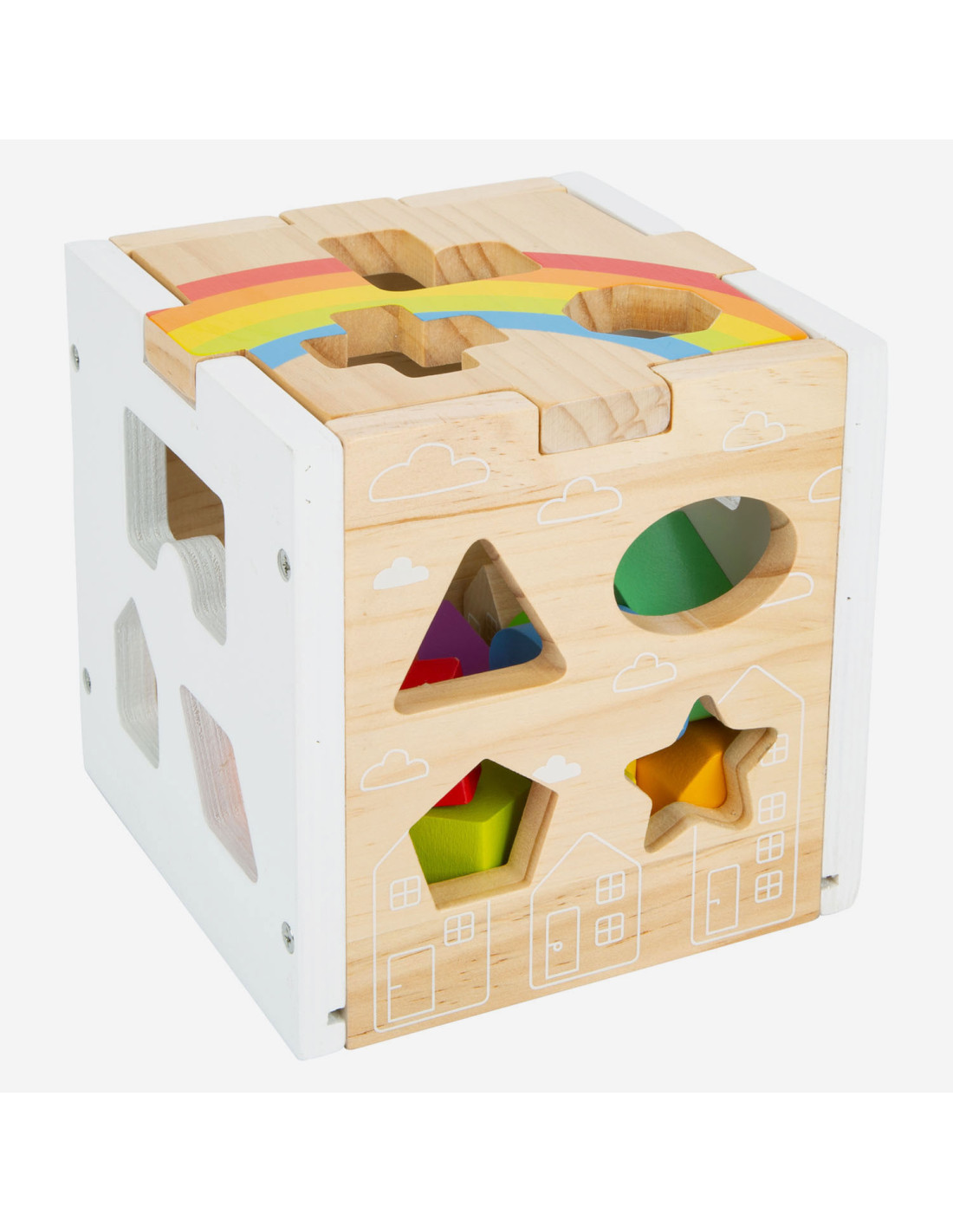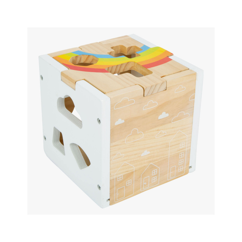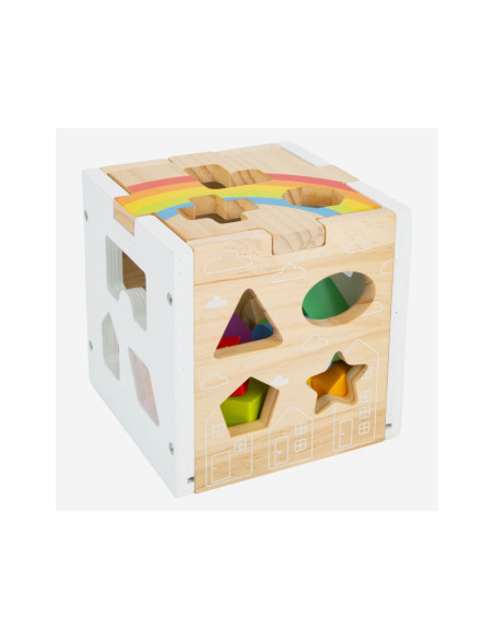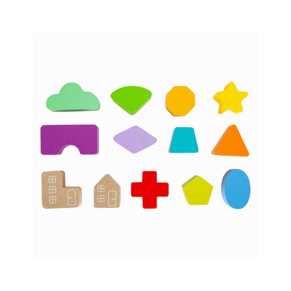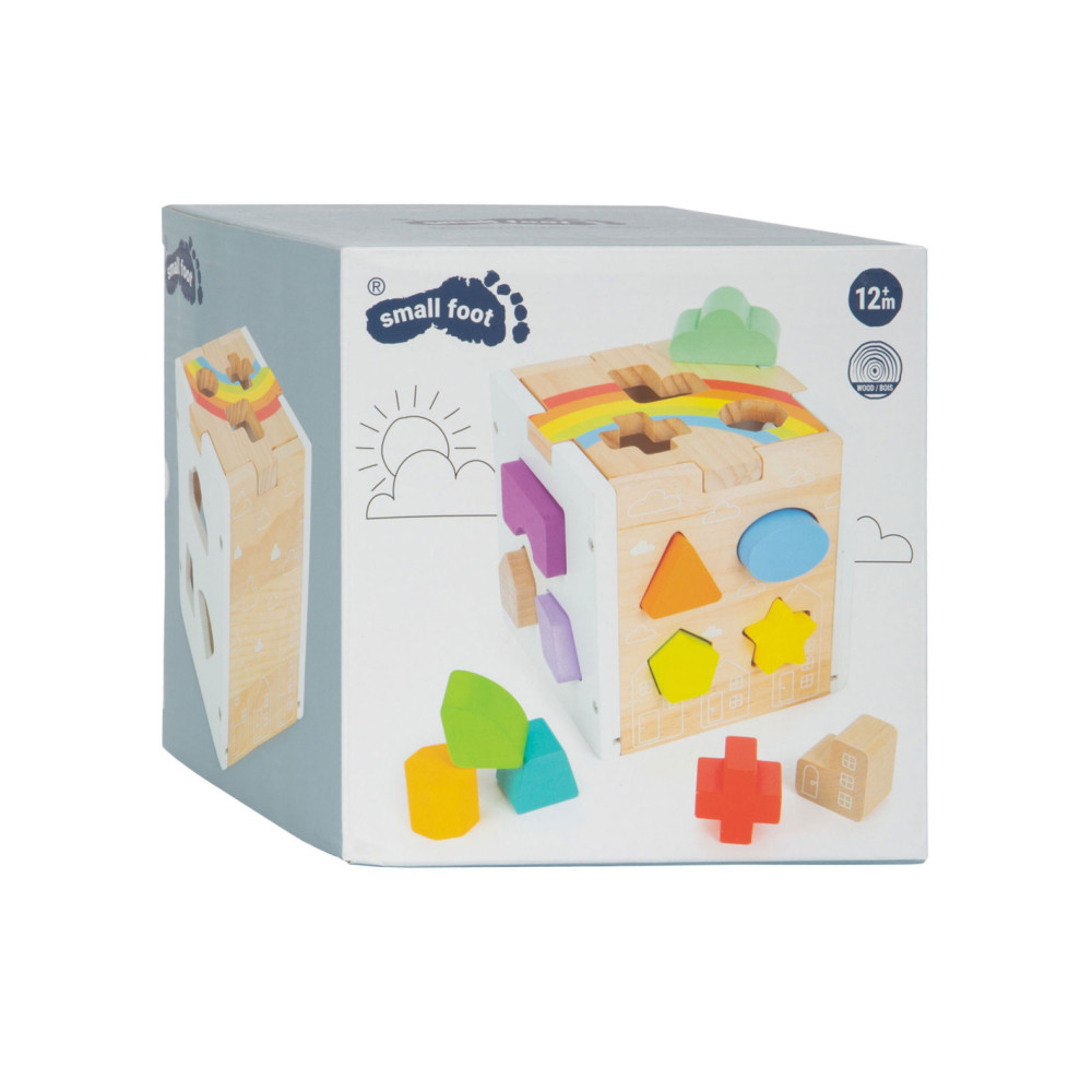 Deze moderne vormvaste vormenstoof van robuust hout combineert eenvoudig wit, heldere regenboogkleuren en goed zichtbare massief houten elementen. De 13 verschillend gevormde en gekleurde elementen trainen kinderen de herkenning van kleuren en vormen en hun motorische vaardigheden. Naast de klassieke geometrische vormen zitten er ook figuren van wolken, sterren en huizen bij!