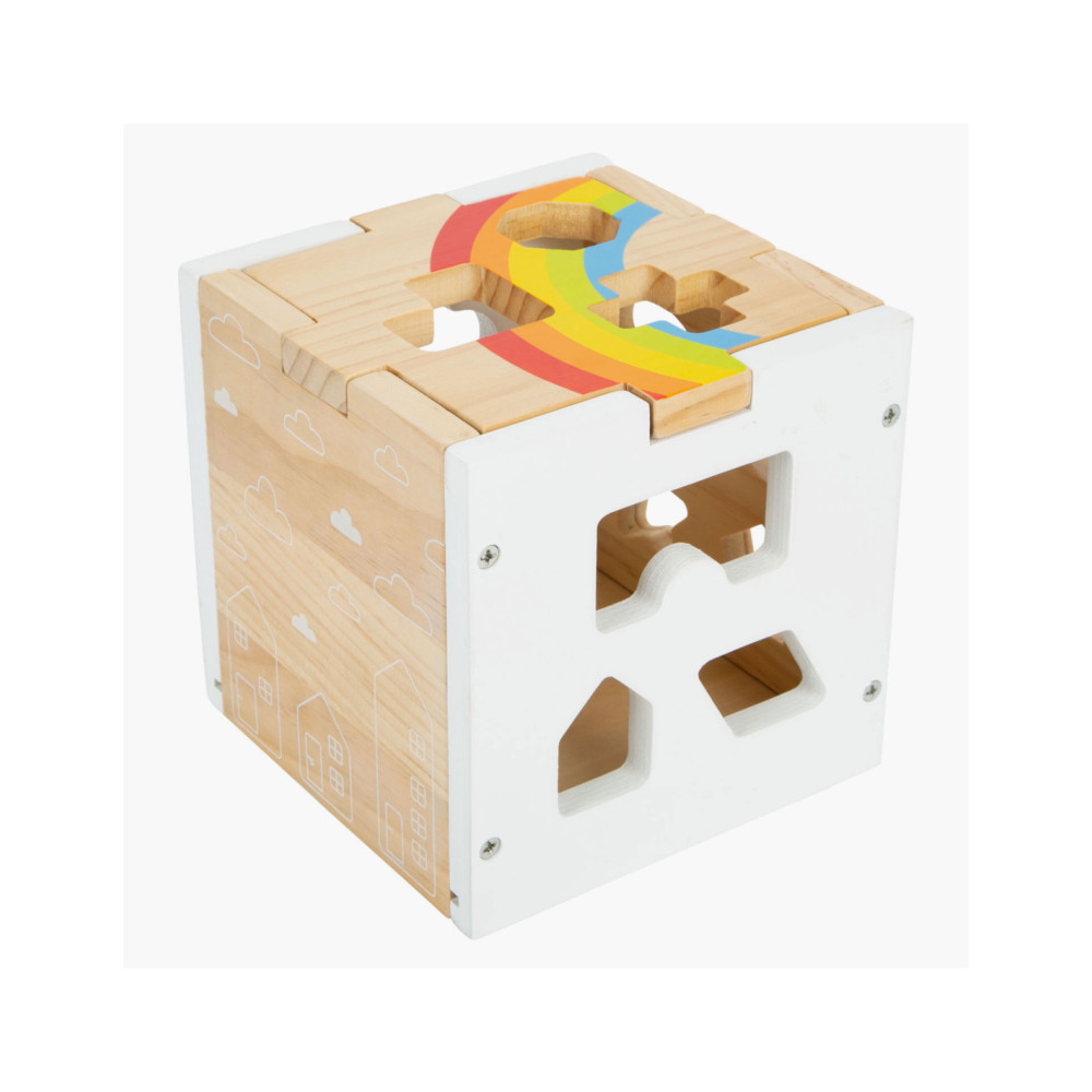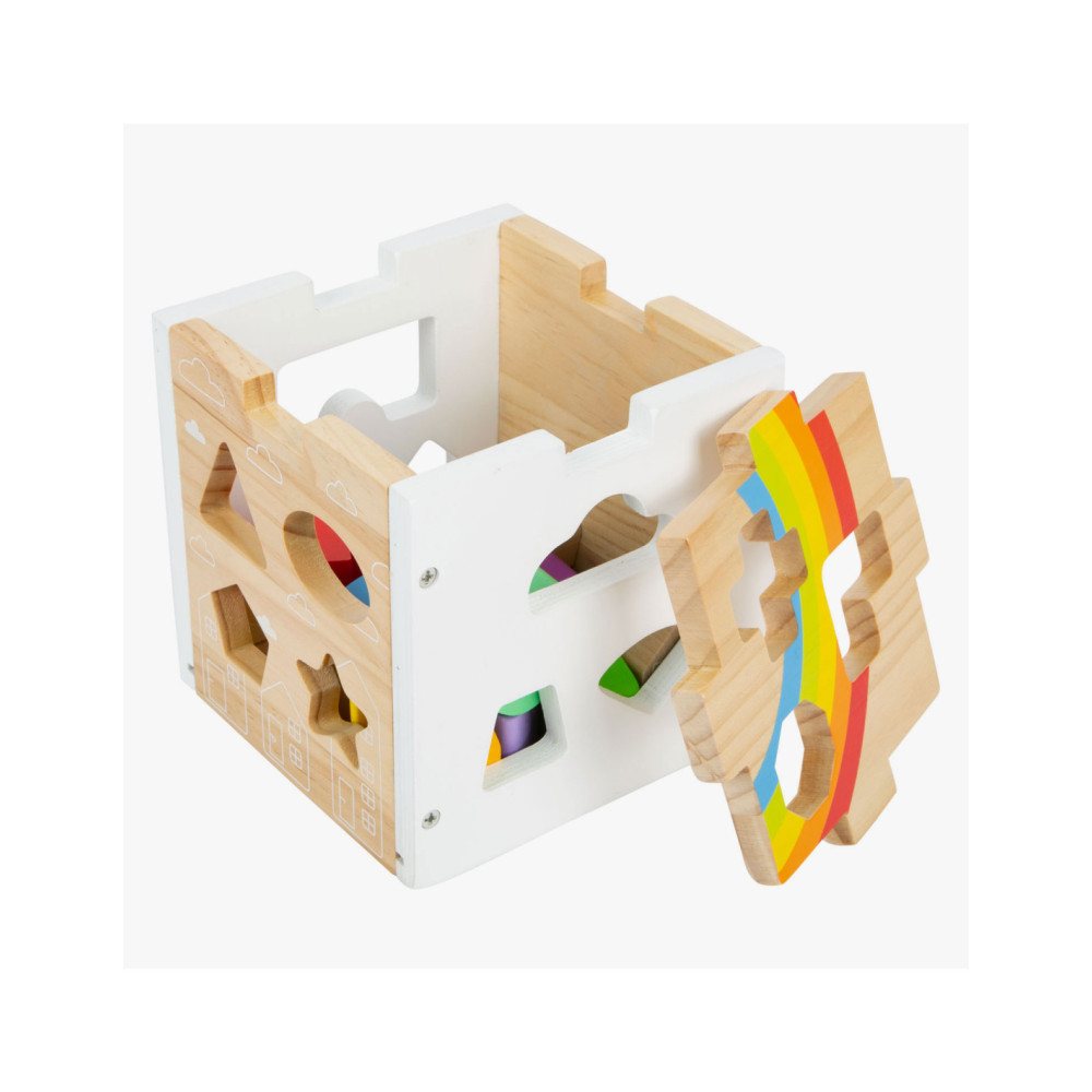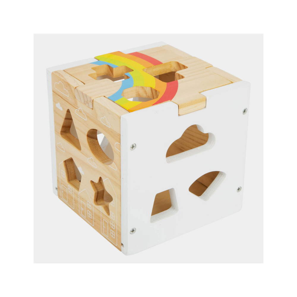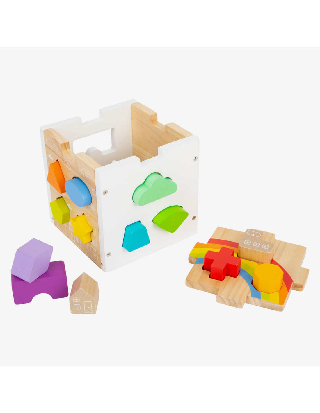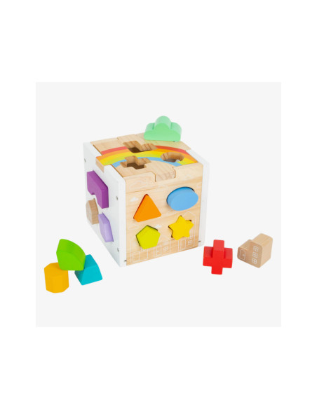 Deze moderne vormvaste vormenstoof van robuust hout combineert eenvoudig wit, heldere regenboogkleuren en goed zichtbare massief houten elementen. De 13 verschillend gevormde en gekleurde elementen trainen kinderen de herkenning van kleuren en vormen en hun motorische vaardigheden. Naast de klassieke geometrische vormen zitten er ook figuren van wolken, sterren en huizen bij!