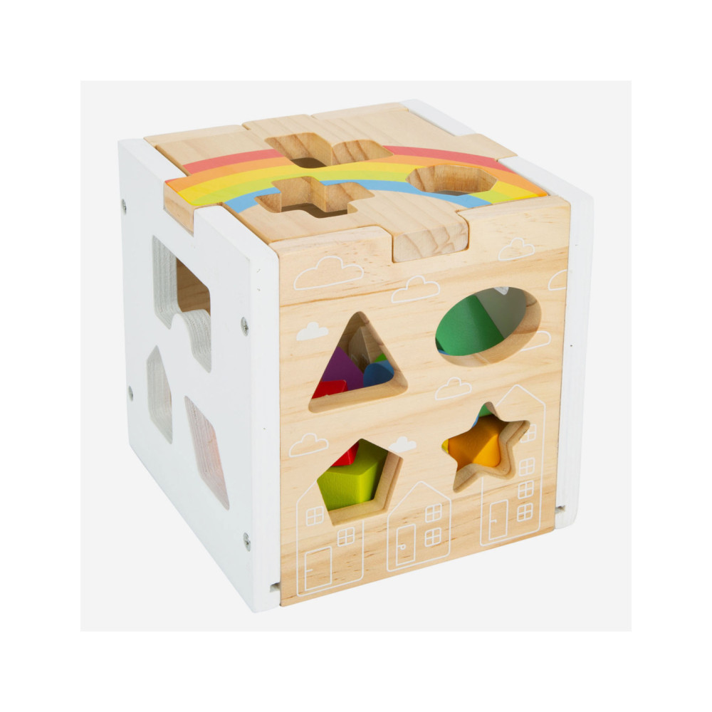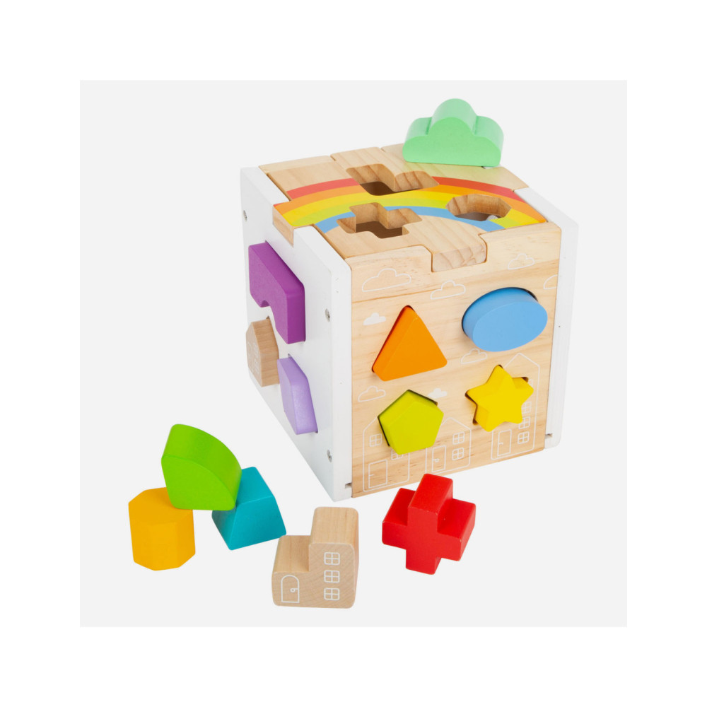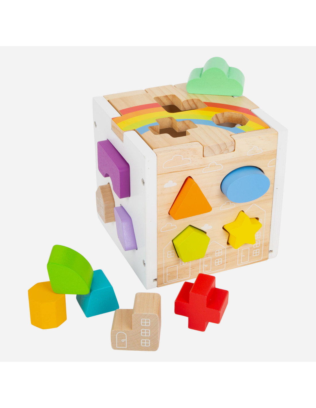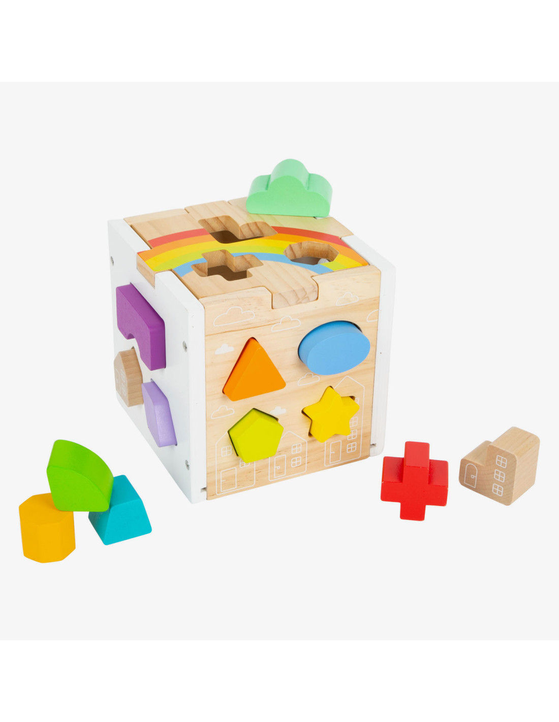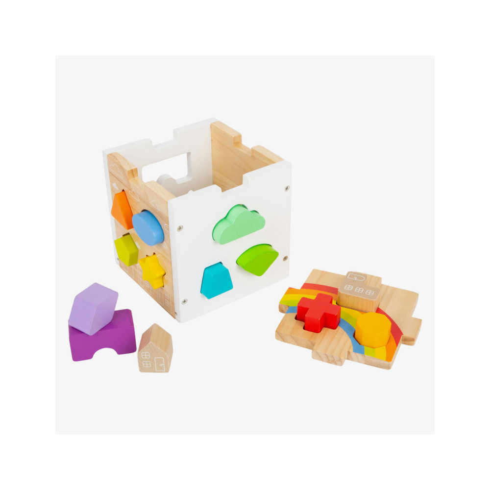 Deze moderne vormvaste vormenstoof van robuust hout combineert eenvoudig wit, heldere regenboogkleuren en goed zichtbare massief houten elementen. De 13 verschillend gevormde en gekleurde elementen trainen kinderen de herkenning van kleuren en vormen en hun motorische vaardigheden. Naast de klassieke geometrische vormen zitten er ook figuren van wolken, sterren en huizen bij!