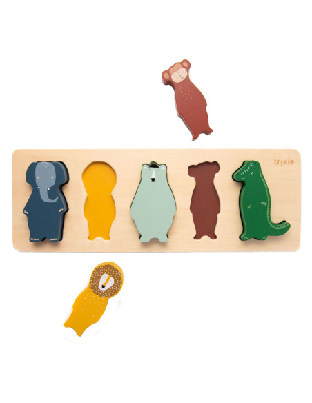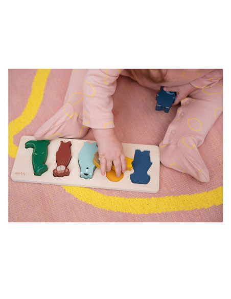 Leer al onze dierenvrienden kennen door ze een voor een op de juiste plek te zetten! De puzzelstukjes zijn dik waardoor ze gemakkelijk te hanteren zijn voor kleintjes. De stukken kunnen elk op zichzelf staan en fungeren als leuke beeldjes; goed voor urenlang fantasiespel! Deze puzzel verbetert de fijne motoriek en leert kinderen over kleur en dieren. Als je een dier verwijdert, verschijnt er een kleur. Het spelen met de dieren laat hun fantasie de vrije loop! De puzzel en dieren zijn gemaakt van 100% FSC ® gecertificeerd hout. Alle verven zijn op waterbasis en veilig voor baby's.