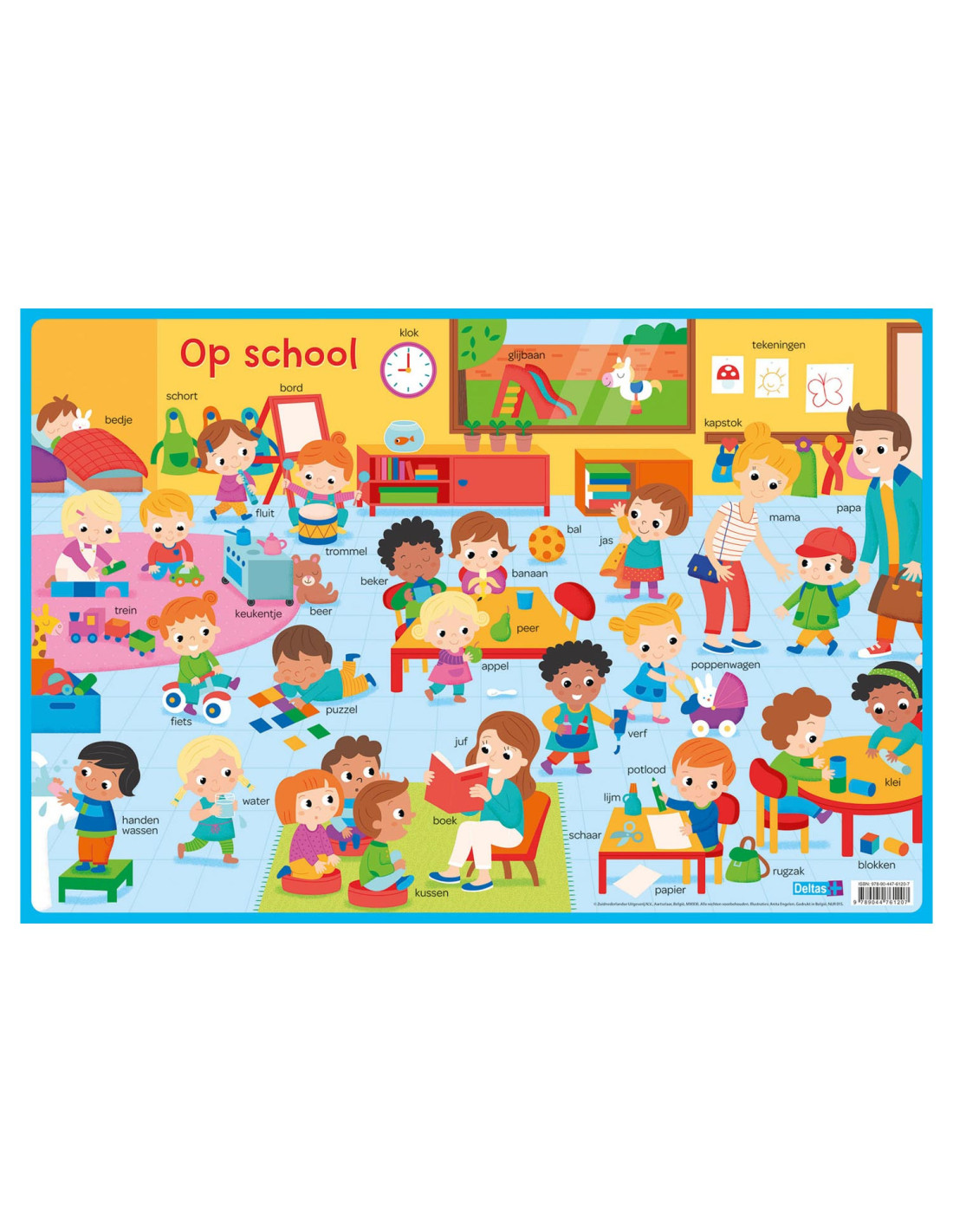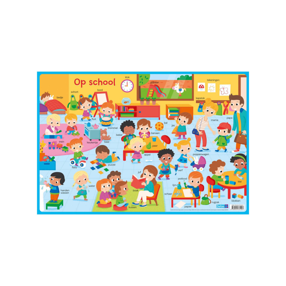 Op deze onderlegger met een vrolijke en kleurrijke illustratie vind je allemaal dingen die te maken hebben met de school: de juf leest een boek voor, Marie fietst door de klas, Liam wil gaan verven. Dankzij de woordjes die erbij staan leert je kind op een speelse manier nieuwe woordenschat. Makkelijk schoon te maken met een vochtige doek en geschikt voor contact met voedingswaren.