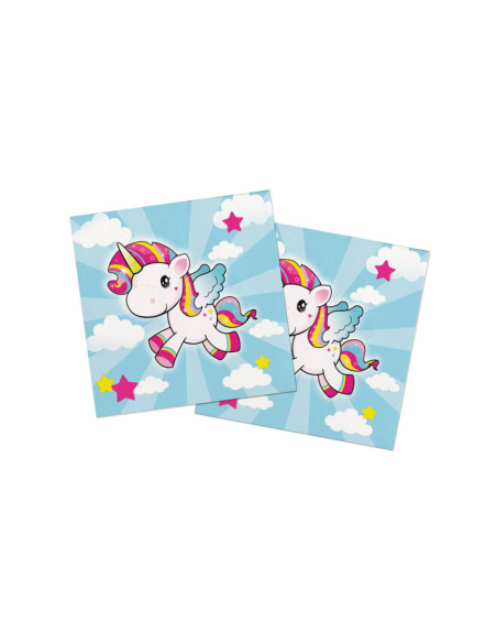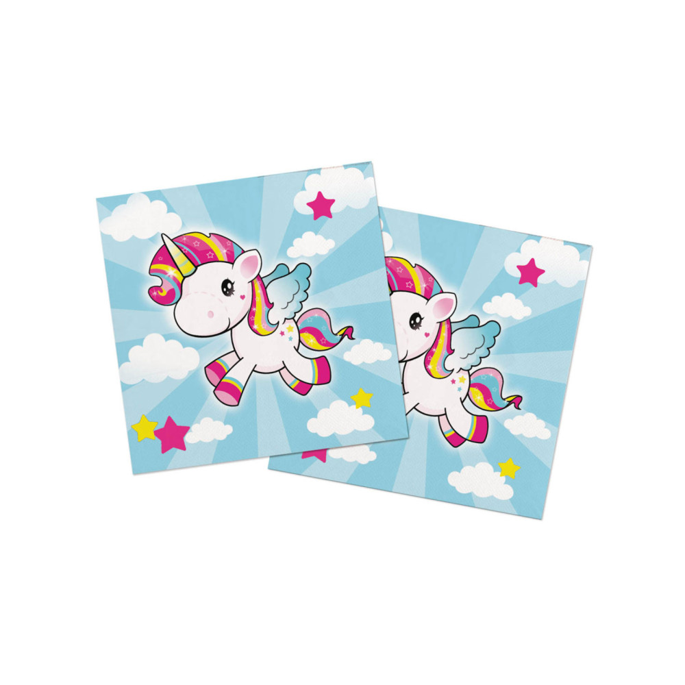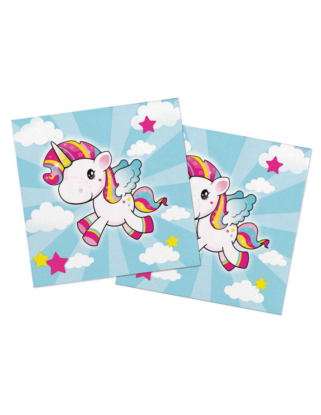 Maak je sprookjesfeest compleet met deze vrolijke servetten van eenhoorns. De set bevat 20 3-laags papieren servetten van 33 x 33 cm groot met een afbeelding van een eenhoorn in de wolken erop.