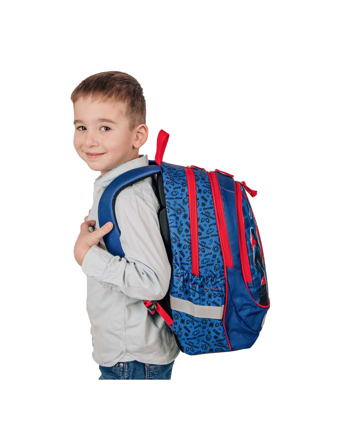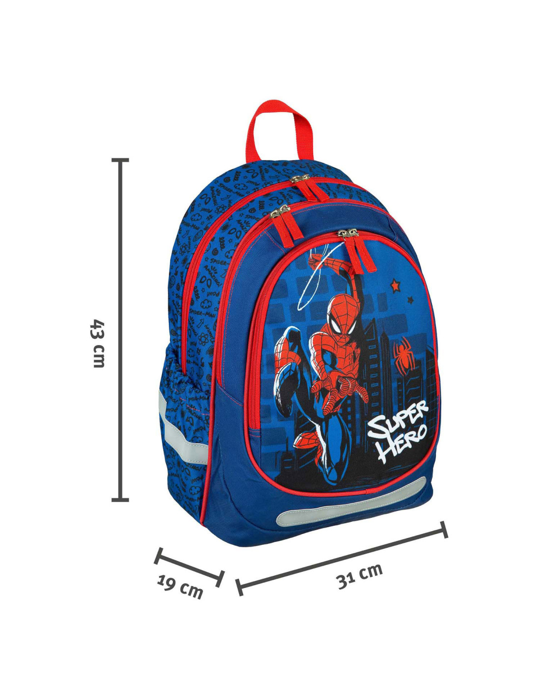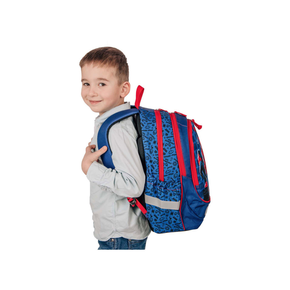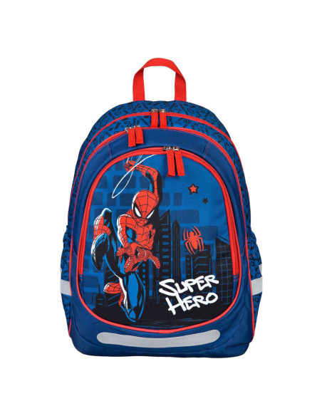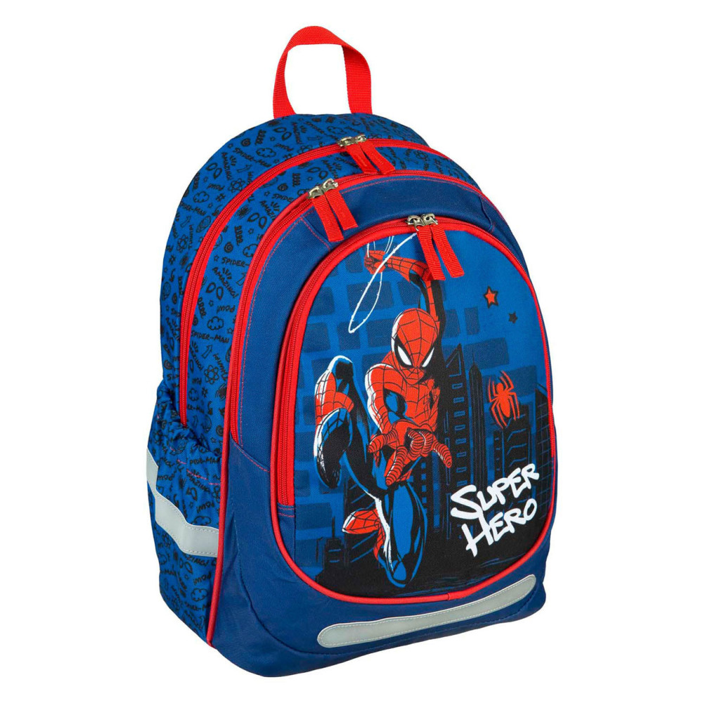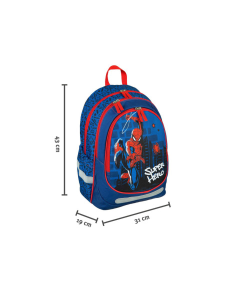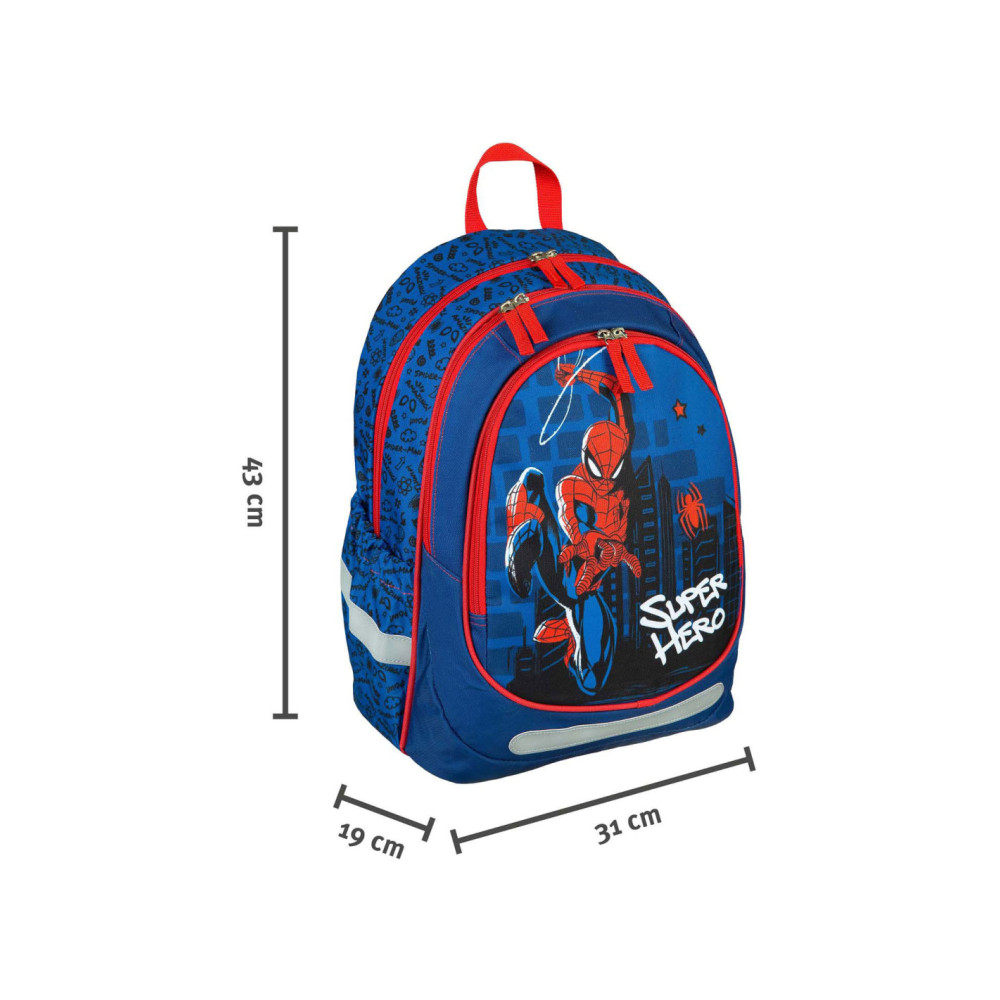 Ergonomische Schoolrugzak Spider-Man met 2 ruime hoofdvakken, 2 elastische zijvakken en voor flesjes een voorvak met ritssluiting. De tas heeft reflecterende elementen en een verstevigde bodem. Afmetingen: 43 x 31 x 19 centimeter.