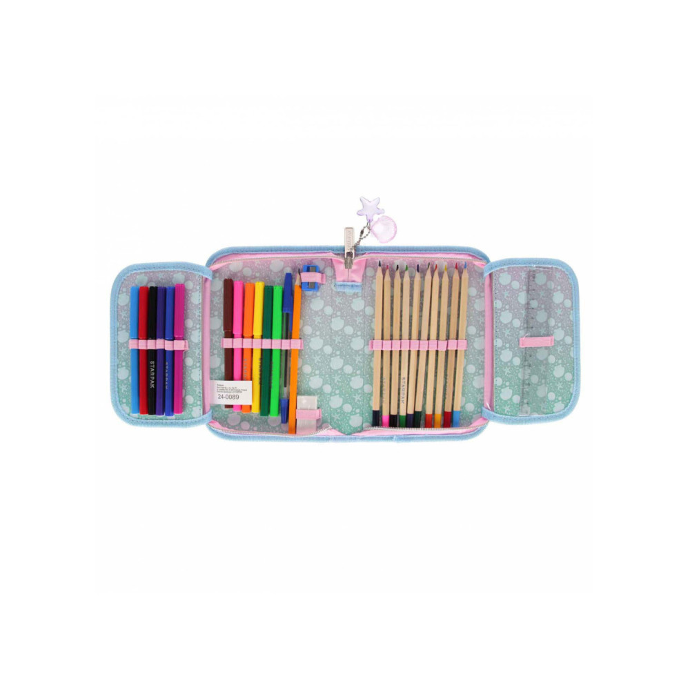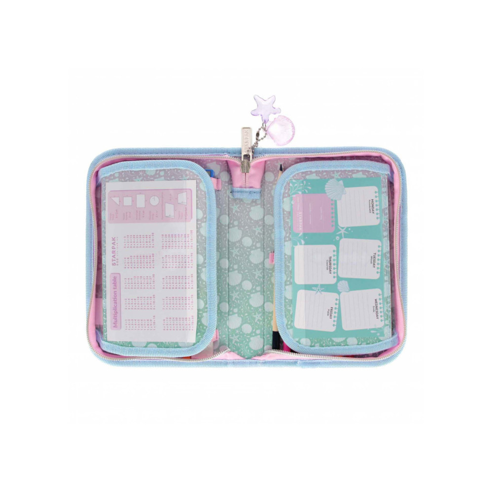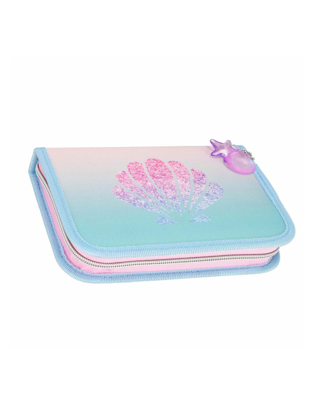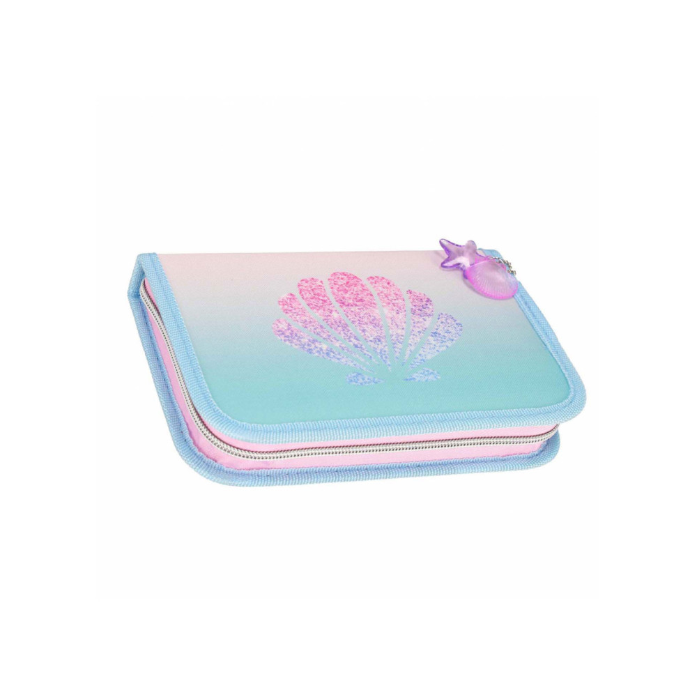 Etui met Accessoires Schelp, 25dlg. Met o.a. stiften, kleurpotloden en diverse schrijfwaren. Afmetingen: 14 x 12 x 4 centimeter.