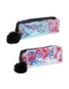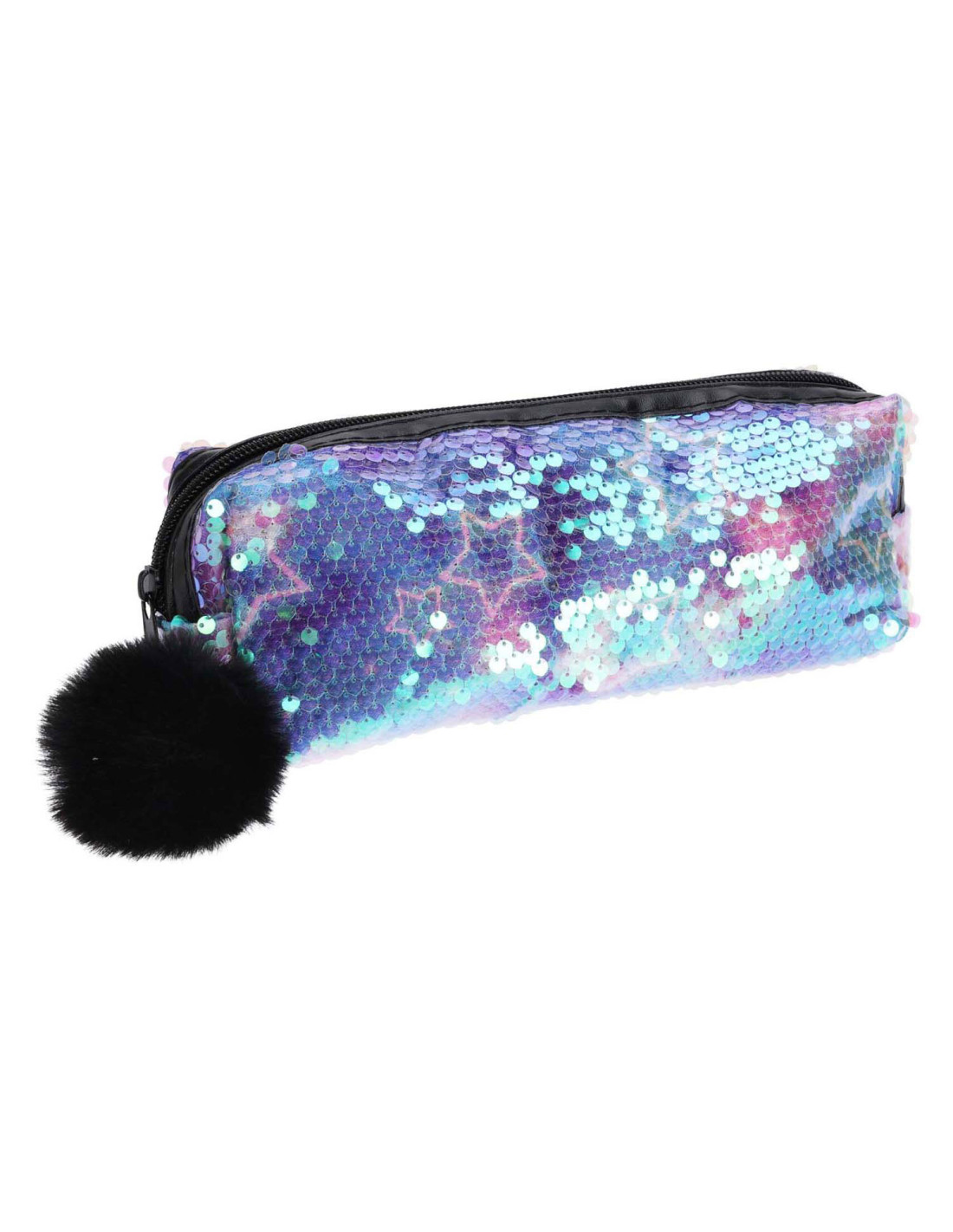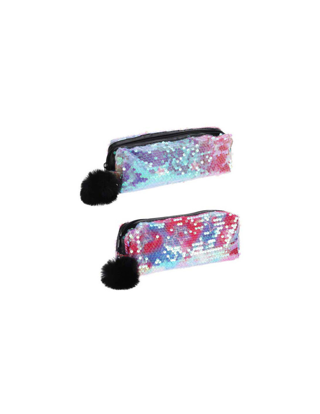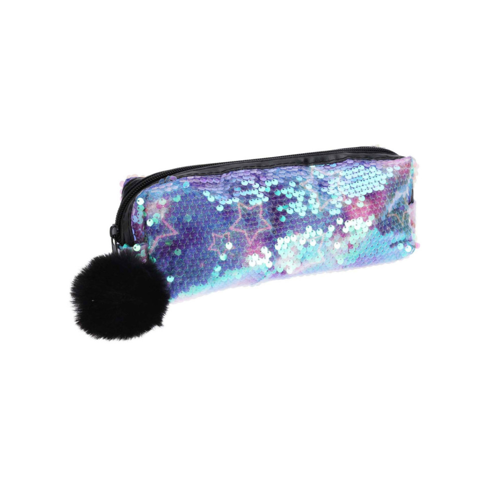 Glanzend etui met pailletten en een pompom aan de rits. Afmetingen: ca. 25 x 12 x 6 centimeter.