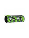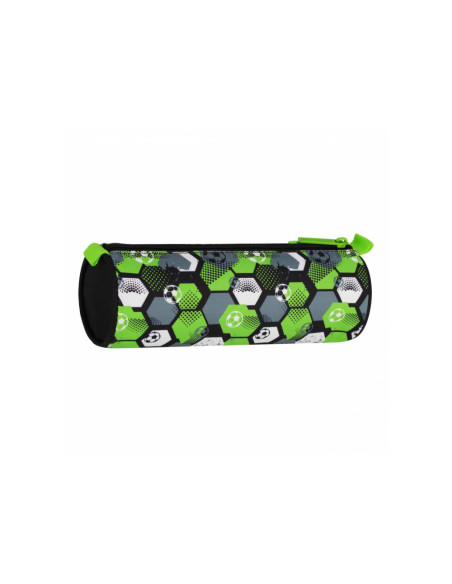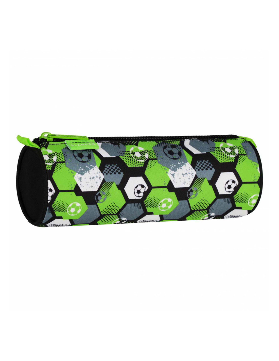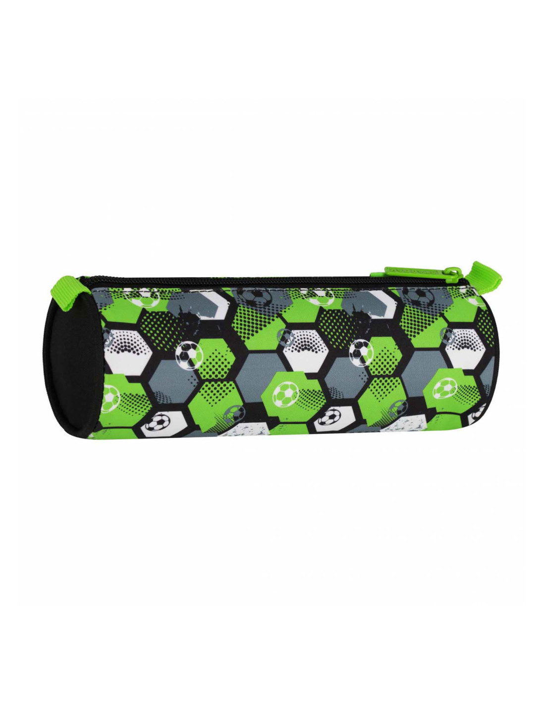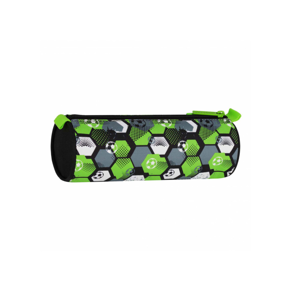Zwart kokervormig etui met voetbalprint en groene/grijze details. Afmetingen: 22 x 8 centimeter groot.