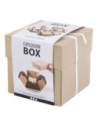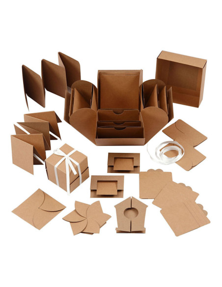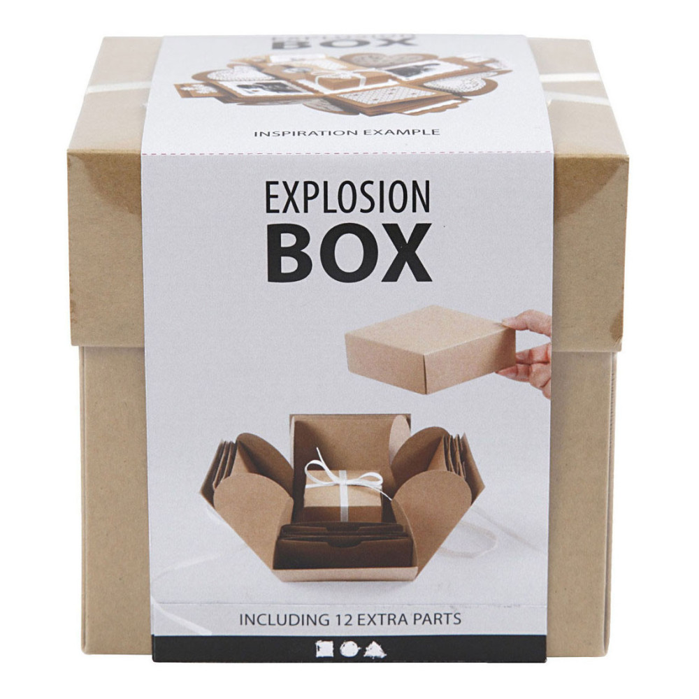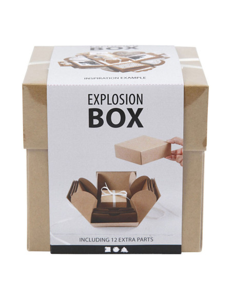 Geschenkdoos van stevig karton, dat bij opening 'explodeert' in verschillende lagen en compartimenten. De meegeleverde decoraties kun je decoreren met persoonlijke berichten, afbeeldingen, foto's enz. De box is een kaart en een cadeau in één! Bestaat uit een doos met 12 vaste vakken, 12 losse decoratie-items in 8 verschillende ontwerpen, een kleinere doos binnenin en satijnlint. Lijm / monteer decoratieve objecten voorzichtig met dubbelzijdig plakband of een lijmstift.