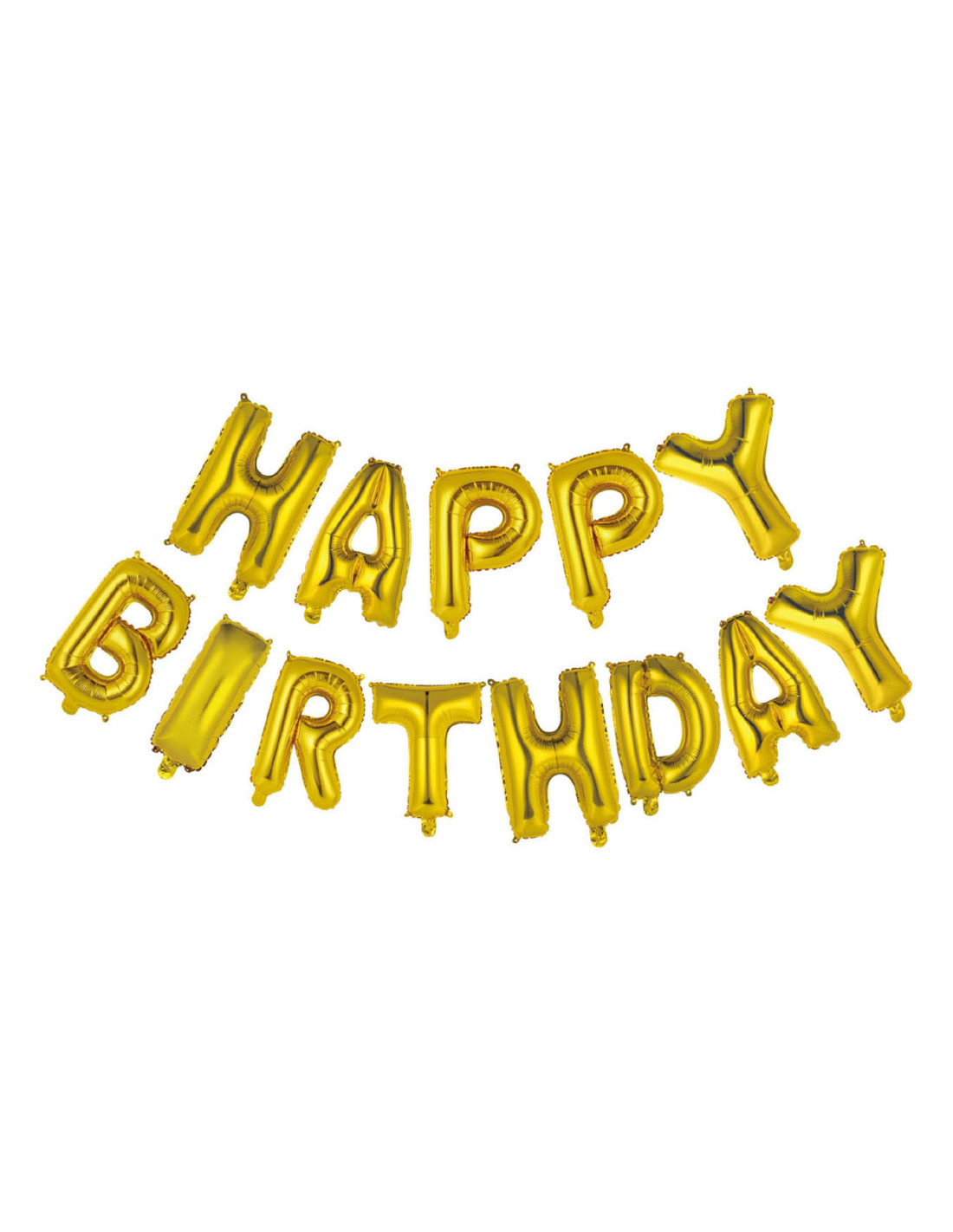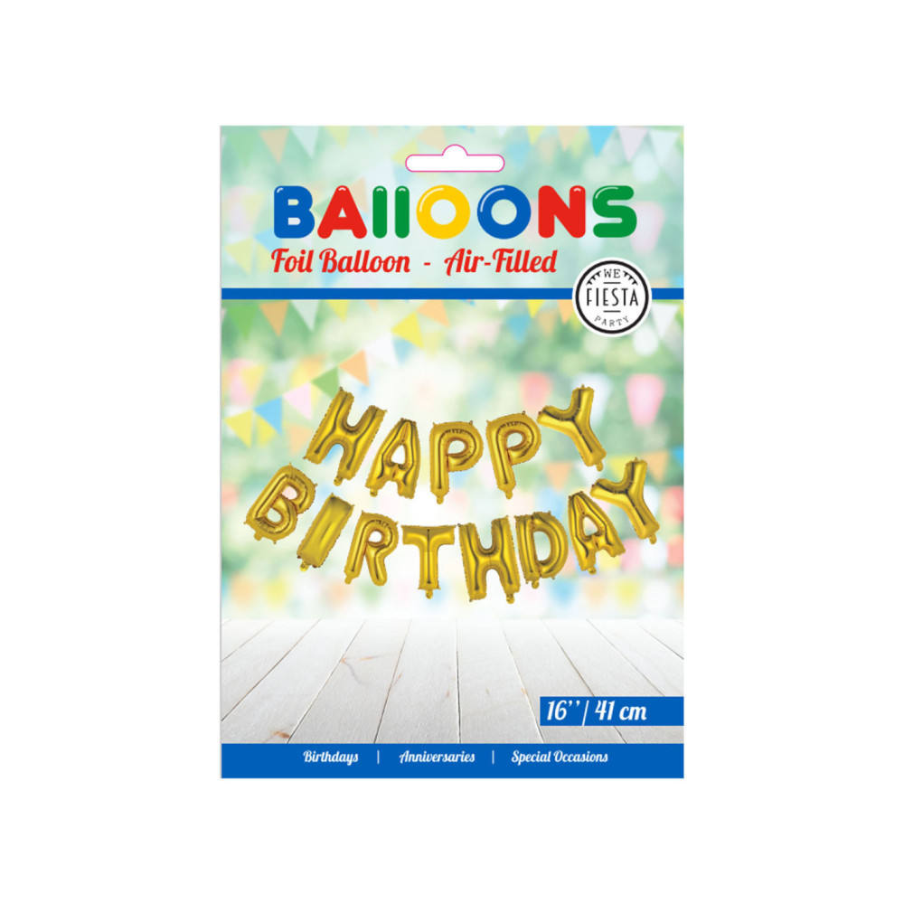 Goudkleurige folieballon letters “Happy Birthday”. Inclusief lint en rietje om op te blazen. Letters zijn 41 cm.