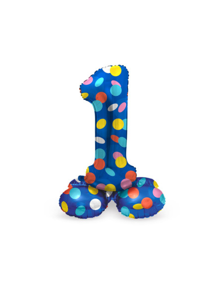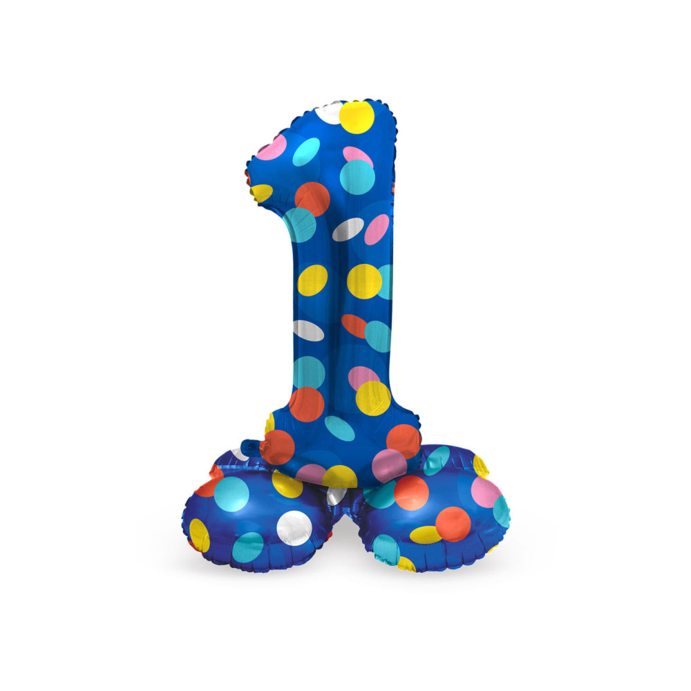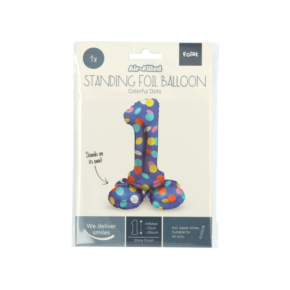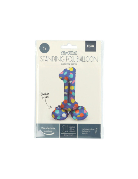 Staande Folieballon Cijfer 1 Colorful Dots - 72 cm. Inhoud: 1 folieballon. Kleur: meerkleurig. Bijvoorbeeld te gebruiken tijdens de volgende feestgelegenheid/feestgelegenheden: Verjaardag, Kinderfeestje en Themafeest. Deze folieballon is 72 cm en kan gevuld worden met lucht (geen helium nodig). Het artikel is gemaakt van folie.