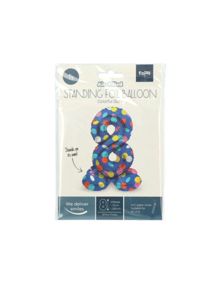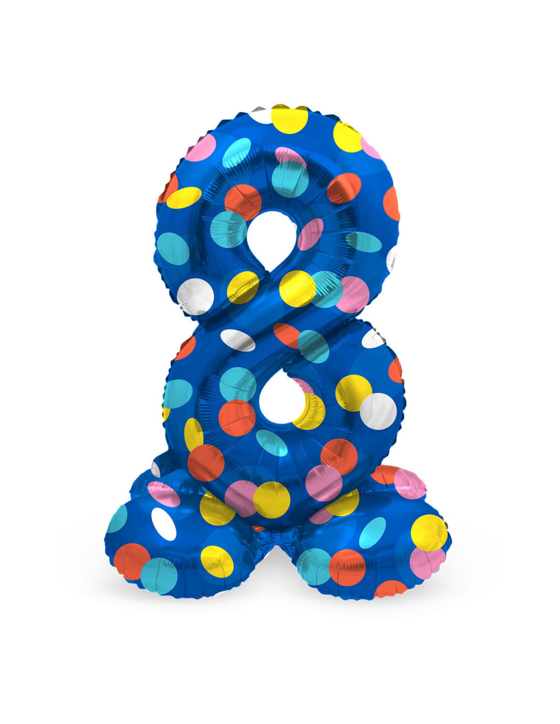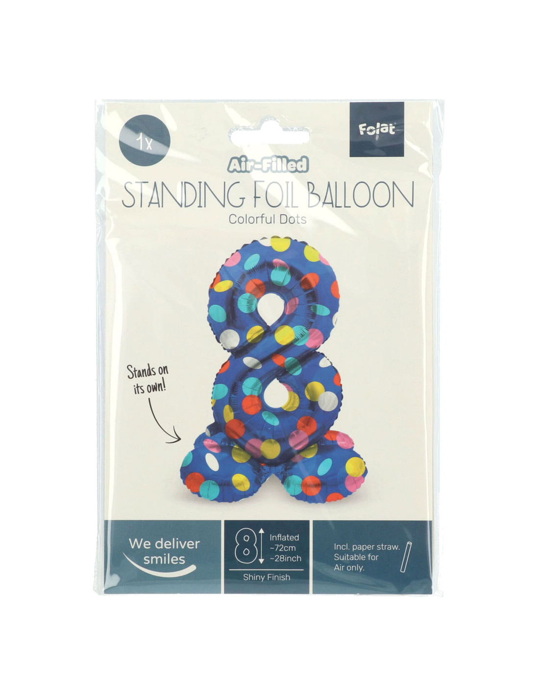 Staande Folieballon Cijfer 8 Colorful Dots - 72 cm. Inhoud: 1 folieballon. Kleur: meerkleurig. Bijvoorbeeld te gebruiken tijdens de volgende feestgelegenheid/feestgelegenheden: Verjaardag, Kinderfeestje en Themafeest. Deze folieballon is 72 cm en kan gevuld worden met lucht (geen helium nodig). Het artikel is gemaakt van folie.