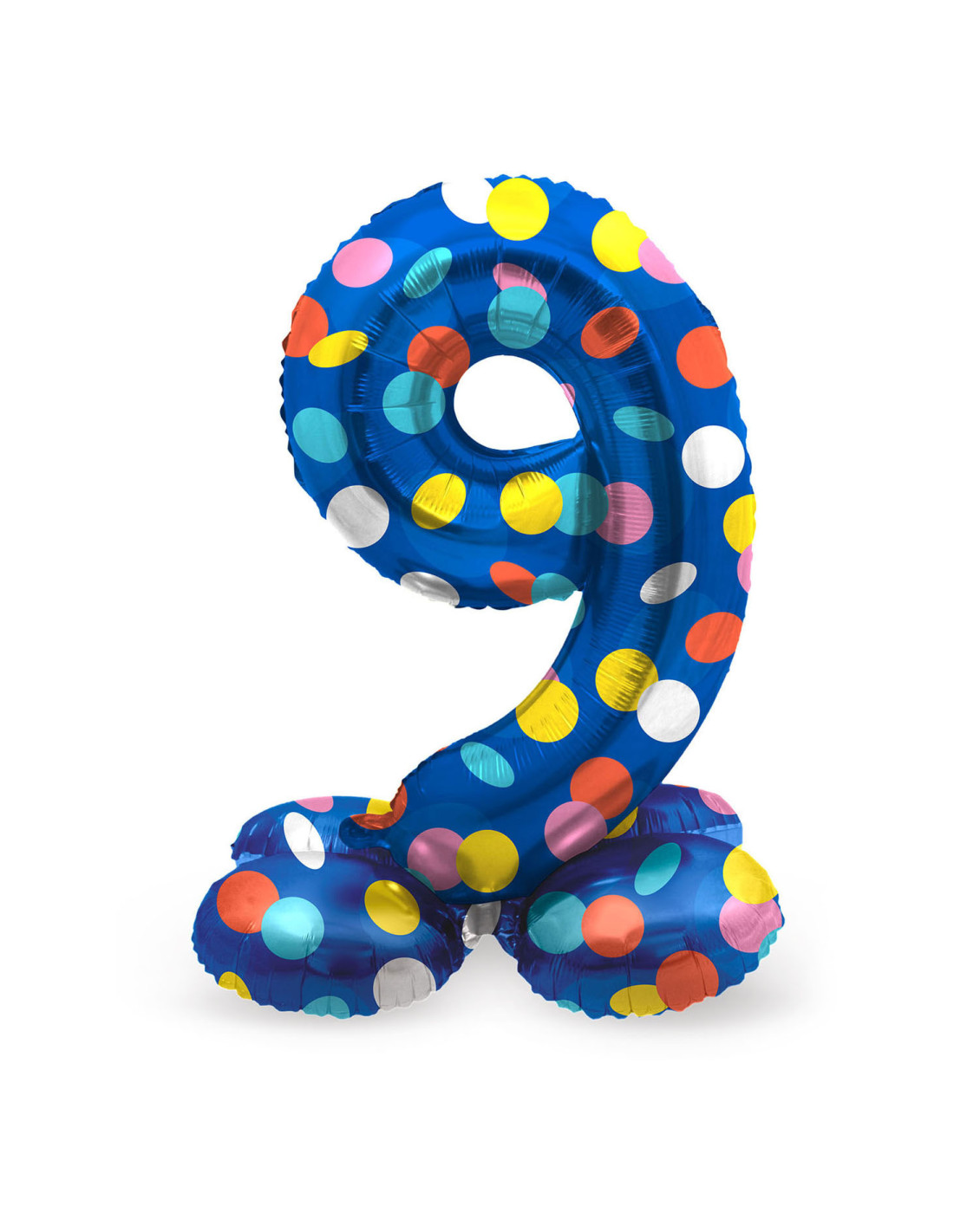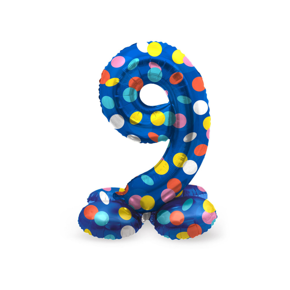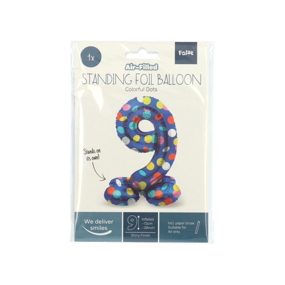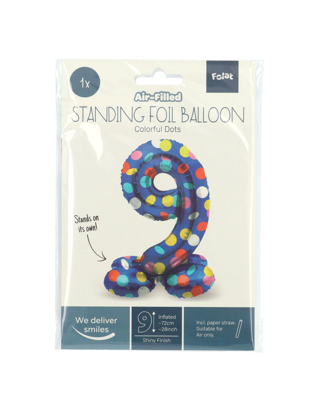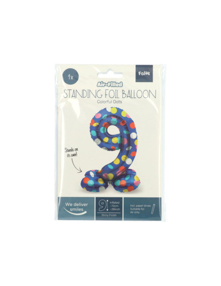 Staande Folieballon Cijfer 9 Colorful Dots - 72 cm. Inhoud: 1 folieballon. Kleur: meerkleurig. Bijvoorbeeld te gebruiken tijdens de volgende feestgelegenheid/feestgelegenheden: Verjaardag, Kinderfeestje en Themafeest. Deze folieballon is 72 cm en kan gevuld worden met lucht (geen helium nodig). Het artikel is gemaakt van folie.
