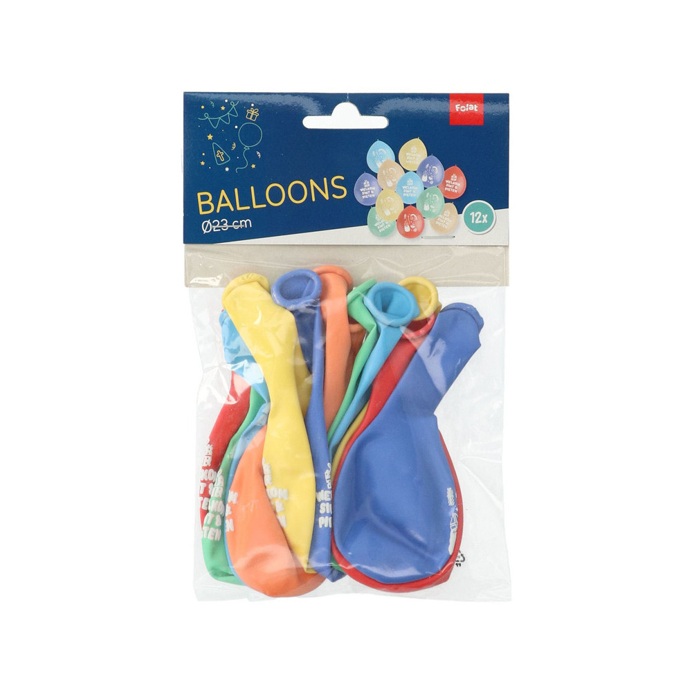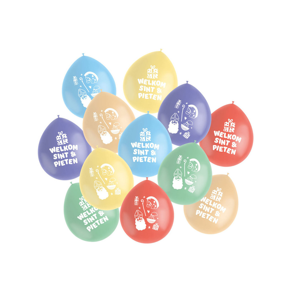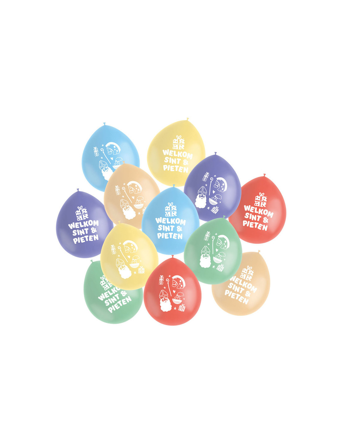 Sinterklaas is jarig! Met deze latex ballonnen voelt Sinterklaas zich helemaal jarig én welkom. In één verpakking zitten 12 ballonnen in de kleuren geel, oranje, rood, lichtblauw, paars en groen. Er zijn twee varianten van elke kleur: eentje met de tekst "Welkom Sint en Pieten" en de andere met Sinterklaasfiguren. De ballonnen zijn aan één kant bedrukt. Dit artikel is gemaakt van latex.