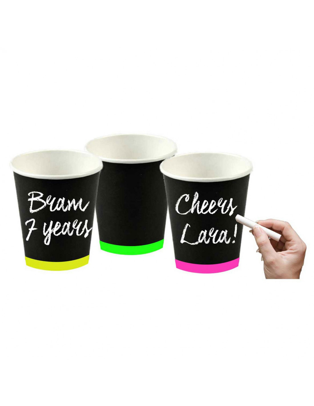 Deze bekers zullen een echte hit zijn op elk feestje. De bekers zijn zwart van kleur en hebben aan de onderkant een neonkleurig randje. Het leuke aan deze bekers is dat je ze kunt beschrijven met een krijtje. Zo kan je markeren van wie de beker is of schrijf er een leuke boodschap op. De bekers worden per 6 stuks geleverd, exclusief krijtje.