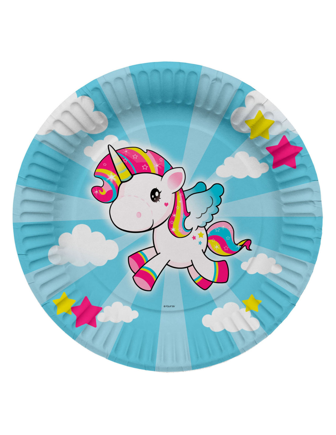 Deze set bevat 8 stuks van de kleurrijke Eenhoorn borden met een diameter van 23 cm. Perfect voor verschillende feestelijke gelegenheden zoals verjaardagen en kinderfeestjes. Elk bord is gemaakt van FSC®-gecertificeerd papier, wat betekent dat het afkomstig is uit verantwoord beheerde bossen. Met deze borden voeg je een vleugje magie toe aan elke feesttafel.