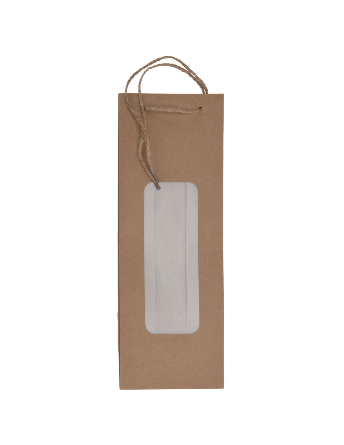 Kartonnen 'kraftlook' cadeautas voor een fles, bijv. wijn. De geschenkzak heeft een transparant venster en een juten touw als sluiting. Afmetingen: 12,5 x 9 x 35 centimeter.