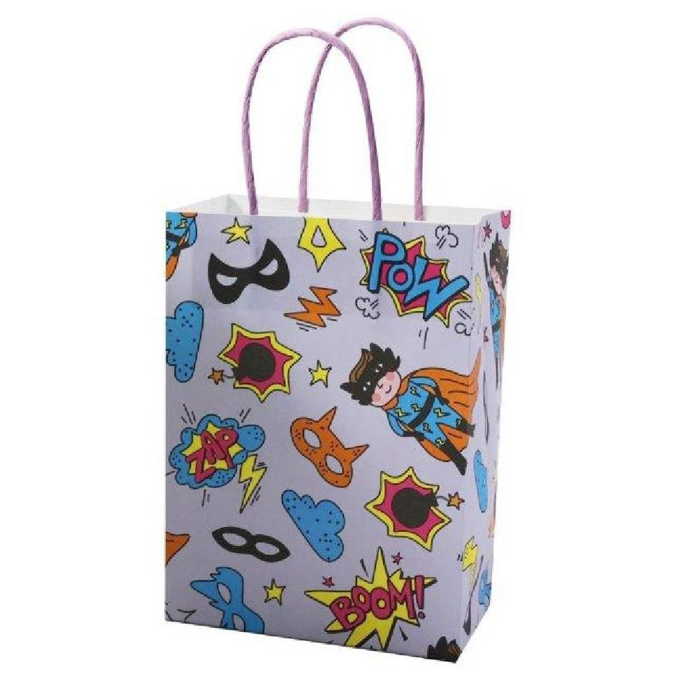 Geef je cadeau een epische uitstraling met dit geschenktasje van papier in superhelden thema. Dit stoere tasje is de perfecte manier om een cadeau te presenteren voor elke jonge superheld of comic-liefhebber. Het tasje heeft een krachtig ontwerp met iconen die direct doen denken aan je favoriete superhelden en avonturen, waardoor het de perfecte verpakking is voor een onvergetelijke gift.