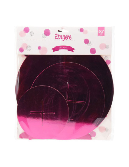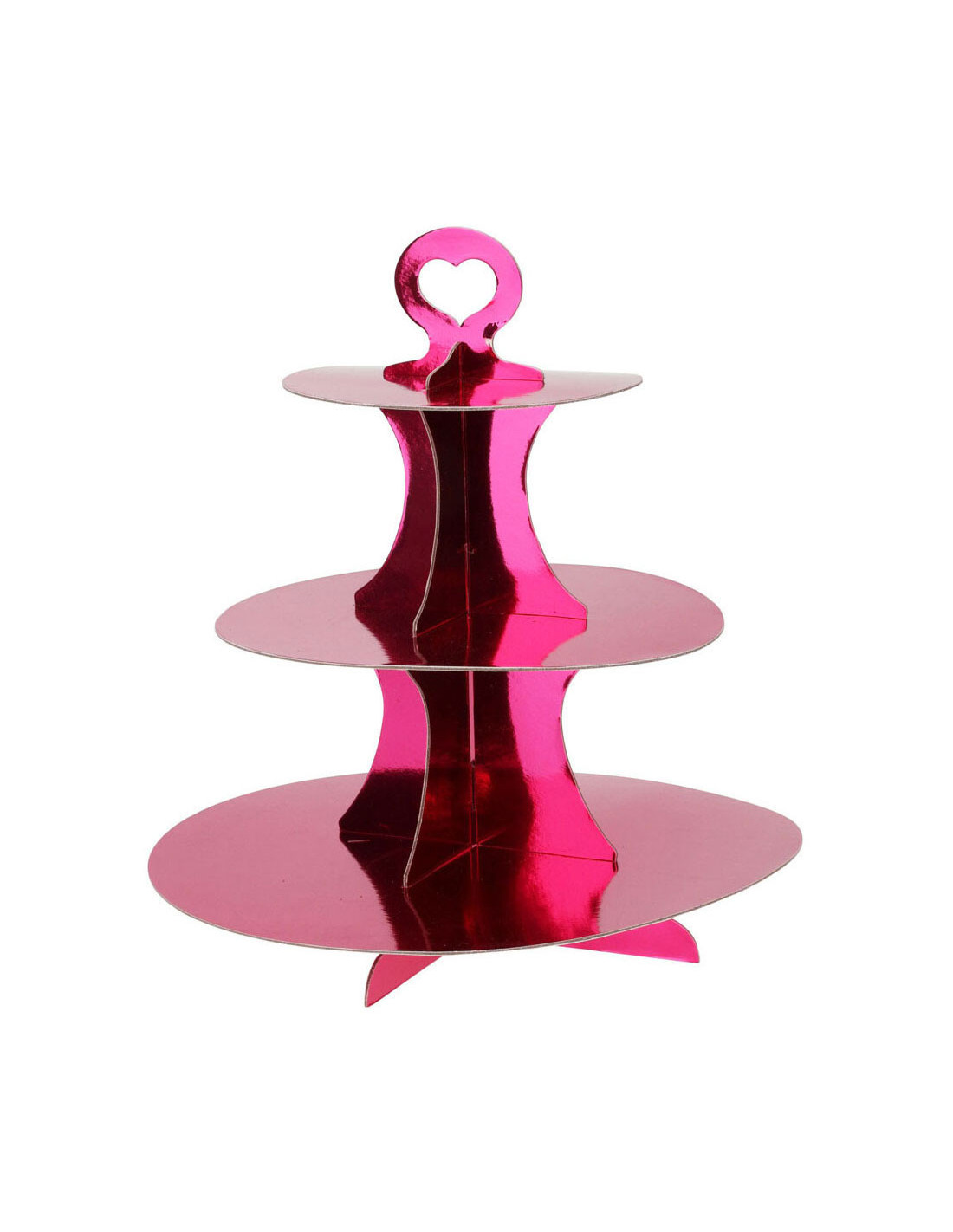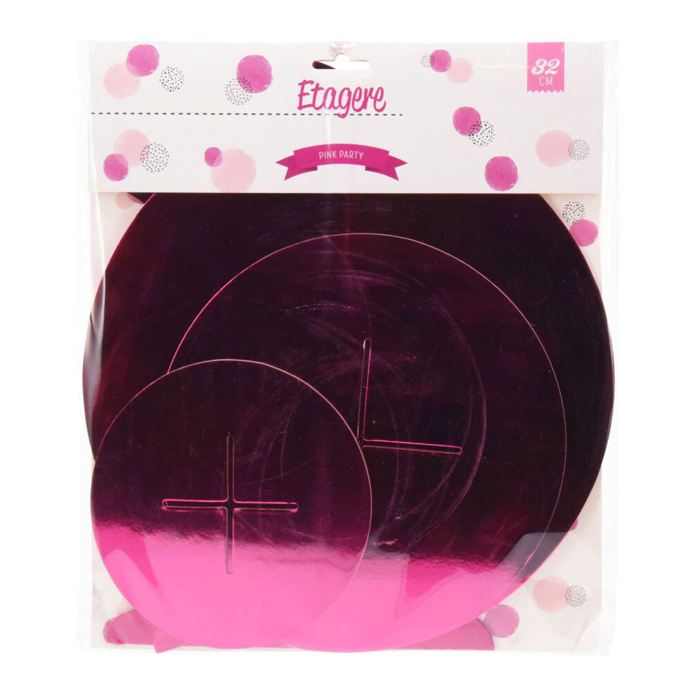 Metallic roze etagere met 3 lagen. De etagere is gemaakt van stevig karton en makkelijk te monteren en demonteren. De onderste laag heeft een diameter van 30 cm, de middelste een diameter van 25 cm en de bovenste een diameter van 15 cm. De hoogte van de etagere is 38 cm.