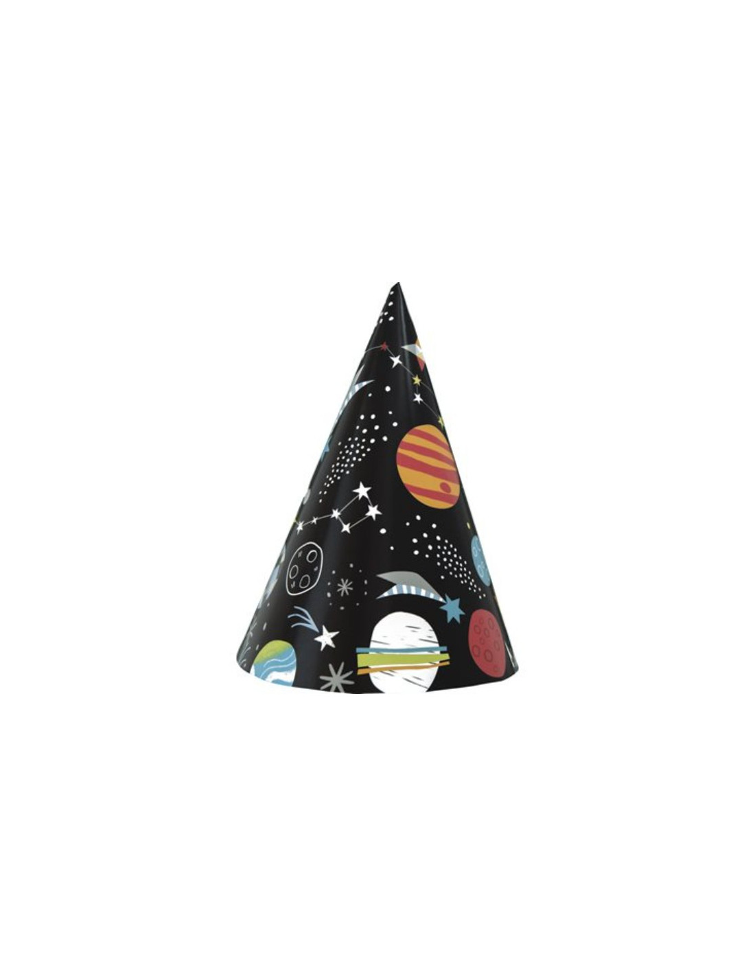 Feesthoedje met ruimte thema zorgt direct voor een vrolijke en fantasierijke sfeer tijdens ieder feestje. Zwarte achtergrond met kleurrijke planeten, sterren en ruimtesymbolen geeft een speels en opvallend effect dat perfect past bij een themafeest, verjaardag of verkleedmoment. Licht van gewicht en prettig om te dragen zonder te knellen, waardoor comfort behouden blijft tijdens het feest.