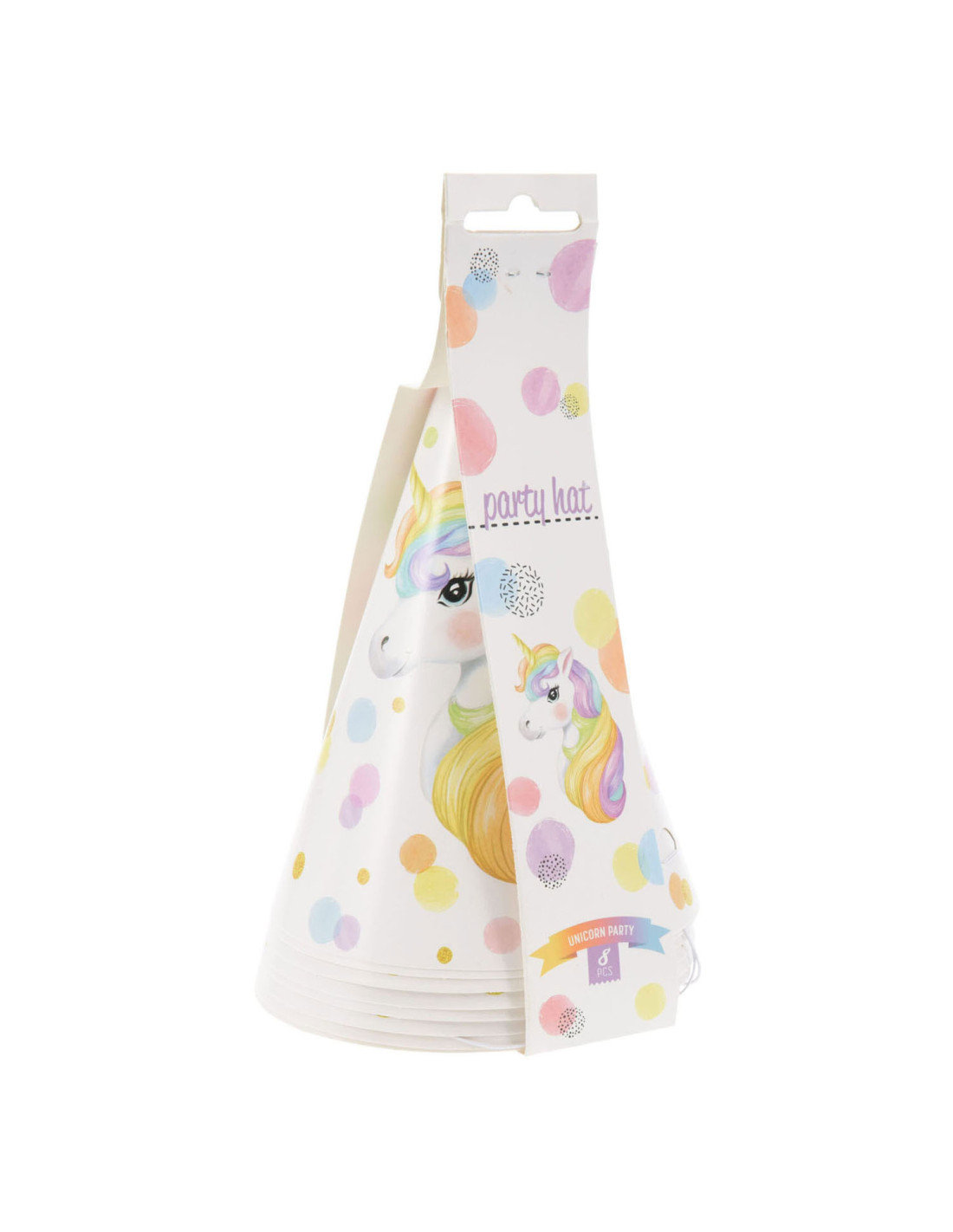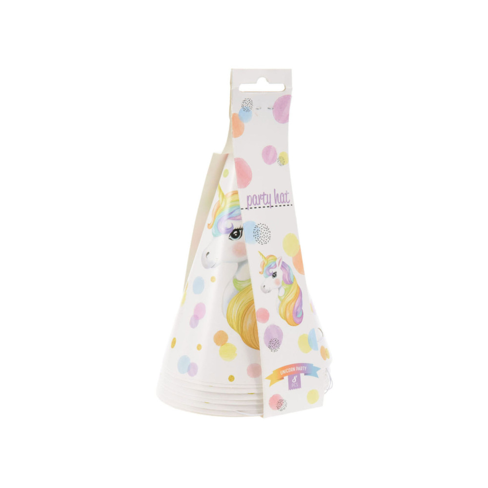 Verpakking met 8 papieren, feesthoedjes. De hoedjes zijn versierd met stippen en een afbeelding van een eenhoorn.