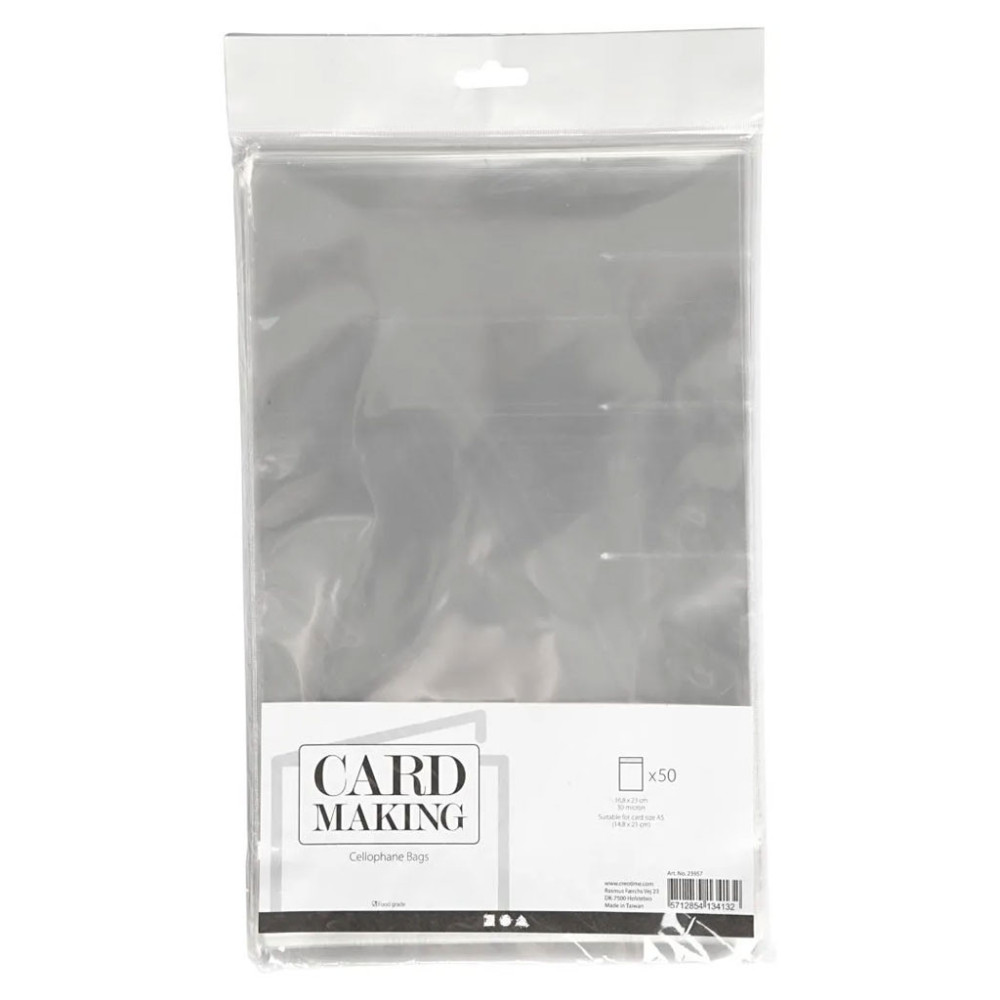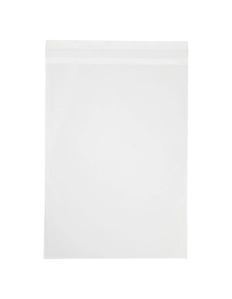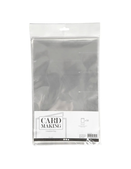 Transparante Cellofaanzakjes met een zelfklevende strip. Geschikt voor bijvoorbeeld kaarten. In de verpakking zitten 50 stuks. Geschikt voor kaarten 14,8 x 21 cm (A5). Afmetingen 23 x 16,8 cm is de buitenmaat na sluiten.