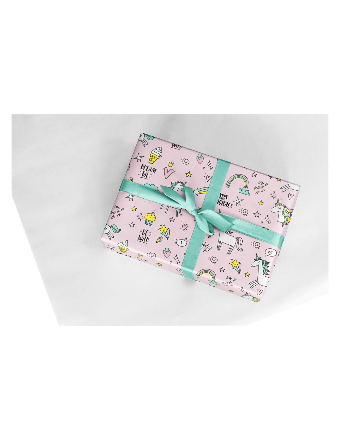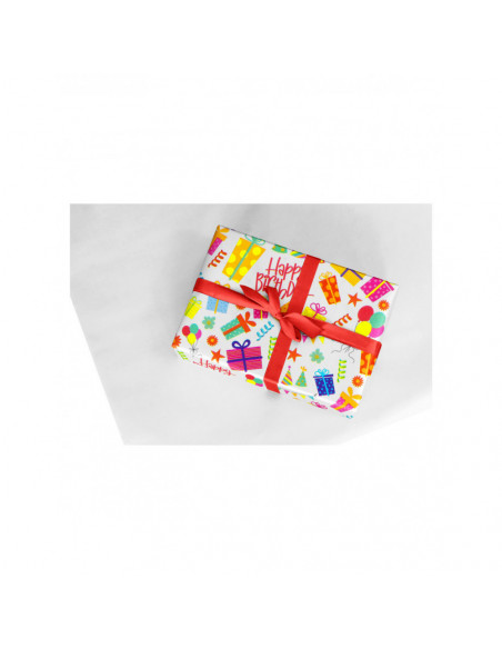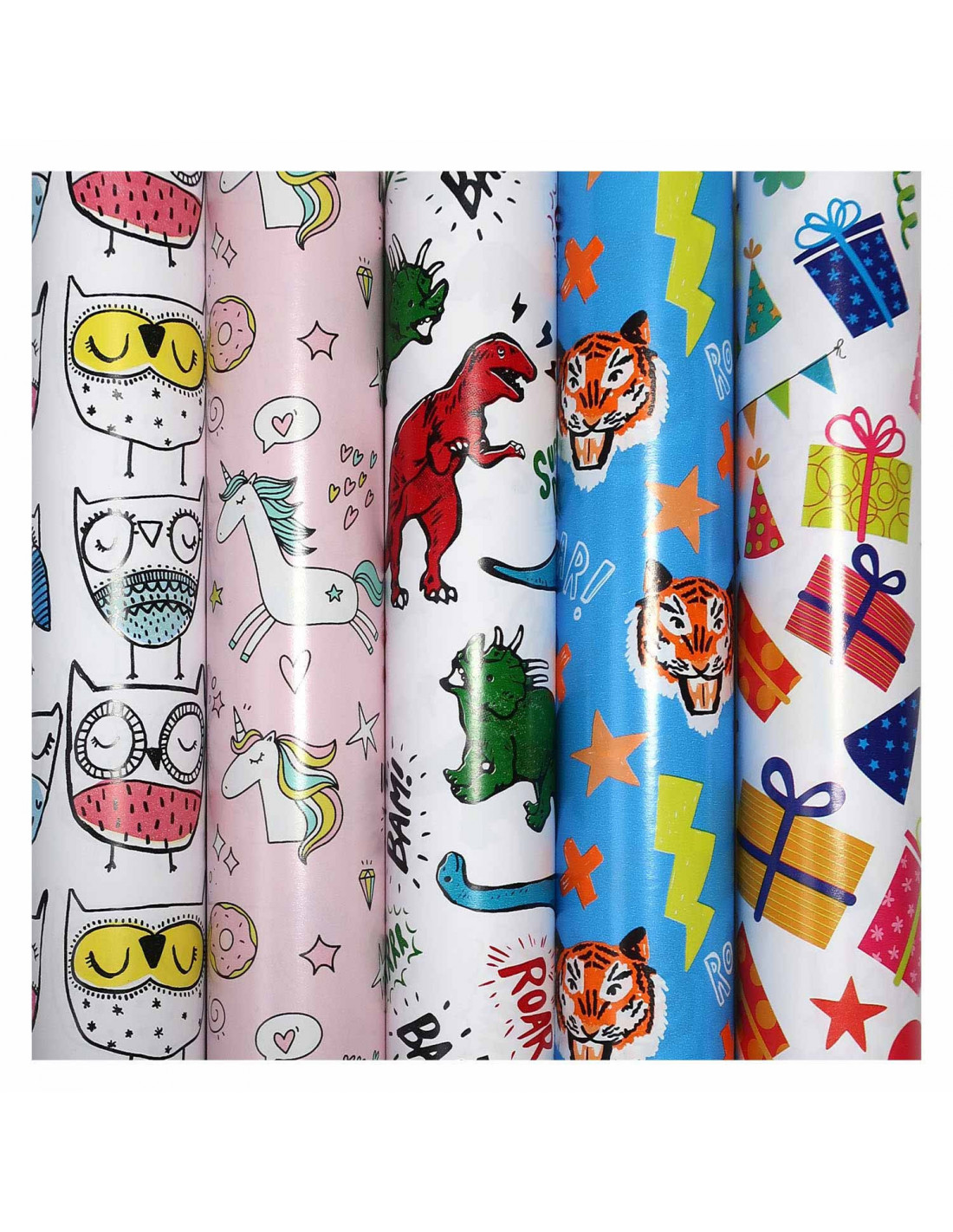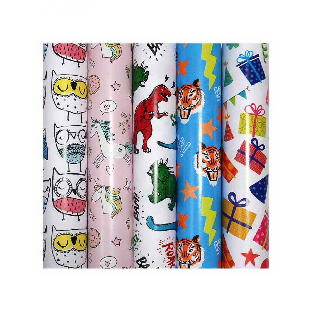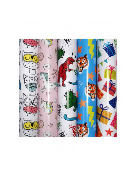 Display doos met 50 rollen inpakpapier in verschillende dessins en kinderprints. Formaat van 1 rol is 70 cm x 2 meter.