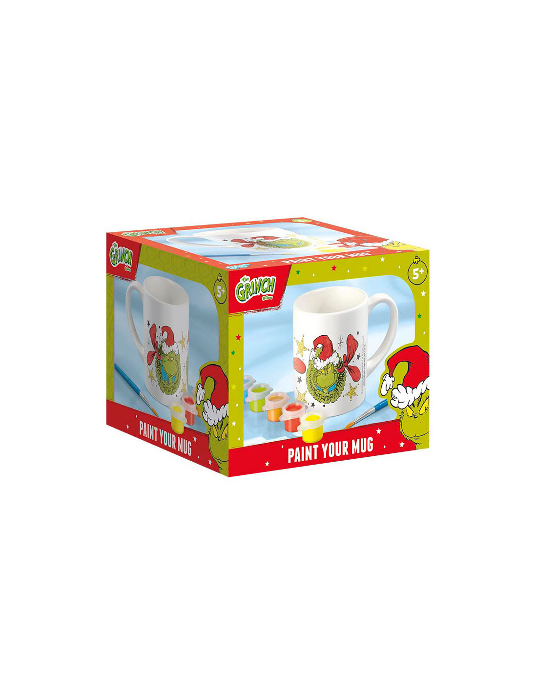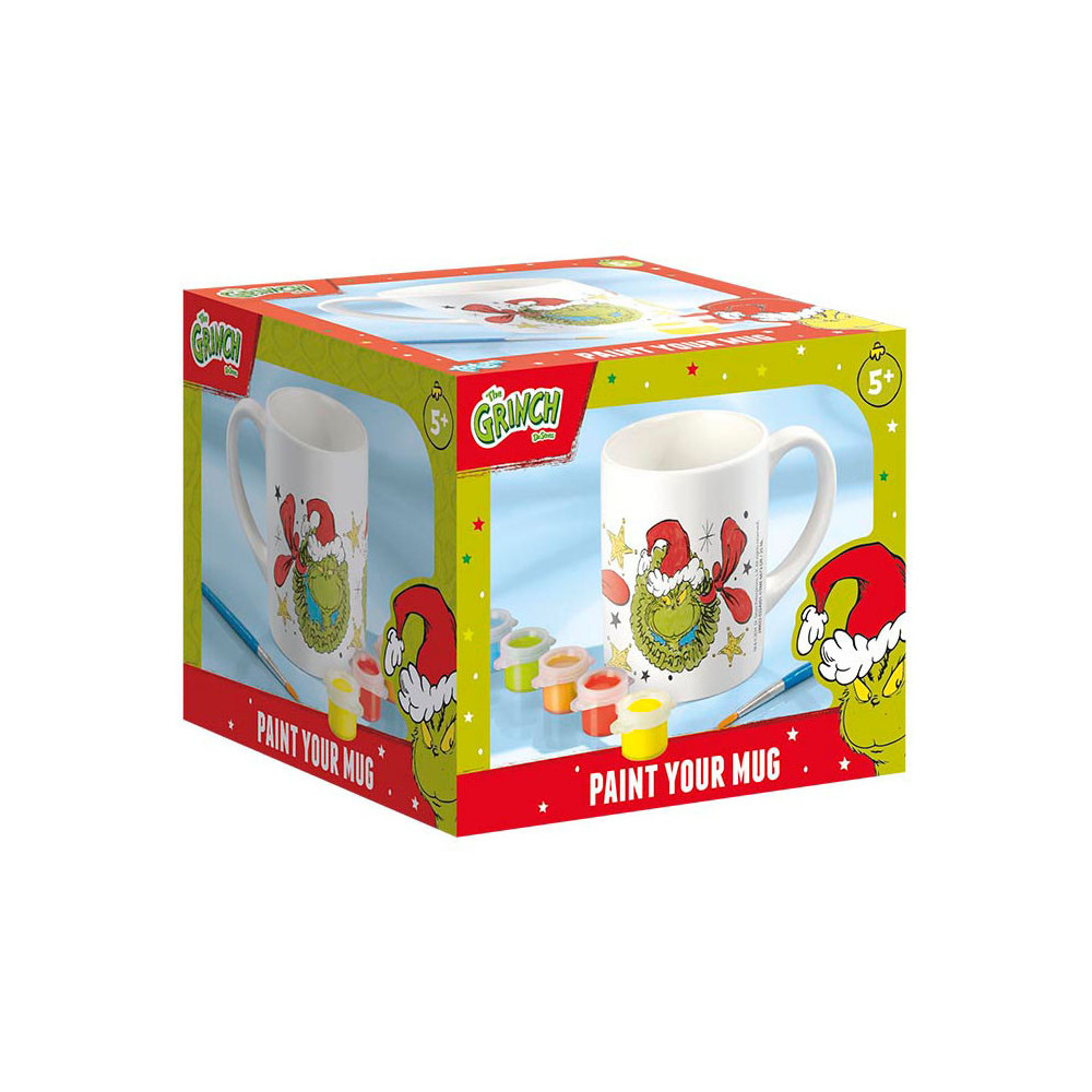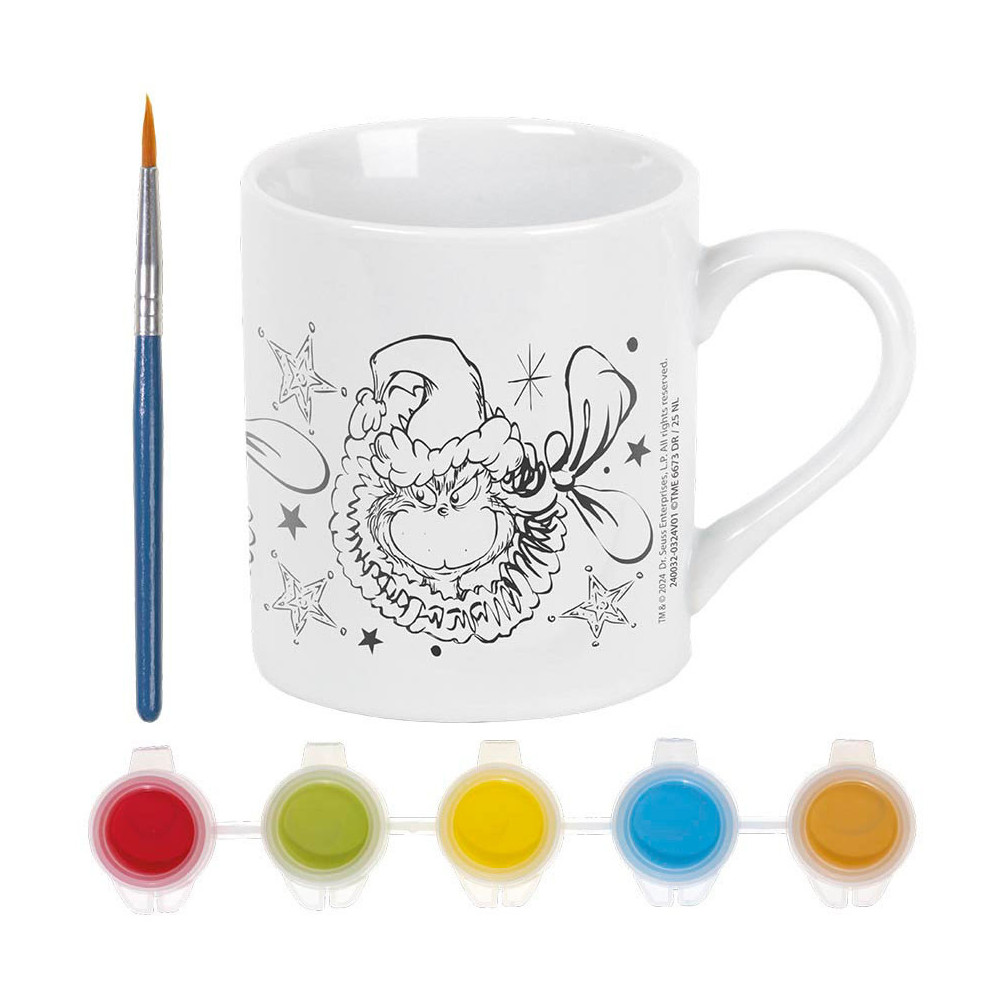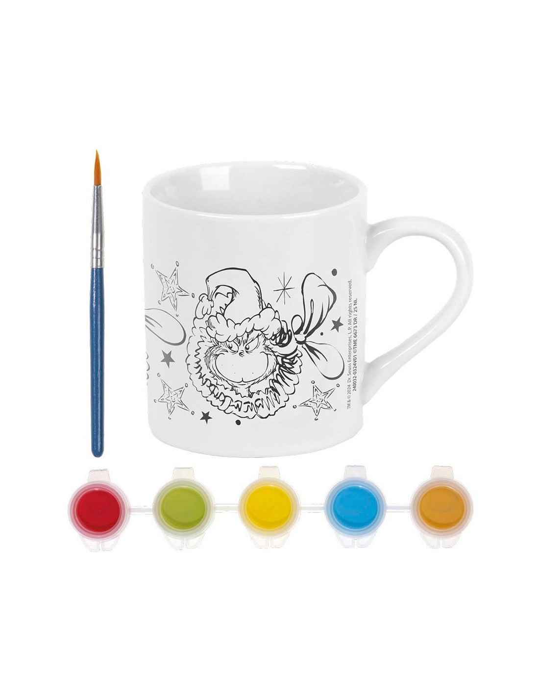 Mok met afbeelding van de Grinch die je zelf moet beschilderen. De mok is geschikt voor kinderen vanaf 5 jaar.